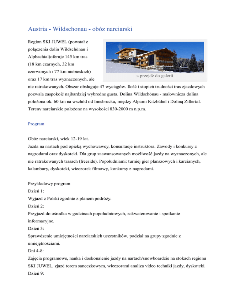 Austria - Wildschonau - obóz narciarski Region SKI JUWEL (powstał z połączenia dolin Wildschönau i Alpbachtal)oferuje 145 km tras (18 km czarnych, 32 km czerwonych i 77 km niebieskich) oraz 17 km tras wyznaczonych, ale » przejdź do galerii nie ratrakowanych. Obszar obsługuje 47 wyciągów. Ilość i stopień trudności tras zjazdowych pozwala zaspokoić najbardziej wybredne gusta. Dolina Wildschönau - malownicza dolina położona ok. 60 km na wschód od Innsbrucka, między Alpami Kitzbühel i Doliną Zillertal. Tereny narciarskie położone na wysokości 830-2000 m n.p.m. Program Obóz narciarski, wiek 12-19 lat. Jazda na nartach pod opieką wychowawcy, konsultacje instruktora. Zawody i konkursy z nagrodami oraz dyskoteki. Dla grup zaawansowanych możliwość jazdy na wyznaczonych, ale nie ratrakowanych trasach (freeride). Popołudniami: turniej gier planszowych i karcianych, kalambury, dyskoteki, wieczorek filmowy, konkursy z nagrodami. Przykładowy program Dzień 1: Wyjazd z Polski zgodnie z planem podróży. Dzień 2: Przyjazd do ośrodka w godzinach popołudniowych, zakwaterowanie i spotkanie informacyjne. Dzień 3: Sprawdzenie umiejętności narciarskich uczestników, podział na grupy zgodnie z umiejętnościami. Dni 4-8: Zajęcia programowe, nauka i doskonalenie jazdy na nartach/snowboardzie na stokach regionu SKI JUWEL, zjazd torem saneczkowym, wieczorami analiza video techniki jazdy, dyskoteki. Dzień 9: Po śniadaniu wyjazd w drogę powrotną. Dzień 10: Przyjazd do Polski. Zakwaterowanie Gasthof Almhof*** położony w Thierbach na wysokości 1175 m n.p.m., 5 km od dolnej stacji gondoli na Schatzberg 1903 m n.p.m., 8 km od kanapy na Lanerköpfl 1600m n.p.m. Restauracja, bar, sala spotkań, sala zabaw ze stołem do tenisa, sala telewizyjna, winda, ogrzewana narciarnia. Pokoje 2-,4-osobowe z łazienkami, WC i balkonami. W cenie korzystanie z krytego basenu (12x5 m). Świadczenia 7 noclegów w Gasthof Almhof*** w Thierbach. Śniadania i ciepłe obiadokolacje w hotelu. Pierwsze świadczenie: obiadokolacja w dniu przyjazdu, ostatnie: śniadanie w dniu wyjazdu + prowiant na drogę. Transport autokarem turystycznym. Ubezpieczenie: Signal Iduna. Opieka wychowawcy/instruktora. Realizacja programu. Informacje praktyczne Dla młodzieży kaski ochronne są obowiązkowe. Przy zakwaterowaniu pobierana jest kaucja 25 EUR zwracana w dniu wyjazdu, o ile nie zostały wyrządzone szkody. Ze względu na warunki atmosferyczne lub kondycję uczestników program może ulec zmianie. Cena nie obejmuje: kosztów karnetów narciarskich (ceny według załączonej tabeli), wypożyczenia sanek oraz dopłaty za transport z miast wyznaczonych w planie podróży. Konieczny paszport lub dowód osobisty. Wypożyczenie kompletu sprzętu narciarskiego/snowboardowego: 10-25 EUR na dzień. Należy zabrać: paszport lub dowód osobisty, wypełniona kartę kwalifikacyjną, nr PESEL, legitymację szkolną, zimowy krem z filtrem, strój kąpielowy. Zalecane kieszonkowe 70-100 EUR (nie zawiera opłaty za karnet). Depozyt za karnet magnetyczny 2 EUR. Przyjazd na miejsce ok godziny 16:00. Dorośli (6 dni): 222 EUR Młodzież - roczniki 1998-2000 (6 dni): 178 EUR Dzieci i młodzież - roczniki 2001-2010 (6 dni): 111 EUR First moment - zniżka 150 PLN przy zakupie do 19.12. Stały klient - dwa bilety do Cinema City gratis. Posiadacze ISIC - zniżka 50 PLN Terminy i ceny Nr grupy Austria - Wildschonau - obóz narciarski Data (skrót: WILDSCHONAU ALMHOF NARCIARSKI PAX HB) Cena ŁAWM0113 13.01 - 22.01 2149 zł 1999 zł Promocja Plan podróży Rezerwuj 10 dni ŁAWM0120 20.01 - 29.01 2149 zł 1999 zł Promocja Plan podróży Rezerwuj 10 dni ŁAWM0127 27.01 - 05.02 2149 zł 1999 zł Promocja Plan podróży Rezerwuj 10 dni ŁAWM0203 03.02 - 12.02 2149 zł 1999 zł Promocja Plan podróży Rezerwuj 10 dni ŁAWM0210 10.02 - 19.02 2149 zł 1999 zł Promocja Plan podróży Rezerwuj 10 dni ŁAWM0217 17.02 - 26.02 2149 zł 1999 zł Promocja Plan podróży Rezerwuj 10 dni