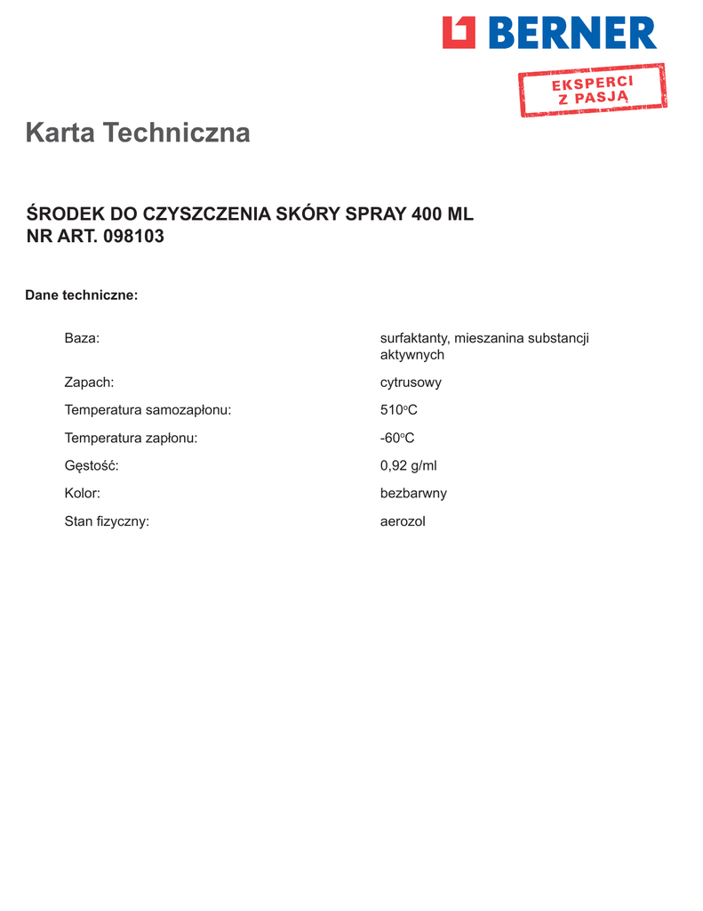 Karta Techniczna ŚRODEK DO CZYSZCZENIA SKÓRY SPRAY 400 ML NR ART. 098103 Dane techniczne: Baza: surfaktanty, mieszanina substancji aktywnych Zapach: cytrusowy Temperatura samozapłonu: 510oC Temperatura zapłonu: -60oC Gęstość: 0,92 g/ml Kolor: bezbarwny Stan fizyczny: aerozol Zastosowanie: - Do czyszczenia i konserwacji wszystkich gatunków skóry Zalety produktu: - Czyszczenie i konserwacja w jednym - Powierzchnie skórzane pozostają zakonserwowane na długi czas - Odświeża kolor - Cytrynowy zapach - Działa antystatycznie Sposób użycia: - Wstrząsnąć przed użyciem, nanieść na czyszczoną powierzchnię i pozostawić na kilka minut. Wytrzeć do sucha ściereczką Berner Micro Stretch Soft. Informacja dla użytkownika: Informacje zawarte w niniejszym dokumencie są wynikiem naszej najlepszej wiedzy, nie mogą jednak służyć jako informacje wiążące. Ponadto nie wyłączają konieczności przeprowadzenia prób i testów, które są konieczne do zastosowania danego produktu. Każdorazowo należy także sprawdzić, czy produkt odpowiada wymogom prawa. Prawa wobec osób trzecich zastrzeżone.