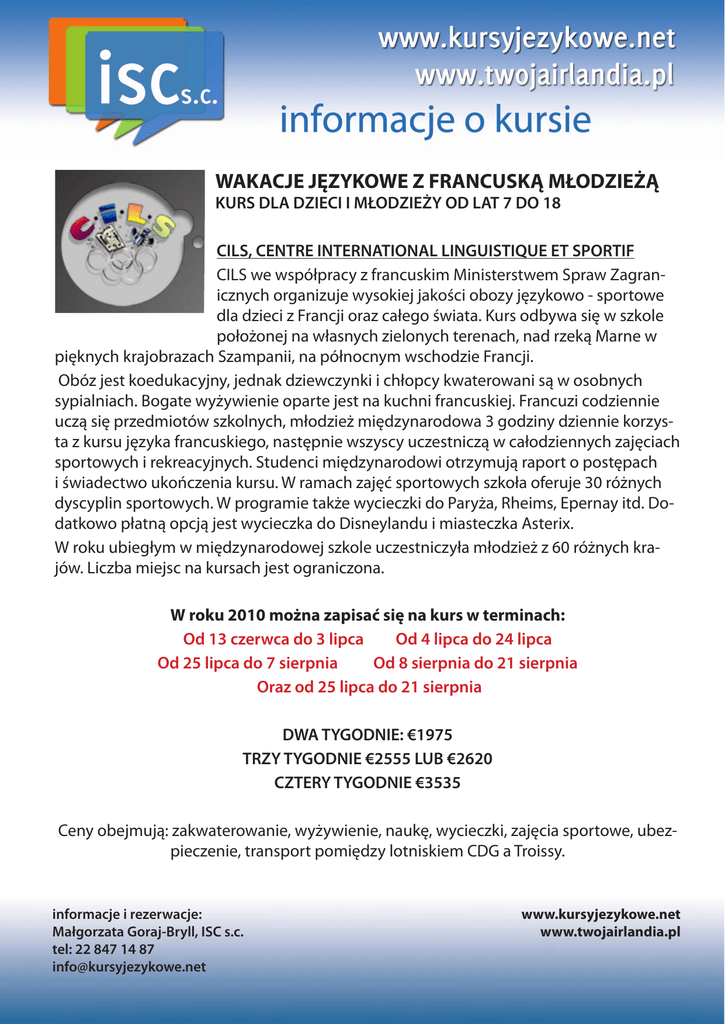 WAKACJE JĘZYKOWE Z FRANCUSKĄ MŁODZIEŻĄ KURS DLA DZIECI I MŁODZIEŻY OD LAT 7 DO 18 CILS, CENTRE INTERNATIONAL LINGUISTIQUE ET SPORTIF CILS we współpracy z francuskim Ministerstwem Spraw Zagranicznych organizuje wysokiej jakości obozy językowo - sportowe dla dzieci z Francji oraz całego świata. Kurs odbywa się w szkole położonej na własnych zielonych terenach, nad rzeką Marne w pięknych krajobrazach Szampanii, na północnym wschodzie Francji. Obóz jest koedukacyjny, jednak dziewczynki i chłopcy kwaterowani są w osobnych sypialniach. Bogate wyżywienie oparte jest na kuchni francuskiej. Francuzi codziennie uczą się przedmiotów szkolnych, młodzież międzynarodowa 3 godziny dziennie korzysta z kursu języka francuskiego, następnie wszyscy uczestniczą w całodziennych zajęciach sportowych i rekreacyjnych. Studenci międzynarodowi otrzymują raport o postępach i świadectwo ukończenia kursu. W ramach zajęć sportowych szkoła oferuje 30 różnych dyscyplin sportowych. W programie także wycieczki do Paryża, Rheims, Epernay itd. Dodatkowo płatną opcją jest wycieczka do Disneylandu i miasteczka Asterix. W roku ubiegłym w międzynarodowej szkole uczestniczyła młodzież z 60 różnych krajów. Liczba miejsc na kursach jest ograniczona. W roku 2010 można zapisać się na kurs w terminach: Od 13 czerwca do 3 lipca Od 4 lipca do 24 lipca Od 25 lipca do 7 sierpnia Od 8 sierpnia do 21 sierpnia Oraz od 25 lipca do 21 sierpnia DWA TYGODNIE: €1975 TRZY TYGODNIE €2555 LUB €2620 CZTERY TYGODNIE €3535 Ceny obejmują: zakwaterowanie, wyżywienie, naukę, wycieczki, zajęcia sportowe, ubezpieczenie, transport pomiędzy lotniskiem CDG a Troissy. informacje i rezerwacje: Małgorzata Goraj-Bryll, ISC s.c. tel: 22 847 14 87 [email protected] www.kursyjezykowe.net www.twojairlandia.pl