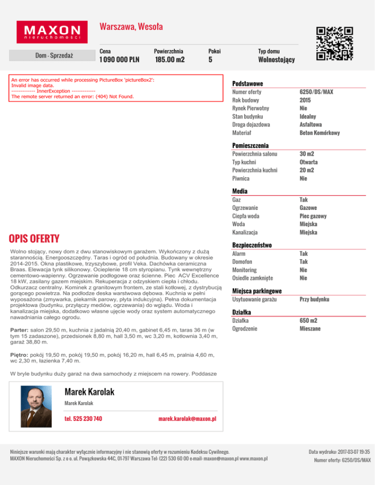 Warszawa, Wesoła Dom - Sprzedaż Cena 1 090 000 PLN Powierzchnia 185.00 m2 Pokoi Typ domu 5 An error has occurred while processing PictureBox 'pictureBox2': Invalid image data. ------------- InnerException ------------The remote server returned an error: (404) Not Found. Wolnostojący Podstawowe Numer oferty 6250/DS/MAX Rok budowy 2015 Rynek Pierwotny Nie Stan budynku Idealny Droga dojazdowa Asfaltowa Materiał Beton Komórkowy Pomieszczenia Powierzchnia salonu 30 m2 Typ kuchni Otwarta Powierzchnia kuchni 20 m2 Piwnica Nie Media OPIS OFERTY Wolno stojący, nowy dom z dwu stanowiskowym garażem. Wykończony z dużą starannością. Energooszczędny. Taras i ogród od południa. Budowany w okresie 2014-2015. Okna plastikowe, trzyszybowe, profil Veka. Dachówka ceramiczna Braas. Elewacja tynk silikonowy. Ocieplenie 18 cm styropianu. Tynk wewnętrzny cementowo-wapienny. Ogrzewanie podłogowe oraz ścienne. Piec ACV Excellence 18 kW, zasilany gazem miejskim. Rekuperacja z odzyskiem ciepła i chłodu. Odkurzacz centralny. Kominek z granitowym frontem, ze stali kotłowej, z dystrybucją gorącego powietrza. Na podłodze deska warstwowa dębowa. Kuchnia w pełni wyposażona (zmywarka, piekarnik parowy, płyta indukcyjna). Pełna dokumentacja projektowa (budynku, przyłączy mediów, ogrzewania) do wglądu. Woda i kanalizacja miejska, dodatkowo własne ujęcie wody oraz system automatycznego nawadniania całego ogrodu. Parter: salon 29,50 m, kuchnia z jadalnią 20,40 m, gabinet 6,45 m, taras 36 m (w tym 15 zadaszone), przedsionek 8,80 m, hall 3,50 m, wc 3,20 m, kotłownia 3,40 m, garaż 38,80 m. Gaz Tak Ogrzewanie Gazowe Ciepła woda Piec gazowy Woda Miejska Kanalizacja Miejska Bezpieczeństwo Alarm Tak Domofon Tak Monitoring Nie Osiedle zamknięte Nie Miejsca parkingowe Usytuowanie garażu Przy budynku Działka Działka 650 m2 Ogrodzenie Mieszane Piętro: pokój 19,50 m, pokój 19,50 m, pokój 16,20 m, hall 6,45 m, pralnia 4,60 m, wc 2,30 m, łazienka 7,40 m. W bryle budynku duży garaż na dwa samochody z miejscem na rowery. Poddasze Marek Karolak Marek Karolak tel. 525 230 740 [email protected] Niniejsze warunki mają charakter wyłącznie informacyjny i nie stanowią oferty w rozumieniu Kodeksu Cywilnego. MAXON Nieruchomości Sp. z o o. ul. Powązkowska 44C, 01-797 Warszawa Tel: (22) 530 60 00 e-mail: [email protected] www.maxon.pl Data wydruku: 2017-03-07 19:35 Numer oferty: 6250/DS/MAX