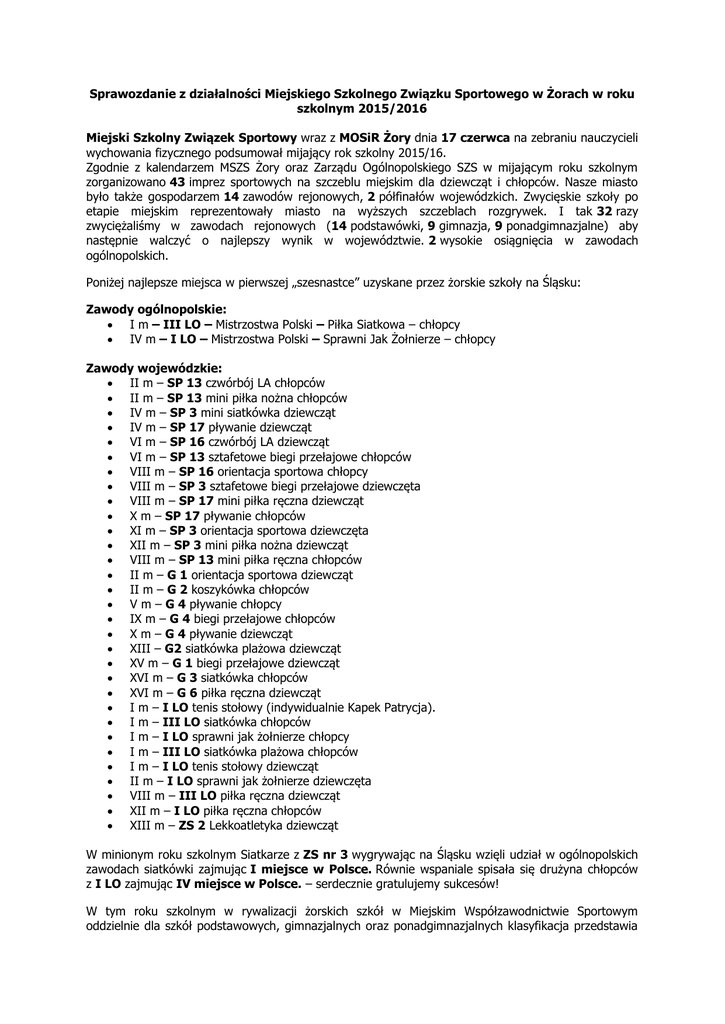 Sprawozdanie z działalności Miejskiego Szkolnego Związku Sportowego w Żorach w roku szkolnym 2015/2016 Miejski Szkolny Związek Sportowy wraz z MOSiR Żory dnia 17 czerwca na zebraniu nauczycieli wychowania fizycznego podsumował mijający rok szkolny 2015/16. Zgodnie z kalendarzem MSZS Żory oraz Zarządu Ogólnopolskiego SZS w mijającym roku szkolnym zorganizowano 43 imprez sportowych na szczeblu miejskim dla dziewcząt i chłopców. Nasze miasto było także gospodarzem 14 zawodów rejonowych, 2 półfinałów wojewódzkich. Zwycięskie szkoły po etapie miejskim reprezentowały miasto na wyższych szczeblach rozgrywek. I tak 32 razy zwyciężaliśmy w zawodach rejonowych (14 podstawówki, 9 gimnazja, 9 ponadgimnazjalne) aby następnie walczyć o najlepszy wynik w województwie. 2 wysokie osiągnięcia w zawodach ogólnopolskich. Poniżej najlepsze miejsca w pierwszej „szesnastce” uzyskane przez żorskie szkoły na Śląsku: Zawody ogólnopolskie: I m – III LO – Mistrzostwa Polski – Piłka Siatkowa – chłopcy IV m – I LO – Mistrzostwa Polski – Sprawni Jak Żołnierze – chłopcy Zawody wojewódzkie: II m – SP 13 czwórbój LA chłopców II m – SP 13 mini piłka nożna chłopców IV m – SP 3 mini siatkówka dziewcząt IV m – SP 17 pływanie dziewcząt VI m – SP 16 czwórbój LA dziewcząt VI m – SP 13 sztafetowe biegi przełajowe chłopców VIII m – SP 16 orientacja sportowa chłopcy VIII m – SP 3 sztafetowe biegi przełajowe dziewczęta VIII m – SP 17 mini piłka ręczna dziewcząt X m – SP 17 pływanie chłopców XI m – SP 3 orientacja sportowa dziewczęta XII m – SP 3 mini piłka nożna dziewcząt VIII m – SP 13 mini piłka ręczna chłopców II m – G 1 orientacja sportowa dziewcząt II m – G 2 koszykówka chłopców V m – G 4 pływanie chłopcy IX m – G 4 biegi przełajowe chłopców X m – G 4 pływanie dziewcząt XIII – G2 siatkówka plażowa dziewcząt XV m – G 1 biegi przełajowe dziewcząt XVI m – G 3 siatkówka chłopców XVI m – G 6 piłka ręczna dziewcząt I m – I LO tenis stołowy (indywidualnie Kapek Patrycja). I m – III LO siatkówka chłopców I m – I LO sprawni jak żołnierze chłopcy I m – III LO siatkówka plażowa chłopców I m – I LO tenis stołowy dziewcząt II m – I LO sprawni jak żołnierze dziewczęta VIII m – III LO piłka ręczna dziewcząt XII m – I LO piłka ręczna chłopców XIII m – ZS 2 Lekkoatletyka dziewcząt W minionym roku szkolnym Siatkarze z ZS nr 3 wygrywając na Śląsku wzięli udział w ogólnopolskich zawodach siatkówki zajmując I miejsce w Polsce. Równie wspaniale spisała się drużyna chłopców z I LO zajmując IV miejsce w Polsce. – serdecznie gratulujemy sukcesów! W tym roku szkolnym w rywalizacji żorskich szkół w Miejskim Współzawodnictwie Sportowym oddzielnie dla szkół podstawowych, gimnazjalnych oraz ponadgimnazjalnych klasyfikacja przedstawia się następująco. Najlepsze szkoły we współzawodnictwie sportowym na terenie miasta z uzyskaną liczbą punktów: Szkoły podstawowe: Miejsce 1 – Szkoła Podstawowa nr 3 (479 punktów) Miejsce 2 – Szkoła Podstawowa nr 13 (453 punkty) Miejsce 3 – Szkoła Podstawowa nr 16 (251 punkty) Gimnazja: Miejsce 1 – Gimnazjum nr 2 (398 punktów) Miejsce 2 – Gimnazjum nr 6 (396 punktów) Miejsce 3 – Gimnazjum nr 1 (377 punktów) Szkoły Ponadgimnazjalne: Miejsce 1 – Liceum Ogólnokształcące nr 1 (431 punktów) Miejsce 2 – Zespół Szkół nr 3 (396 punktów) Miejsce 3 –Zespół Szkół nr 2 (337 punktów) Zarząd Miejskiego Szkolnego Związku Sportowego w Żorach chcemy podziękować Pani Naczelnik Wydziału Edukacji i Kultury mgr Bożenie Dąbrowskiej za bardzo dobrą współpracę oraz za umożliwienie zwolnień nauczycieli wychowania fizycznego na przeprowadzone przez SZS imprezy sportowe, zebrania i szkolenia. Dziękujemy również za pomoc w uzyskaniu finansów na działalność statusową Związku. Dyrekcji Miejskiego Ośrodka Sportu i Rekreacji, kierownictwu i pracownikom hali sportowej, za współpracę, m. in. przy układaniu harmonogramu zawodów sportowych oraz udostępnienia hali dla potrzeb MSZS. Dyrektorom szkół za umożliwienie prowadzenia zajęć sportowych w ramach SKS – u oraz zwalnianie i oddelegowywanie nauczycieli na zawody, a także udostępnianie obiektów sportowy na zawody. Dziękujemy serdecznie nauczycielom przeprowadzającym poszczególne zawody, wszystkim nauczycielom wychowania fizycznego oraz pozostałym osobom, które przyczyniły się do rozwoju sportu szkolnego.