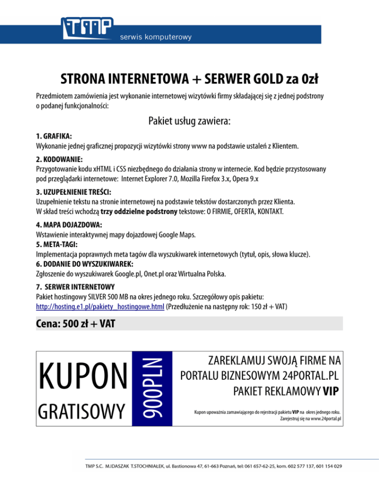 STRONA INTERNETOWA + SERWER GOLD za 0zł Przedmiotem zamówienia jest wykonanie internetowej wizytówki firmy składającej się z jednej podstrony o podanej funkcjonalności: Pakiet usług zawiera: 1. GRAFIKA: Wykonanie jednej graficznej propozycji wizytówki strony www na podstawie ustaleń z Klientem. 2. KODOWANIE: Przygotowanie kodu xHTML i CSS niezbędnego do działania strony w internecie. Kod będzie przystosowany pod przeglądarki internetowe: Internet Explorer 7.0, Mozilla Firefox 3.x, Opera 9.x 3. UZUPEŁNIENIE TREŚCI: Uzupełnienie tekstu na stronie internetowej na podstawie tekstów dostarczonych przez Klienta. W skład treści wchodzą trzy oddzielne podstrony tekstowe: O FIRMIE, OFERTA, KONTAKT. 4. MAPA DOJAZDOWA: Wstawienie interaktywnej mapy dojazdowej Google Maps. 5. META-TAGI: Implementacja poprawnych meta tagów dla wyszukiwarek internetowych (tytuł, opis, słowa klucze). 6. DODANIE DO WYSZUKIWAREK: Zgłoszenie do wyszukiwarek Google.pl, Onet.pl oraz Wirtualna Polska. 7. SERWER INTERNETOWY Pakiet hostingowy SILVER 500 MB na okres jednego roku. Szczegółowy opis pakietu: http://hosting.e1.pl/pakiety_hostingowe.html (Przedłużenie na następny rok: 150 zł + VAT) KUPON GRATISOWY 900PLN Cena: 500 zł + VAT ZAREKLAMUJ SWOJĄ FIRME NA PORTALU BIZNESOWYM 24PORTAL.PL PAKIET REKLAMOWY VIP Kupon upoważnia zamawiającego do rejestracji pakietu VIP na okres jednego roku. Zarejestruj się na www.24portal.pl