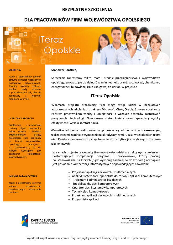 BEZPŁATNE SZKOLENIA DLA PRACOWNIKÓW FIRM WOJEWÓDZTWA OPOLSKIEGO SZKOLENIA Szanowni Państwo, Każdy z uczestników szkoleń otrzyma komplet niezbędnych materiałów szkoleniowych. Terminy i godziny realizacji szkoleń będą ustalane z pracodawcami tak, aby nie kolidowały z ważnymi zadaniami w firmie. Serdecznie zapraszamy mikro, małe i średnie przedsiębiorstwa z województwa opolskiego prowadzące działalność w m.in. jednej z branż: spożywczej, chemicznej, energetycznej, budowlanej i/lub usługowej do udziału w projekcie UCZESTNICY PROJEKTU Działaniami edukacyjnymi zostaną objęci pracownicy mikro, małych i średnich przedsiębiorstw, uczący mieszkający lub pracujący na terenie województwa opolskiego, pracujących na stanowiskach, co do których wymagane jest posiadanie kompetencji informatycznych. IMIENNE ZAŚWIADCZENIA Każdy z uczestników otrzyma imienne zaświadczenie poświadczające ukończenie szkolenia. ITeraz Opolskie W ramach projektu pracownicy firm mogą wziąć udział w bezpłatnych autoryzowanych szkoleniach z zakresu Microsoft, Cisco, Oracle Szkolenia dostarczą Państwa pracownikom wiedzy i umiejętności z ważnych obszarów zastosowań powyższych technologii. Nowoczesne metodologie szkoleń zapewniają wysoką efektywność i wysoki komfort nauki. Wszystkie szkolenia realizowane w projekcie są szkoleniami autoryzowanymi, realizowanymi zgodnie z wymaganiami akredytacyjnymi. Udział w szkoleniach ułatwi więc Państwa pracownikom przygotowanie do certyfikacji z wybranych obszarów szkoleniowych. W ramach projektu pracownicy firm mogą wziąć udział w atrakcyjnych szkoleniach dostarczających kompetencje pożądane u pracowników, którzy pracują na stanowiskach, na których (bądź wykonują zadania, co do których ) wymagane jest posiadanie kompetencji informatycznych odpowiadających zawodom: Projektant aplikacji sieciowych i multimedialnych Analityk systemowy i specjalista ds. rozwoju aplikacji komputerowych Projektant i administrator baz danych Specjalista ds. sieci komputerowych Operator sieci i systemów komputerowych Technik sieci komputerowych Projektant aplikacji sieciowych i multimedialnych Programista aplikacji Projekt jest współfinansowany przez Unię Europejską w ramach Europejskiego Funduszu Społecznego POMOC PUBLICZNA Firmy uczestniczące w projekcie otrzymują pomoc publiczną de minimis na szkolenia pracowników. Lista tematów planowanych szkoleń: MS 6421 MS 6425 MS 6292 MS 6430 DOGODNA LOKALIZACJA Szkolenia będą realizowane w ośrodkach szkoleniowych na terenie województwa opolskiego. MS 6433 MS 10775 MS 10776 MS 10135 MS 10264 Konfiguracja i rozwiązywanie problemów z infrastrukturą sieci Microsoft [MS] Windows Server Konfigurowanie i rozwiązywanie problemów usług katalogowych MS Server Instalacja, konfigurowanie klienta Windows 7 Planowanie i administrowanie serwerami Windows Server Planowanie i wdrażanie Windows Server Administrowanie bazami danych Microsoft SQL Server Wdrażanie baz danych Microsoft SQL Server Konfigurowanie zarządzanie i rozwiązywanie problemów z MS Exchange Server Programowanie aplikacji Web z MS Visual Studio CATERING Uczestnicy w trakcie ośmiogodzinnych szkoleń będą mieli zapewniony obiad oraz przerwy kawowe. Lista tematów planowanych szkoleń: ICND2 Interconnecting Cisco Network Devices Part 2 ROUTE Implementing Cisco IP Routing SWITCH Implementing Cisco IP Switched Networks Lista tematów planowanych szkoleń: KONTAKT Tel. 801 30 30 30 Fax. 58 550 95 51 e-mail: [email protected] szczegółowe informacje o projekcie: http://iteraz.eduportal.pl D64254GC1 D67234GC10 D67238GC10 Oracle Database: PL/SQL Fundamentals Java SE 7 Fundamentals Java SE 7 Programming Uczestnicy szkoleń otrzymują akredytowane materiały szkoleniowe oraz autoryzowane certyfikaty honorowane na całym świecie. Wszystkie szkolenia realizowane będą z uwzględnieniem potrzeb szkoleniowych uczestników/-czek zbadanych na etapie procesu rekrutacji. Szkolenia będą odbywać się w terminach i godzinach dostosowanych do potrzeb pracodawców i biorących udział w szkoleniach pracowników. Projekt jest współfinansowany przez Unię Europejską w ramach Europejskiego Funduszu Społecznego PRZYJAZNY HARMONOGRAM Godziny zajęć stacjonarnych zostaną dostosowane do potrzeb pracodawców i skierowanych na szkolenia pracowników. Harmonogram planowanych szkoleń będzie publikowany na portalu projektu: http://iteraz.eduportal.pl DOŚWIADCZENIE Wysoka jakość szkoleń gwarantowana jest przez ich realizatorów. COMBIDATA Poland sp. z o. o. realizująca szkolenia jest liderem rynku edukacyjnego w Polsce według rankingów Computerworld TOP 200 z kilku ostatnich lat. Krajowa Izba Gospodarcza – Projektodawca Krajowa Izba Gospodarcza jest największą niezależną organizacją biznesu w Polsce. Powstała w 1990 roku. Reprezentuje największą liczbę przedsiębiorców, łącząc ponad 150 organizacji biznesowych.Krajowa Izba Gospodarcza promuje społeczną wrażliwość biznesu. Nasze szkolenia i konferencje pomagają przedsiębiorcom wdrażać etyczne standardy. Najwrażliwsze społecznie firmy są nagradzane w programie „Przedsiębiorstwo Fair Play”. COMBIDATA Poland – Realizator Szkoleń COMBIDATA zajmuje się procesami edukacyjnymi w ich najbardziej rozwiniętej formie, tj. od analizy procesów biznesowych i określenia potrzeb kompetencyjnych, do dostarczania wiedzy i umiejętności w różnych technologiach edukacyjnych. Doświadczenia i kompetencje COMBIDATA w zakresie wszystkich stosowanych na świecie technologii edukacyjnych stawiają COMBIDATA w roli lidera na polskim rynku edukacyjnym co potwierdza ranking czasopisma „Computerworld TOP 200” w kategorii największa firma świadcząca usługi szkoleniowe w kilku ostatnich latach. COMBIDATA jest partnerem biznesowym i dostawcą rozwiązań edukacyjnych takich partnerów jak: Microsoft, Oracle, NIL, CISCO, Novell, Exin, Prometric, VUE, Audodesk, Alto