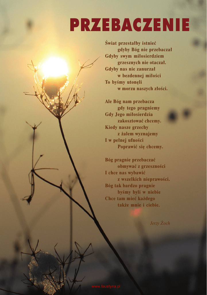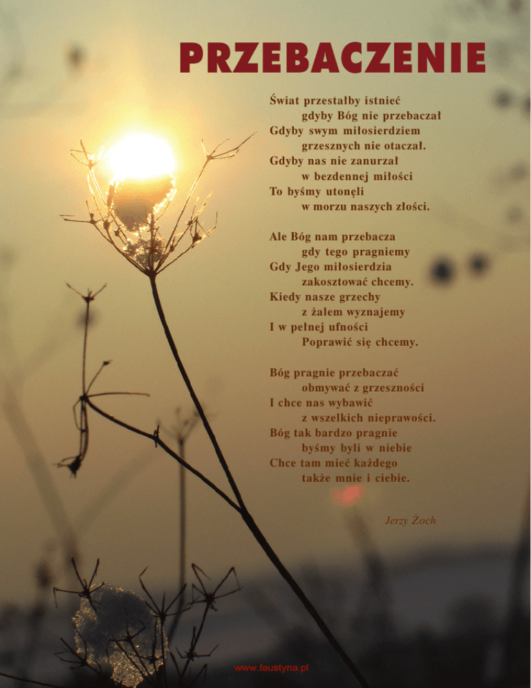 styczeń, luty, marzec 2014 19 PRZEBACZENIE Świat przestałby istnieć gdyby Bóg nie przebaczał Gdyby swym miłosierdziem grzesznych nie otaczał. Gdyby nas nie zanurzał w bezdennej miłości To byśmy utonęli w morzu naszych złości. Ale Bóg nam przebacza gdy tego pragniemy Gdy Jego miłosierdzia zakosztować chcemy. Kiedy nasze grzechy z żalem wyznajemy I w pełnej ufności Poprawić się chcemy. Bóg pragnie przebaczać obmywać z grzeszności I chce nas wybawić z wszelkich nieprawości. Bóg tak bardzo pragnie byśmy byli w niebie Chce tam mieć każdego także mnie i ciebie. Jerzy Żoch www.faustyna.pl