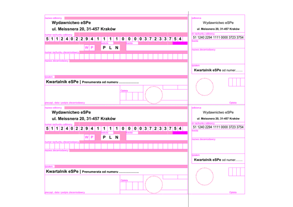 nazwa odbiorcy odbiorca Wydawnictwo eSPe Wydawnictwo eSPe ul. Meissnera 20, 31-457 Kraków ul. Meissnera 20, 31-457 Kraków nr rachunku odbiorcy numer rachunku odbiorcy 5 1 1 2 4 0 2 2 9 4 1 1 1 1 0 0 0 0 3 7 2 3 3 7 5 4 waluta W P kwota P L N 51 1240 2294 1111 0000 3723 3754 kwota nazwa zleceniodawcy numer rachunku zleceniodawcy nazwa zleceniodawcy tytułem Kwartalnik eSPe od numer……. tytułem Kwartalnik eSPe | Prenumerata od numeru ………………. Opłata pieczęć, data i podpis zleceniodawcy Opłata nazwa odbiorcy odbiorca Wydawnictwo eSPe Wydawnictwo eSPe ul. Meissnera 20, 31-457 Kraków ul. Meissnera 20, 31-457 Kraków nr rachunku odbiorcy numer rachunku odbiorcy 5 1 1 2 4 0 2 2 9 4 1 1 1 1 0 0 0 0 3 7 2 3 3 7 5 4 waluta W P kwota P L N 51 1240 2294 1111 0000 3723 3754 kwota nazwa zleceniodawcy numer rachunku zleceniodawcy nazwa zleceniodawcy tytułem Kwartalnik eSPe od numer……. tytułem Kwartalnik eSPe | Prenumerata od numeru ………………. Opłata pieczęć, data i podpis zleceniodawcy Opłata