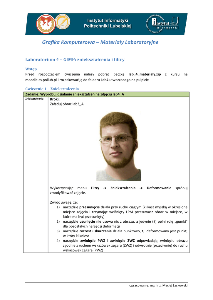 Grafika Komputerowa – Materiały Laboratoryjne Laboratorium 4 – GIMP: zniekształcenia i filtry Wstęp Przed rozpoczęciem ćwiczenia należy pobrać paczkę lab_4_materialy.zip moodle.cs.pollub.pl i rozpakować ją do folderu Lab4 utworzonego na pulpicie z kursu na Ćwiczenie 1 – Zniekształcenia Zadanie: Wypróbuj działanie zniekształceń na zdjęciu lab4_A Zniekształcenia Kroki: Załaduj obraz lab3_A Wykorzystując menu zmodyfikować zdjęcie. Filtry -> Zniekształcenia -> Deformowanie spróbuj Zwróć uwagę, że: 1) narzędzie przesunięcie działa przy ruchu ciągłym (klikasz myszką w określone miejsce zdjęcia i trzymając wciśnięty LPM przesuwasz obraz w miejsce, w które ma być przesunięty) 2) narzędzie usunięcie nie usuwa nic z obrazu, a jedynie (?) pełni rolę „gumki” dla pozostałych narzędzi deformacji 3) narzędzie rozrost i skurczenie działa punktowo, tj. deformowany jest punkt, w który klikniesz 4) narzędzie zwinięcie PWZ i zwinięcie ZWZ odpowiadają zwinięciu obrazu zgodnie z ruchem wskazówek zegara (ZWZ) i odwrotnie (przeciwnie) do ruchu wskazówek zegara (PWZ) opracowanie: mgr inż. Maciej Laskowski Grafika Komputerowa – Materiały laboratoryjne Zadanie 2 Przekształcenie fotografii w szkic Otwórz plik Lab3_B.jpg Zduplikuj warstwę ze zdjęciem. Następnie rozmyj zduplikowaną warstwę przy użyciu rozmycia Gaussa (Filtry -> Rozmycie - >Rozmycie Gaussa). Im większy promień rozmycia, tym grubsze będą linie w końcowym szkicu. Sugeruję użycie wartości z przedziału 5 – 8 pikseli. opracowanie: mgr inż. Maciej Laskowski Grafika Komputerowa – Materiały laboratoryjne Kolejnym krokiem jest odwrócenie kolorów (Kolory -> Inwersja). opracowanie: mgr inż. Maciej Laskowski Grafika Komputerowa – Materiały laboratoryjne Następnie zmniejsz krycie górnej warstwy do 50%. Pojawi się zarys naszego szkicu. Następnym krokiem jest scalenie warstw (pracy przycisk myszy na górnej warstwie i „Połącz w dół”). Następnie korzystając z menu Kolory - > Poziomy zmień histogram według poniższych ustawień: opracowanie: mgr inż. Maciej Laskowski Grafika Komputerowa – Materiały laboratoryjne Zostało już tylko ostateczne przekształcenie zdjęcia w szkic. Najpierw Kolory -> Desaturacja (na domyślnych ustawieniach). Następnie przy pomocy modyfikacji histogramu (patrz wyżej) przekształć zdjęcie w szkic. Przykładowe ustawienia: Wynik końcowy: opracowanie: mgr inż. Maciej Laskowski