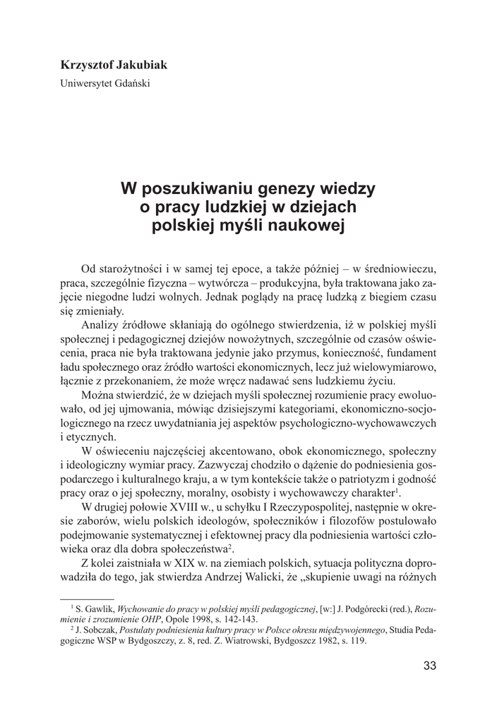 Krzysztof Jakubiak Uniwersytet Gdański W poszukiwaniu genezy wiedzy o pracy ludzkiej w dziejach polskiej myśli naukowej Od starożytności i w samej tej epoce, a także później – w średniowieczu, praca, szczególnie fizyczna – wytwórcza – produkcyjna, była traktowana jako zajęcie niegodne ludzi wolnych. Jednak poglądy na pracę ludzką z biegiem czasu się zmieniały. Analizy źródłowe skłaniają do ogólnego stwierdzenia, iż w polskiej myśli społecznej i pedagogicznej dziejów nowożytnych, szczególnie od czasów oświecenia, praca nie była traktowana jedynie jako przymus, konieczność, fundament ładu społecznego oraz źródło wartości ekonomicznych, lecz już wielowymiarowo, łącznie z przekonaniem, że może wręcz nadawać sens ludzkiemu życiu. Można stwierdzić, że w dziejach myśli społecznej rozumienie pracy ewoluowało, od jej ujmowania, mówiąc dzisiejszymi kategoriami, ekonomiczno-socjologicznego na rzecz uwydatniania jej aspektów psychologiczno-wychowawczych i etycznych. W oświeceniu najczęściej akcentowano, obok ekonomicznego, społeczny i ideologiczny wymiar pracy. Zazwyczaj chodziło o dążenie do podniesienia gospodarczego i kulturalnego kraju, a w tym kontekście także o patriotyzm i godność pracy oraz o jej społeczny, moralny, osobisty i wychowawczy charakter1. W drugiej połowie XVIII w., u schyłku I Rzeczypospolitej, następnie w okresie zaborów, wielu polskich ideologów, społeczników i filozofów postulowało podejmowanie systematycznej i efektownej pracy dla podniesienia wartości człowieka oraz dla dobra społeczeństwa2. Z kolei zaistniała w XIX w. na ziemiach polskich, sytuacja polityczna doprowadziła do tego, jak stwierdza Andrzej Walicki, że „skupienie uwagi na różnych 1 S. Gawlik, Wychowanie do pracy w polskiej myśli pedagogicznej, [w:] J. Podgórecki (red.), Rozumienie i zrozumienie OHP, Opole 1998, s. 142-143. 2 J. Sobczak, Postulaty podniesienia kultury pracy w Polsce okresu międzywojennego, Studia Pedagogiczne WSP w Bydgoszczy, z. 8, red. Z. Wiatrowski, Bydgoszcz 1982, s. 119. 33 ARTYKUŁY I ROZPRAWY formach aktywności – politycznym czynie, cywilizacyjnej, likwidującej wiekowe zacofanie pracy wytwórczej, bądź wreszcie na zewnętrznym doskonaleniu człowieka – stało się charakterystyczną i wyjątkowo trwałą, mimo pozorów braku ciągłości, tradycją myśli polskiej”3. Wraz z przemianami cywilizacyjnymi, a w ślad za nimi, zmianami w zachodniej teleologii pedagogicznej XIX w. i początkach XX w., kiedy to ideał kształcenia i wychowania praktycznego zaczął odnosić pierwsze sukcesy nad ciągle silnym ideałem kształcenia ogólnego, również w polskiej teleologii wychowawczej zaczęto powszechniej eksponować wartości pracy oraz ideały pracownika. Fakt ten sprzyjał upowszechnieniu kształcenia realnego i zawodowego. To zachodzące w pedagogice zachodniej przewartościowanie znalazło poparcie w niektórych kierunkach filozofii, zwłaszcza zaś w koncepcjach Williama Jamesa i Henriego Bergsona, przyswojonych pedagogice przez Johna Deweya. W polskich ideologiach wychowawczych, od drugiej połowy XIX w. po II Rzeczpospolitą włącznie, bez względu na ich orientację polityczną eksponowano nie tylko utylitarne, ale także etyczne wartości pracy, w ogóle postawę twórczą człowieka. Odrodzenie Polski po I wojnie światowej stało się dodatkowym impulsem do podniesienia wydajności produkcyjnej, a tym samym stworzyło grunt dla zainteresowania problemami pracy. Inspirująca i znamienna w tym kontekście była słynna mowa Józefa Piłsudskiego wygłoszona w 1919 r. w Poznaniu i jego stwierdzenie: „Idą czasy, których znamieniem będzie wyścig pracy, jak przedtem był wyścig żelaza, jak przedtem był wyścig krwi. Kto do tych zawodów bardziej przygotowany będzie, kto w tym wyścigu większe dowody wytrzymałości złoży, ten w najbliższych czasach będzie zwycięzcą”4. Wzmożony wysiłek wytwórczy był wówczas niezbędny, by Polska zaczęła się liczyć na arenie europejskiej jako naród i państwo. Środkiem realizacji tego dalekosiężnego celu stały się postulaty wychowania gospodarczego społeczeństwa, w tym głównie młodego pokolenia. W dzieło to włączyła się ogólnopolska organizacja pn. Liga Pracy (1919-1939), której statutowym zadaniem było działanie na rzecz podnoszenia w Polsce wydajności pracy i jej prawidłowej organizacji oraz szerzenie wiedzy o tayloryzmie i psychotechnice5. Nowożytne dzieje polskiej myśli pedagogicznej dowodzą, że niezależnie od nastawień ideowych, filozoficznych i politycznych poszczególnych koncepcji 3 A. Walicki, Między filozofią, religią i polityką. Studia o polskiej myśli epoki romantycznej, Warszawa 1983, s. 148. 4 J. Piłsudski, Pisma – Mowy – Rozkazy. Wydanie zbiorowe, t. V, Warszawa 1932, s. 109. 5 K. Jakubiak, Działalność organizacyjna i idee wychowawcze propagowane przez Ligę Pracy (1919-1939), Studia Pedagogiczne WSP w Bydgoszczy, z. 22, red. R. Gerlach, Z. Wiatrowski, Bydgoszcz 1993, s. 191-200. 34 Krzysztof Jakubiak, W poszukiwaniu genezy wiedzy… lub ideologii wychowawczych, we wszystkich praca była traktowana jako wartość i była składnikiem ideałów bądź wzorów wychowawczych6. Rozwój stosunków kapitalistycznych w wielu państwach Europy, żywo rozwijająca się myśl ekonomiczna, a jednocześnie dostrzegane wyraźne opóźnienie gospodarcze na ziemiach polskich inspirowały część trzeźwo myślących ziemian i mieszczan do innowacji gospodarczych czy też ulepszeń technicznych, natomiast inteligencję twórczą, zwłaszcza ekonomistów i publicystów, do upowszechniania teorii ekonomicznych, formułowania własnych propozycji rozwiązań gospodarczych i do nawoływania o „walkę” na polu gospodarczym7. W ślad za ożywieniem gospodarczym Poznańskiego, które było już widoczne w latach 40. XIX w., nieco później, bo na przełomie lat 50. i 60., także w Kró