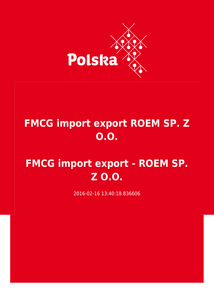 FMCG import export ROEM SP. Z O.O. FMCG import export - ROEM SP. Z O.O. 2016-02-16 13:40:18.836606 2 3 Esta oferta no constituye información comercial Adres instytucji/firmy ogłaszającej ofertę ROEM SP. Z O.O. 21-003 Ciecierzyn . ELIZÓWKA 60A . Poland Persona de contacto Justyna Puchacz [email protected] Tel: +48 504241601 www.roem.pl Descripción de la orden ROEM SP. Z O.O. company is specialized in household, cosmetics and toiletries trade. We sell only 100% original products from well known brands such as HENKEL, PROCTER & GAMBLE, KIMBERLY-KLARK, COLGATE-PALMOLIVE, BEIERSDORF, JOHNSON & JOHNSON, RECKITT BENCKISER, L’OREAL, CUSSONS, UNILEVER and many others. We can guarantee You best prices and flexible terms of cooperation. Please visit our website - www.roem.pl Additionally, please take a look on our real product's photos - https://www.flickr.com/photos/131071092@N05/sets/ Please contact us in case of any questions: Nabywcy z zagranicy ● ● ● Bułgaria Czarnogóra Czechy 4 ● ● ● ● ● ● Litwa Łotwa Mołdawia Polska Rumunia Słowacja CPV ● ● ● ● ● ● ● ● ● ● ● ● ● Equipamiento y artículos médicos, farmacéuticos y de higiene personal Productos para la higiene personal Perfumes, artículos de tocador y preservativos Champús Artículos y preparados para la higiene bucal o dental Cepillos de dientes Pasta de dientes Mobiliario (incluido el de oficina), complementos de mobiliario, aparatos electrodomésticos (excluida la iluminación) y productos de limpieza Productos de limpieza y pulido Ambientadores Desodorizadores Pastas y polvos para fregar Productos de limpieza Adjuntos PANTENE 2IN 1 LŚNIĄCY KOLOR 400ML_ROEM 7--pxc.jpg 5 COLGATE TOTAL MIX 700pxc.jpg PAMPERS BABY DRY 4 (76SZT.).jpg VANISH OXI ACTION LIQUID 1L ROEM logo..jpg FAIRY JABŁKO 1L_ROEM logo 700pxc.jpg Tipo de oferta Fecha límite para la recepción de las ofertas 30.06.2016 Válida desde 16.02.2016 Ramas Handel Wyroby chemiczne w formach podstawowych 6 Kosmetyki El comprador extranjero SÍ 7