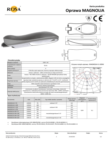 Karta produktu Oprawa MAGNOLIA Charakterystyka Napięcie zasilania 230 V, AC Częstotliwość napięcia zasilania Krzywa rozsyłu oprawy MAGNOLIA S-100W 50 Hz Klasa izolacji Stopień ochrony IP II IP 66 dla części optycznej i komory osprzętu elektrycznego Materiał korpus i pokrywa - odlew ciśnieniowy ze stopu aluminium Kolor Montaż Regulacja oprawy Klosz Odbłyśnik Oprawka Osprzęt elektryczny korpus - RAL 9006 struktura, pokrywa - SILVER RENOIR (proszkowe farby poliestrowe) bezpośrednio na słupie z zakończeniem Ø60 i długości 120 mm lub na wysięgniku regulacja kąta nachylenia oprawy w zakresie od -5° do 20° co 2,5°, możliwość pełnej regulacji od 0° do 90° po wykonaniu dodatkowych otworów gwintowanych lekko wypukła szyba hartowana o grubości 4 mm tłoczony z blachy aluminiowej porcelanowa E-27, E-40 montowany na płycie montażowej z tworzywa sztucznego, statecznik magnetyczny z zabezpieczeniem termicznym dla lamp 70W - 250W, możliwość zastosowania statecznika elektronicznego dla lamp metalohalogenkowych 100W i 150W (EL) Dane techniczne Kod Moc [W] Typ źródła światła / oprawka Waga oprawy netto [kg] MAGNOLIA S-70 220502 70 sodowe E-27 8,3 MAGNOLIA S-100 220503 100 MAGNOLIA S-150 220504 150 MAGNOLIA S-250 220505 250 10,4 MAGNOLIA MH-70 220507 70 8,3 MAGNOLIA MH-100 220508 100 MAGNOLIA MH-150 220509 150 MAGNOLIA MH-250 220510 250 Typ oprawy Objętość jednostkowa [m3] Powierzchnia boczna [m2] 0,04 0,1 8,6 sodowe-E-40 metalohalogenkowe E-27 9,3 8,5 9,2 metalohalogenkowe E-40 10,3 Dyrektywa niskonapięciowa LVD 2006/95/WE, norma PN-EN 60598-1, PN-EN 60598-2-3 Dyrektywa EMC 2004/108/WE, normy: PN-EN 55015, PN-EN 61547, PN-EN 61000-3-2, PN-EN 61000-3-3 Dane producenta Zakład Produkcji Sprzętu Oświetleniowego ROSA Stanisław Rosa 43-109 Tychy, ul. Strefowa 1, tel. +48 32 73 88 901, www.rosa.pl Edycja Data aktualizacji 2 25.06.2013 Podpis Strona 1/1
