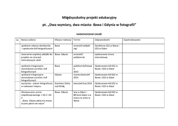 Międzyszkolny projekt edukacyjny pt. „Dwa wymiary, dwa miasta- Iława i Gdynia w fotografii” HARMONOGRAM ZADAŃ Lp. Nazwa zadania Miejsce realizacji Termin Odpowiedzialni spotkanie robocze dyrektorów Iława i opiekunów kół fotograficznych wrzesień (odbyło się) Dyrektorzy GS2 w Iławie i GS3 w Gdyni stworzenie wspólnej zakładki do projektu na stronach internetowych szkół Iława- Gdynia wrzesień/ październik opiekunowie strony internetowej spotkanie integracyjnowarsztatowe uczniów z kół fotograficznych spotkanie integracyjnowarsztatowe uczniów z kół fotograficznych wycieczka – plener fotograficzny w ciekawym miejscu Iława październik/listopa d 2013 marzec/kwiecień 2014 Opiekunowie kół GS2 w Iławie i GS3 w Gdyni Kazimierz Dolny nad Wisłą kwiecień/maj 2014 Opiekunowie kół GS2 w Iławie i GS3 w Gdyni Wystawa prac ucznia niepełnosprawnego z GS 2 i GS 3 „Iława- Gdynia jakiej nie znacie, oczami jakich nie macie” Iława- Gdynia luty w Gdyni – 88-lecie Gdyni a w marcu to samo w Iławie Opiekunowie kół GS2 w Iławie i GS3 w Gdyni Gdynia Opiekunowie kół GS2 w Iławie i GS3 w Gdyni Zapotrzebowanie 10. 11. 12. Wystawa prac uczniów kół fotograficznych „Tajemnice codzienności” Podsumowanie wspólnej działalności w roku 2013/14 3 konkursy internetowe prac uczniów z kół fotograficznych GS 2 w Iławie i GS 3 w Gdyni. Iława- Gdynia marzec 2014 Opiekunowie kół GS2 w Iławie i GS3 w Gdyni Wyjazd do Karlskrona-prom em -------- Czerwiec 2014 Opiekunowie i dyrekcja ---------------- ------------- „JESIEŃ” Strona (10 zdjęć z GS 2 Iława i 10 zdjęć internetowa GS z GS 3 Gdynia umieszczonych na 2 w Iławie stronie internetowej) „ZIMA” (10 zdjęć z GS 2 Iława i 10 zdjęć z GS 3 Gdynia umieszczonych na stronie internetowej) „WIOSNA” (10 zdjęć z GS 2 Iława i 10 zdjęć z GS 3 Gdynia umieszczonych na stronie internetowej) 1 lutego, 1 maja i 1 sierpnia 2014 r. nastąpi rozstrzygnięcie konkursów (głosowanie internetowe na najciekawsze zdjęcia umieszczone na stronie internetowej GS 2 w Iławie). Każde zdjęcie będzie miało swój numer. Internauci będą głosować na 3 najlepsze swoim zdaniem zdjęcia z GS 2 w Iławie i z GS 3 w Gdyni. Imiona i nazwiska autorów zwycięskich zdjęć zostaną opublikowane po zakończeniu głosowania. umieszczamy Opiekunowie kół GS2 w zdjęcia konkursowe Iławie i GS3 w Gdyni do 21 grudnia Czas trwania głosowania od 22 grudnia do 30 stycznia do godz. 24:00 umieszczamy zdjęcia konkursowe do 21 marca Czas trwania głosowania od 22 marca do 30 kwietnia do godz. 24:00 umieszczamy zdjęcia konkursowe do 21 czerwca Czas trwania głosowania od 22 czerwca do 30 lipca do godz.24:00
