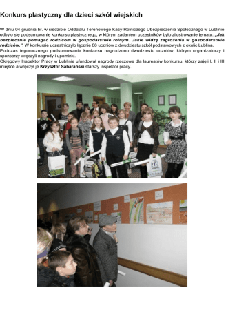 Konkurs plastyczny dla dzieci szkół wiejskich W dniu 04 grudnia br. w siedzibie Oddziału Terenowego Kasy Rolniczego Ubezpieczenia Społecznego w Lublinie odbyło się podsumowanie konkursu plastycznego, w którym zadaniem uczestników było zilustrowanie tematu: „Jak bezpiecznie pomagać rodzicom w gospodarstwie rolnym. Jakie widzę zagrożenia w gospodarstwie rodziców.”. W konkursie uczestniczyło łącznie 88 uczniów z dwudziestu szkół podstawowych z okolic Lublina. Podczas tegorocznego podsumowania konkursu nagrodzono dwudziestu uczniów, którym organizatorzy i sponsorzy wręczyli nagrody i upominki. Okręgowy Inspektor Pracy w Lublinie ufundował nagrody rzeczowe dla laureatów konkursu, którzy zajęli I, II i III miejsce a wręczył je Krzysztof Sabarański starszy inspektor pracy.