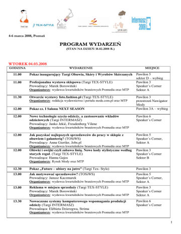 4-6 marca 2008, Poznań PROGRAM WYDARZEŃ (STAN NA DZIEŃ 18.02.2008 R.) WTOREK 04.03.2008 GODZINA WYDARZENIE 11.00 Pokaz inaugurujący Targi Obuwia, Skóry i Wyrobów Skórzanych 11.00 Profesjonalna wystawa sklepowa (Targi TEX-STYLE) Prowadzący: Marek Borowiński Organizatorzy: wydawca kwartalników branżowych Promedia oraz MTP 11.30 Otwarcie wystawy foto.fashion.pl (Targi TEX-STYLE) Organizatorzy: redakcja wydawnictwa i portalu moda.com.pl oraz MTP 12.00 Pokaz cz. I Salonu NEXT SEASON 12.00 Nowe technologie szycia odzieży, a zastosowanie wkładów odzieżowych (Targi INTERMASZ) Prowadzący: Janko Jekić, Freudenberg Vilene MIEJSCE Pawilon 5 sektor D – wybieg Pawilon 3 Speaker`s Corner Sektor A Pawilon 3 przestrzeń Nawigator Mody Pawilon 3A – wybieg Pawilon 6 Speaker`s Corner Organizatorzy: wydawca kwartalników branżowych Promedia oraz MTP 12.00 Jak pozyskać najlepszych sprzedawców do pracy w sklepie z obuwiem i galanterią? (TOSiWS) Prowadzący: Anna Giertler, Jobs.pl Pawilon 5 Speaker`s Corner, Sektor A Organizatorzy: wydawca kwartalników branżowych Promedia oraz MTP 12.00 Ołówki i owijki czyli zabawa linią. Nowe kody stylistyczne według starych reguł. (Targi TEX-STYLE) Prowadząca: Hanna Gajos Pawilon 3 Speaker`s Corner Sektor B Organizatorzy: Rynek Mody oraz MTP 12.30 Pokaz „Future – ubiory na jutro” (Targi Tex- Style) Pawilon 3 13.00 Jak motywować sprzedawców? (TOSiWS) Prowadzący: Janusz Kaczmarek Pawilon 5 Speaker`s Corner, Sektor A Organizatorzy: wydawca kwartalników branżowych Promedia oraz MTP 13.00 Reklama w miejscu sprzedaży (Targi TEX-STYLE) Prowadzący: Marek Borowiński Organizatorzy: wydawca kwartalników branżowych Promedia oraz MTP 13.30 Nowoczesne systemy komputerowego wspomagania produkcji odzieży (Targi INTERMASZ) Prowadząca: Elżbieta Dzierzgwa, Strima Pawilon 3 Speaker`s Corner Sektor A Pawilon 6 Speaker`s Corner Organizatorzy: wydawca kwartalników branżowych Promedia oraz MTP 1 13.30 Trendy w tkaninach i dodatkach na wiosnę i lato 2009 (Targi TEX-STYLE) Prowadząca: Monika Onoszko Pawilon 3 Speaker`s Corner Sektor B Organizatorzy: wydawca kwartalników branżowych Promedia oraz MTP 14.00 Pokaz cz. I Salonu BODY STYLE Pawilon 3 - wybieg 14.00 Jak szkolić sprzedawców w handlu detalicznym? (TOSiWS) Prowadzący: Janusz Kaczmarek Pawilon 5 Speaker`s Corner, Sektor A Organizatorzy: wydawca kwartalników branżowych Promedia oraz MTP 14.30 Pokaz Fashion & Time 14.30 Rola wieszaka w prezentacji odzieży (Targi TEX-STYLE) Prowadzący: Stefan Więckowski Organizatorzy: redakcja Moda Forum - UNIT oraz MTP 15.00 Skuteczne rozwiązania logistyczne w branży odzieżowej (Targi INTERMASZ) Prowadzący: Dorota Getfert, Meyer&Meyer Pawilon 5, Sektor D – wybieg Pawilon 3 Speaker`s Corner Sektor A Pawilon 6 Speaker`s Corner Organizatorzy: wydawca kwartalników branżowych Promedia oraz MTP 15.00 Pokaz cz. I Salonu SPECIAL DAYS Pawilon 3- wybieg 15.00 Moda w Internecie (Targi TEX-STYLE) Prowadząca: Monika Onoszko Pawilon 3 Speaker`s Corner Sektor B Organizatorzy: wydawca kwartalników branżowych Promedia oraz MTP Organizatorzy: wydawca kwartalników branżowych Promedia oraz MTP Pawilon 3 Speaker`s corner Sektor A 16. 00 Pokaz cz. II Salonu NEXT SEASON Pawilon 3A – wybieg 16. 00 Pokaz „Future – ubiory na jutro” Pawilon 3 17.00 Spotkanie branżowe pawilon 14B, sala A 15.30 Jak stworzyć markę w handlu detalicznym? (Targi TEX-STYLE) Prowadzący: Tomasz Zgliczyński – firma CODES Organizator: Polska Izba Branży Skórzanej w Radomiu ŚRODA 05.03.2008 GODZINA 11.00 WYDARZENIE Jak pozyskać kadry dla przemysłu odzieżowego? (Targi INTERMASZ) Prowadzący: Bogusław Słaby MIEJSCE Pawilon 6 – Speaker`s Corner Organizatorzy: wydawca kwartalników branżowych Promedia oraz MTP 11.00 Jak szkolić pracowników i kadrę zarządzającą za pieniądze unijne? Prowadzący: Agnieszka Orłowska- Sójka, Kancelaria Przyjazny Prawnik (Targi TOSiWS) Pawilon 5 Speaker`s Corner, sektor A Organizatorzy: wydawca kwartalników branżowych Promedia oraz MTP 2 11.00 Dzianiny z funkcją (Targi TEX-STYLE) Prowadzący: Michał Kacprzak Organizatorzy: wydawca kwartalników branżowych Promedia oraz MTP 12.0015.00 12.00 Konkurs Triumph Inspiration Award (salon BODY STYLE) 12.00 Pokaz cz. III Salonu NEXT SEASON 12.00 Nowe zachowania konsumenckie – od użytkownika do współautora. Jak i dla kogo powstaje współczesna moda? (Targi TEX-STYLE) Prowadząca: Małgorzata Szwed – Kasperek Pokaz Fashion & Time (TOSiWS) Pawilon 3 Speaker`s corner Sector A Pawilon 3 Pawilon 5, Sektor D – wybieg Pawilon 3A – wybieg Pawilon 3 – Speaker`s Corner Sektor B Organizatorzy: wydawca kwartalników branżowych Promedia oraz MTP 12.30 Pokaz „Future – ubiory na jutro” (Targi TEX-STYLE) Pawilon 3 13.00 Jak skorzystać z funduszy unijnych na inwestycje i rozwój firmy? (Targi INTERMASZ) Prowadząca: Agnieszka Orłowska – Sójka, Kancelaria Przyjazny Prawnik Pawilon 6 Speaker`s Corner Organizatorzy: wydawca kwartalników branżowych Promedia oraz MTP 13.00 Jak rozwinąć sprzedaż poprzez franszyzę? (TOSiWS) Organizatorzy: wydawca kwartalników branżowych Promedia oraz MTP 13.00 Różnorodność surowców w odzieży – korzyści dla klienta (Targi TEX-STYLE) Prowadząca: Anna Melania Raniewicz Pawilon 5 Speaker`s Corner, sektor A Pawilon 3 Speaker`s Corner Sektor A Organizatorzy: wydawca kwartalników branżowych Promedia oraz MTP 13.30 Zimowe metamorfozy – nowe sylwetki, najważniejsze detale w sezonie jesień - zima 2008/09 (Targi TEX-STYLE) Prowadząca: Agnieszka Spiegelhalter Pawilon 3 Speaker`s corner B Organizatorzy: redakcja wydawnictwa i portalu moda.com.pl oraz MTP 14.00 Tendencje w modzie obuwniczej na sezon jesień - zima 2008/2009 (TOSiWS) prowadząca: Teresa Ibek – projektant obuwia Pawilon 5 Speaker`s Corner, Sektor A Organizator: Instytut Przemysłu Skórzanego w Łodzi, oddział w Krakowie 14.30 Pokaz Fashion & Time 15.00 Pokaz cz. II Salonu BOD