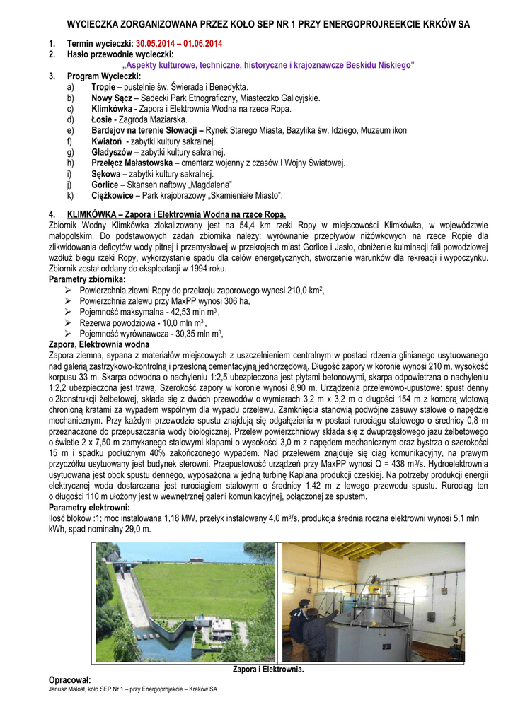 WYCIECZKA ZORGANIZOWANA PRZEZ KOŁO SEP NR 1 PRZY ENERGOPROJREEKCIE KRKÓW SA 1. 2. 3. Termin wycieczki: 30.05.2014 – 01.06.2014 Hasło przewodnie wycieczki: „Aspekty kulturowe, techniczne, historyczne i krajoznawcze Beskidu Niskiego” Program Wycieczki: a) Tropie – pustelnie św. Świerada i Benedykta. b) Nowy Sącz – Sadecki Park Etnograficzny, Miasteczko Galicyjskie. c) Klimkówka - Zapora i Elektrownia Wodna na rzece Ropa. d) Łosie - Zagroda Maziarska. e) Bardejov na terenie Słowacji – Rynek Starego Miasta, Bazylika św. Idziego, Muzeum ikon f) Kwiatoń - zabytki kultury sakralnej. g) Gładyszów – zabytki kultury sakralnej. h) Przełęcz Małastowska – cmentarz wojenny z czasów I Wojny Światowej. i) Sękowa – zabytki kultury sakralnej. j) Gorlice – Skansen naftowy „Magdalena” k) Ciężkowice – Park krajobrazowy „Skamieniałe Miasto”. 4. KLIMKÓWKA – Zapora i Elektrownia Wodna na rzece Ropa. Zbiornik Wodny Klimkówka zlokalizowany jest na 54,4 km rzeki Ropy w miejscowości Klimkówka, w województwie małopolskim. Do podstawowych zadań zbiornika należy: wyrównanie przepływów niżówkowych na rzece Ropie dla zlikwidowania deficytów wody pitnej i przemysłowej w przekrojach miast Gorlice i Jasło, obniżenie kulminacji fali powodziowej wzdłuż biegu rzeki Ropy, wykorzystanie spadu dla celów energetycznych, stworzenie warunków dla rekreacji i wypoczynku. Zbiornik został oddany do eksploatacji w 1994 roku. Parametry zbiornika: Powierzchnia zlewni Ropy do przekroju zaporowego wynosi 210,0 km2, Powierzchnia zalewu przy MaxPP wynosi 306 ha, Pojemność maksymalna - 42,53 mln m3 , Rezerwa powodziowa - 10,0 mln m3 , Pojemność wyrównawcza - 30,35 mln m3, Zapora, Elektrownia wodna Zapora ziemna, sypana z materiałów miejscowych z uszczelnieniem centralnym w postaci rdzenia glinianego usytuowanego nad galerią zastrzykowo-kontrolną i przesłoną cementacyjną jednorzędową. Długość zapory w koronie wynosi 210 m, wysokość korpusu 33 m. Skarpa odwodna o nachyleniu 1:2,5 ubezpieczona jest płytami betonowymi, skarpa odpowietrzna o nachyleniu 1:2,2 ubezpieczona jest trawą. Szerokość zapory w koronie wynosi 8,90 m. Urządzenia przelewowo-upustowe: spust denny o 2konstrukcji żelbetowej, składa się z dwóch przewodów o wymiarach 3,2 m x 3,2 m o długości 154 m z komorą wlotową chronioną kratami za wypadem wspólnym dla wypadu przelewu. Zamknięcia stanowią podwójne zasuwy stalowe o napędzie mechanicznym. Przy każdym przewodzie spustu znajdują się odgałęzienia w postaci rurociągu stalowego o średnicy 0,8 m przeznaczone do przepuszczania wody biologicznej. Przelew powierzchniowy składa się z dwuprzęsłowego jazu żelbetowego o świetle 2 x 7,50 m zamykanego stalowymi klapami o wysokości 3,0 m z napędem mechanicznym oraz bystrza o szerokości 15 m i spadku podłużnym 40% zakończonego wypadem. Nad przelewem znajduje się ciąg komunikacyjny, na prawym przyczółku usytuowany jest budynek sterowni. Przepustowość urządzeń przy MaxPP wynosi Q = 438 m 3/s. Hydroelektrownia usytuowana jest obok spustu dennego, wyposażona w jedną turbinę Kaplana produkcji czeskiej. Na potrzeby produkcji energii elektrycznej woda dostarczana jest rurociągiem stalowym o średnicy 1,42 m z lewego przewodu spustu. Rurociąg ten o długości 110 m ułożony jest w wewnętrznej galerii komunikacyjnej, połączonej ze spustem. Parametry elektrowni: Ilość bloków :1; moc instalowana 1,18 MW, przełyk instalowany 4,0 m3/s, produkcja średnia roczna elektrowni wynosi 5,1 mln kWh, spad nominalny 29,0 m. Zapora i Elektrownia. Opracował: Janusz Malost, koło SEP Nr 1 – przy Energoprojekcie – Kraków SA