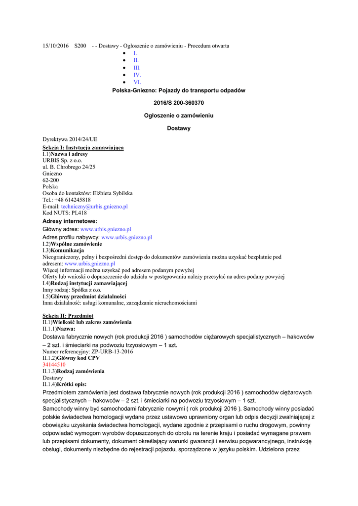 15/10/2016 S200 - - Dostawy - Ogłoszenie o zamówieniu - Procedura otwarta I. II. III. IV. VI. Polska-Gniezno: Pojazdy do transportu odpadów 2016/S 200-360370 Ogłoszenie o zamówieniu Dostawy Dyrektywa 2014/24/UE Sekcja I: Instytucja zamawiająca I.1)Nazwa i adresy URBIS Sp. z o.o. ul. B. Chrobrego 24/25 Gniezno 62-200 Polska Osoba do kontaktów: Elżbieta Sybilska Tel.: +48 614245818 E-mail: [email protected] Kod NUTS: PL418 Adresy internetowe: Główny adres: www.urbis.gniezno.pl Adres profilu nabywcy: www.urbis.gniezno.pl I.2)Wspólne zamówienie I.3)Komunikacja Nieograniczony, pełny i bezpośredni dostęp do dokumentów zamówienia można uzyskać bezpłatnie pod adresem: www.urbis.gniezno.pl Więcej informacji można uzyskać pod adresem podanym powyżej Oferty lub wnioski o dopuszczenie do udziału w postępowaniu należy przesyłać na adres podany powyżej I.4)Rodzaj instytucji zamawiającej Inny rodzaj: Spółka z o.o. I.5)Główny przedmiot działalności Inna działalność: usługi komunalne, zarządzanie nieruchomościami Sekcja II: Przedmiot II.1)Wielkość lub zakres zamówienia II.1.1)Nazwa: Dostawa fabrycznie nowych (rok produkcji 2016 ) samochodów ciężarowych specjalistycznych – hakowców – 2 szt. i śmieciarki na podwoziu trzyosiowym – 1 szt. Numer referencyjny: ZP-URB-13-2016 II.1.2)Główny kod CPV 34144510 II.1.3)Rodzaj zamówienia Dostawy II.1.4)Krótki opis: Przedmiotem zamówienia jest dostawa fabrycznie nowych (rok produkcji 2016 ) samochodów ciężarowych specjalistycznych – hakowców – 2 szt. i śmieciarki na podwoziu trzyosiowym – 1 szt. Samochody winny być samochodami fabrycznie nowymi ( rok produkcji 2016 ). Samochody winny posiadać polskie świadectwa homologacji wydane przez ustawowo uprawniony organ lub odpis decyzji zwalniającej z obowiązku uzyskania świadectwa homologacji, wydane zgodnie z przepisami o ruchu drogowym, powinny odpowiadać wymogom wyrobów dopuszczonych do obrotu na terenie kraju i posiadać wymagane prawem lub przepisami dokumenty, dokument określający warunki gwarancji i serwisu pogwarancyjnego, instrukcję obsługi, dokumenty niezbędne do rejestracji pojazdu, sporządzone w języku polskim. Udzielona przez Wykonawcę gwarancja na kompletny pojazd nie może być krótsza niż 24 miesięcy. Możliwość wykupu po zakończeniu 36 miesięcznej umowy leasingowej. II.1.5)Szacunkowa całkowita wartość II.1.6)Informacje o częściach To zamówienie podzielone jest na części: tak Oferty można składać w odniesieniu do wszystkich części II.2)Opis II.2.1)Nazwa: Hakowce – 2 szt. Część nr: 1 II.2.2)Dodatkowy kod lub kody CPV 34144511 II.2.3)Miejsce świadczenia usług Kod NUTS: PL418 Główne miejsce lub lokalizacja realizacji: URBIS Spółka z o.o. Zakład Oczyszczania Miasta 62-200 Gniezno, ul. B. Chrobrego 21. II.2.4)Opis zamówienia: Część I. – Hakowce – 2 szt. fabrycznie nowy, produkcja z 2016 roku, jednakowej marki. 1. Podwozie 1.1. podwozie fabrycznie nowe z 2016 r. 4x2 1.2. rozstaw osi pojazdu 3500 – 3600 mm 1.3. oś przednia na zawieszeniu piórowym o nośności min. 4,48 t 1.4. oś tylna na zawieszeniu pneumatycznym, wyposażona w dwa miechy o nośności min. 8,48 t 1.5. stabilizator osi tylnej 1.6. dopuszczalna masa całkowita 11990 kg 1.7. silnik o pojemności od 4,5 l do 5,0 l 1.8. moc silnika 210-220 KM 1.9. maksymalny moment obrotowy min. 800 Nm 1.10. norma emisji spalin Euro 6 1.11. ogranicznik prędkości do 90 km/h 1.12. ręczna skrzynia biegów 6-biegowa, plus wsteczny 1.13. przystawka dodatkowego odbioru mocy od skrzyni biegów spełniająca wymagania zabudowy 1.14. skrzynia narzędziowa na ramie pojazdu 1.15. blokada tylnego mostu ASR 1.16. elektroniczny układ kontroli stabilności jazdy VSC lub ESP 1.17. układ kierowniczy wspomagany hydraulicznie, lewostronny 1.18. kolumna kierownicza regulowana w dwóch płaszczyznach 1.19. system ABS 1.20. dodatkowy hamulec wydechowy, sterowany przy kierownicy 1.21. wentylowane hamulce tarczowe na wszystkich kołach 1.22. tempomat adaptacyjny z funkcją ostrzegania przed uderzeniem w przód pojazdu i awaryjnym układem hamulcowym 1.23. system ostrzegania przed niezamierzoną zmianą pasa ruchu 1.24. osłony antyrowerowe 1.25. osuszacz powietrza 1.26. zbiornik paliwa z tworzywa sztucznego o pojemności minimum 180 litrów z korkiem zamykanym na klucz 1.27. zbiornik AdBlue pojemności min. 25 litrów zamykany na klucz i podgrzewany 1.28. koła o rozmiarze 245/70R17,5 – plus koło zapasowe 1.29. główny wyłącznik instalacji elektrycznej (akumulatora) 1.30. akumulatory min. 2 x 175 Ah, 12V 1.31. trzy światła robocze LED oświetlające pole pracy urządzenia 1.32. zamontowany system monitorowania pojazdu z sondą paliwa i przeprowadzoną kalibracja sondy oraz opomiarowaniem urządzenia hakowego z firmą, z którą Zamawiający związany jest umową na monitoring 1.33. światła do jazdy dziennej LED wbudowane w reflektory dzienne 1.34. gwarancja na podwozie min. 36 miesiące 2. Kabina 2.1. kabina dzienna, dwuosobowa ze stalowym zderzakiem 2.2. szyba przednia i lusterka boczne ogrzewane elektrycznie 2.3. centralny zamek z pilotem 2.4. dwa światła ostrzegawcze na dachu kabiny 2.5. zewnętrzna osłona przeciwsłoneczna nad przednią szybę 2.6. okno w tylnej ścianie kabiny zabezpieczone przed uszkodzeniem, siatką od zewnątrz 2.7. komputer pokładowy w języku polskim 2.8. wskaźnik ciśnienia w ogumieniu podający komunikaty na wyświetlaczu komputera pokładowego 2.9. elektrycznie sterowane szyby boczne 2.10. szerokość kabiny bez lusterek max 2,2 metra z lusterkami składanymi max 2,4 metra 2.11. fotel kierowcy na zawieszeniu pneumatycznym ze zintegrowanym zagłówkiem i trzypunktowym pasem bezpieczeństwa 2.12. pojedynczy fotel zmiennika ze zintegrowanym zagłówkiem i trzypunktowym pasem bezpieczeństwa 2.13. zamykany na kluczyk schowek pomiędzy fotelami 2.14. ręcznie sterowana klimatyzacji z recyrkulacją powietrza 2.15. wywiet