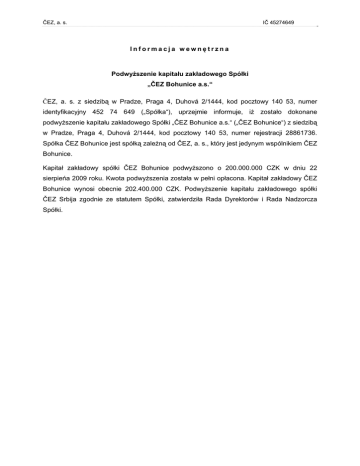 ČEZ, a. s. IČ 45274649 Informacja wewnętrzna Podwyższenie kapitału zakładowego Spółki „ČEZ Bohunice a.s.“ ČEZ, a. s. z siedzibą w Pradze, Praga 4, Duhová 2/1444, kod pocztowy 140 53, numer identyfikacyjny 452 74 649 („Spółka“), uprzejmie informuje, iż zostało dokonane podwyższenie kapitału zakładowego Spółki „ČEZ Bohunice a.s.“ („ČEZ Bohunice“) z siedzibą w Pradze, Praga 4, Duhová 2/1444, kod pocztowy 140 53, numer rejestracji 28861736. Spółka ČEZ Bohunice jest spółką zależną od ČEZ, a. s., który jest jedynym wspólnikiem ČEZ Bohunice. Kapitał zakładowy spółki ČEZ Bohunice podwyższono o 200.000.000 CZK w dniu 22 sierpieńa 2009 roku. Kwota podwyższenia została w pełni opłacona. Kapitał zakładowy ČEZ Bohunice wynosi obecnie 202.400.000 CZK. Podwyższenie kapitału zakładowego spółki ČEZ Srbija zgodnie ze statutem Spółki, zatwierdziła Rada Dyrektorów i Rada Nadzorcza Spółki.