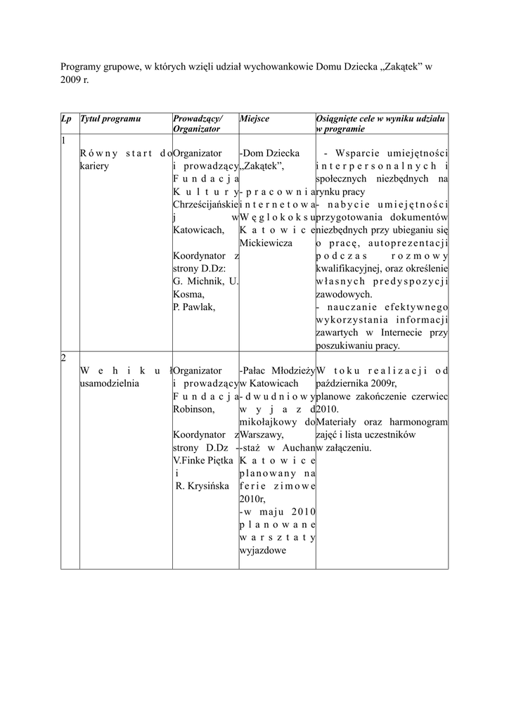 Programy grupowe, w których wzięli udział wychowankowie Domu Dziecka „Zakątek” w 2009 r. Lp Tytuł programu Prowadzący/ Organizator Miejsce Osiągnięte cele w wyniku udziału w programie 1 R ó w n y s t a r t d o Organizator -Dom Dziecka - Wsparcie umiejętności kariery i prowadzący „Zakątek”, interpersonalnych i Fundacja społecznych niezbędnych na K u l t u r y - p r a c o w n i a rynku pracy Chrześcijańskie i n t e r n e t o w a - n a b y c i e u m i e j ę t n o ś c i j w W ę g l o k o k s u przygotowania dokumentów Katowicach, K a t o w i c e niezbędnych przy ubieganiu się Mickiewicza o pracę, autoprezentacji Koordynator z podczas rozmowy strony D.Dz: kwalifikacyjnej, oraz określenie G. Michnik, U. własnych predyspozycji Kosma, zawodowych. P. Pawlak, - nauczanie efektywnego wykorzystania informacji zawartych w Internecie przy poszukiwaniu pracy. 2 W e h i k u ł Organizator -Pałac Młodzieży W t o k u r e a l i z a c j i o d usamodzielnia i prowadzący w Katowicach października 2009r, F u n d a c j a - d w u d n i o w y planowe zakończenie czerwiec Robinson, w y j a z d 2010. mikołajkowy do Materiały oraz harmonogram Koordynator z Warszawy, zajęć i lista uczestników strony D.Dz - -staż w Auchan w załączeniu. V.Finke Piętka K a t o w i c e i planowany na R. Krysińska f e r i e z i m o w e 2010r, -w maju 2010 planowane w a r s z t a t y wyjazdowe 3 Cykl z a j ę ć Pedagodzy D o m D z i e c k a W toku realizacji od listopada „Bezpieczny Internet” Domu Dziecka „Zakątek” 2009. Zrealizowano spotkania „Zakątek zespołowe. Aktualnie V. Finke Piętka, realizowane są zajęcia G. Michnik indywidualne ćwiczące w praktyczne treści teoretyczne z części zespołowej. Sprawozdanie i harmonogram z zajęć zespołowych w załączeniu. 4 Drużyna dzielnych Michnik G. rycerzy Zakątka-cykl zajęć w formie gry planszowej D o m D z i e c k a Doskonalenie umiejętności „Zakątek” ważnych w procesie dydaktycznym, wiadomości, dojrzałości emocjonalnej w grupie dzieci realizującej obowiązek rocznego przygotowania przedszkolnego (panowania nad sobą, wyrabianie refleksu i orientacji na drodze do osiągania celu, umiejętności interpersonalne ważne dla zgodnego współdziałania w grupie, , rozwijanie pamięci, mowy, myślenia, doskonalenie umiejętności matematycznych). . Wybrane elementy pedagodzy p r o g r a m u wspomagania r o z w o j u najmłodszych dzieci „Muzyka i ruch” D o m D z i e c k a Na bieżąco wykorzystywany w „Zakątek” we wczesnym wspomaganiu dzieci przedszkolnych i młodszo szkolnych. 5 6 Psycholog Dom Dziecka „Zły dotyk, Domu Dziecka „Zakątek” potajemne dotykanie” „Zakątek Iwona Troczyńska Uświadomienie dzieciom co to jest zły dotyk, potajemne dotykanie, czym to grozi. 7 Program dla usamodzielnianych wychowanków Pracownik Dom Dziecka socjalny z „Zakątek” TPPS Nr 2- p. Anna Jedziniak, psycholog MOPS p. Iwona Wowra Przygotowanie wychowanek do procesu usamodzielnienia po osiągnięciu pełnoletniości i opuszczeniu placówki. W oparciu o diagnozę i zalecenia Poradni Psychologiczno- Pedagogicznych oraz diagnozę własną pedagogów realizowane są indywidualne zajęcia korekcyjno- kompensacyjne i reedukacyjne usprawniające deficyty parcjalne i wyrównując luki w systemie wiadomości szkolnych. Karty zajęć do wglądu w kartach indywidualnych u pedagogów.