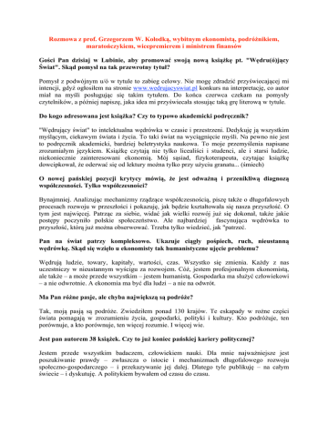 Rozmowa z prof. Grzegorzem W. Kołodką, wybitnym ekonomistą, podróżnikiem, maratończykiem, wicepremierem i ministrem finansów Gości Pan dzisiaj w Lubinie, aby promować swoją nową książkę pt. "Wędru(ó)jący Świat". Skąd pomysł na tak przewrotny tytuł? Pomysł z podwójnym u/ó w tytule to zabieg celowy. Nie mogę zdradzić przyświecającej mi intencji, gdyż ogłosiłem na stronie www.wedrujacyswiat.pl konkurs na interpretację, co autor miał na myśli posługując się takim tytułem. Do końca czerwca czekam na pomysły czytelników, a później napiszę, jaka idea mi przyświecała stosując taką grę literową w tytule. Do kogo adresowana jest książka? Czy to typowo akademicki podręcznik? "Wędrujący świat" to intelektualna wędrówka w czasie i przestrzeni. Dedykuję ją wszystkim myślącym, ciekawym świata i życia. To taki świat na wyciągnięcie myśli. Na pewno nie jest to podręcznik akademicki, bardziej beletrystyka naukowa. To moje przemyślenia napisane zrozumiałym językiem. Książkę czytają nie tylko licealiści i studenci, ale i starsi ludzie, niekoniecznie zainteresowani ekonomią. Mój sąsiad, fizykoterapeuta, czytając książkę dowcipkował, że oderwać się od lektury można tylko przy użyciu granatu... (śmiech) O nowej pańskiej pozycji krytycy mówią, że jest odważną i przenikliwą diagnozą współczesności. Tylko współczesności? Bynajmniej. Analizując mechanizmy rządzące współczesnością, piszę także o długofalowych procesach rozwoju w przeszłości i pokazuję, jak będzie kształtowała się nasza przyszłość. O tym jest najwięcej. Patrząc za siebie, widać jak wielki rozwój już się dokonał, także jakie postępy poczyniło polskie społeczeństwo. Ale najbardziej fascynująca wędrówka to przyszłość, którą już można obserwować. Trzeba tylko wiedzieć, jak "patrzeć. Pan na świat patrzy kompleksowo. Ukazuje ciągły pośpiech, ruch, nieustanną wędrówkę. Skąd się wzięło u ekonomisty tak humanistyczne ujęcie problemu? Wędrują ludzie, towary, kapitały, wartości, czas. Wszystko się zmienia. Każdy z nas uczestniczy w nieustannym wyścigu za rozwojem. Cóż, jestem profesjonalnym ekonomistą, ale także – a może przede wszystkim – jestem humanistą. Gospodarka ma służyć człowiekowi – a nie odwrotnie. A ekonomia ma być dla ludzi – a nie na odwrót. Ma Pan różne pasje, ale chyba największą są podróże? Tak, moją pasją są podróże. Zwiedziłem ponad 130 krajów. Te eskapady w rożne części świata pomagają w zrozumieniu życia, gospodarki, polityki i kultury. Kto podróżuje, ten porównuje, a kto porównuje, ten więcej rozumie. I więcej wie. Jest pan autorem 38 książek. Czy to już koniec pańskiej kariery politycznej? Jestem przede wszystkim badaczem, człowiekiem nauki. Dla mnie najważniejsze jest poszukiwanie prawdy – zwłaszcza o istocie i mechanizmach długofalowego rozwoju społeczno-gospodarczego – i przekazywanie jej dalej. Dlatego tyle publikuję – na całym świecie – i dyskutuję. A politykiem bywałem od czasu do czasu. Promocja nowej książki to seria ponad 70 wykładów w 26 miastach w całej Polsce. Widać, że bardzo zależy panu na dotarciu do jak największej liczby odbiorców. Książka jest adresowana do szerokiego gremium czytelników, ale spotykam się najwięcej – i najchętniej – z przedstawicielami młodszego pokolenia, do którego siebie też zaliczam (śmiech), zwłaszcza jego ambitnej części, studentów i absolwentów polskich uczelni. Lubię spotkania z młodymi ludźmi. Zwłaszcza jeśli zadają trudne pytania. To jakie pytania zadane przez czytelnika były dla pana najbardziej kłopotliwe? Nie zdarzają mi się takie. Oczywiście, nieco kłopotliwe są te pytania, na które ma się ochotę odpowiedzieć wykładem – na przykład co zrobić, aby w Polsce było lepiej albo jak zapewnić zrównoważony rozwój świata i ludzkości – a ma się co najwyżej parę minut… Tłumaczę największe nawet zawiłości przystępnie – w sposób tak prosty, jak to możliwe, ale nie prostszy. Koledzy ekonomiści mówią o panu ,,to główny architekt polskich reform gospodarczych,,. Może ma pan jakiś pomysł na przeobrażenia gospodarcze Lubelszczyzny? Strategię rozwoju miasta i regionu trzeba budować na konkretach. Określić trzeba przewagi konkurencyjne, bo są takie. Po pierwsze, Lublin to silny i duży ośrodek akademicki i trzeba umieć to wykorzystać. Po drugie, duża szansa i możliwości daje to, że woda tu czysta i trawa zielona, a więc rozwój ekoturystyki na bazie drobnej przedsiębiorczości. Po trzecie, plus Lubelszczyzny (a jego znaczenie będzie rosło) widzę w jej geopolitycznym położeniu na mapie Europy. Może teraz na to narzekacie, ale gdy Ukraina wejdzie do Unii Europejskiej, region przestanie być peryferyjny i odgrywał będzie znaczącą rolę. Ale na tym już można i trzeba budować. Robert Mundell, zdobywca nagrody Nobla w dziedzinie ekonomii, napisał: ,,ta ksiązka przyniesie korzyść każdemu, kto interesuje się rozwojem gospodarczym,,. Pan też tak uważa? Na pewno. Więcej nawet. Ta książka przyniesie korzyść każdemu, kto po nią sięgnie, bo spowoduje poszerzenie horyzontów myślowych i pogłębienie wiedzy z rożnych dziedzin życia. A czyż nie lepiej wiedzieć i rozumieć więcej? Einstein mawiał, że myślenie ma przyszłość. A ja powiadam, że interdyscyplinarne myślenie ma wielką przyszłość. Dziękuję za rozmowę Rozmawiała: Aleksandra Smyk 2