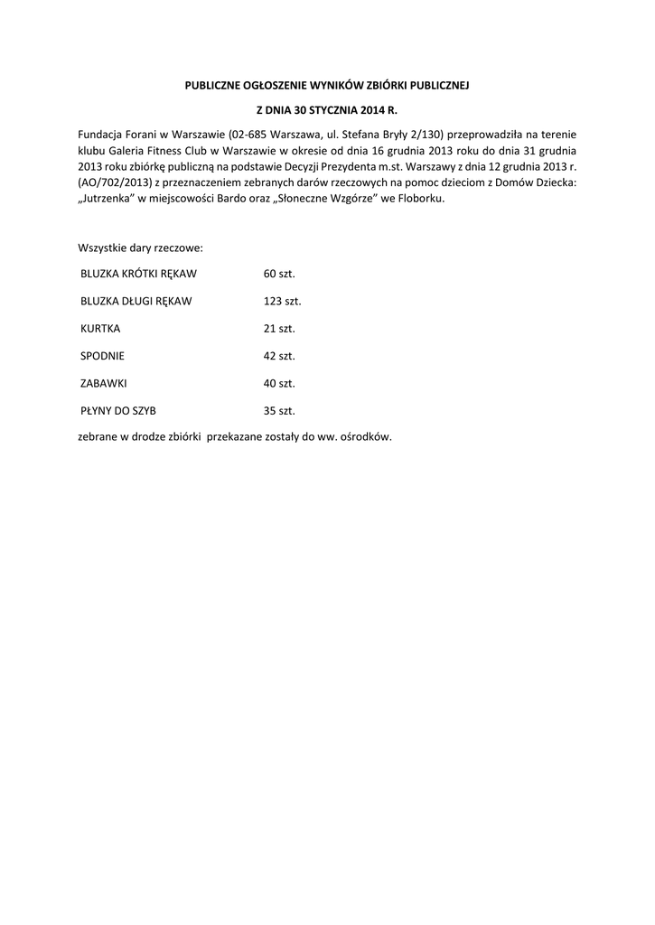 PUBLICZNE OGŁOSZENIE WYNIKÓW ZBIÓRKI PUBLICZNEJ Z DNIA 30 STYCZNIA 2014 R. Fundacja Forani w Warszawie (02-685 Warszawa, ul. Stefana Bryły 2/130) przeprowadziła na terenie klubu Galeria Fitness Club w Warszawie w okresie od dnia 16 grudnia 2013 roku do dnia 31 grudnia 2013 roku zbiórkę publiczną na podstawie Decyzji Prezydenta m.st. Warszawy z dnia 12 grudnia 2013 r. (AO/702/2013) z przeznaczeniem zebranych darów rzeczowych na pomoc dzieciom z Domów Dziecka: „Jutrzenka” w miejscowości Bardo oraz „Słoneczne Wzgórze” we Floborku. Wszystkie dary rzeczowe: BLUZKA KRÓTKI RĘKAW 60 szt. BLUZKA DŁUGI RĘKAW 123 szt. KURTKA 21 szt. SPODNIE 42 szt. ZABAWKI 40 szt. PŁYNY DO SZYB 35 szt. zebrane w drodze zbiórki przekazane zostały do ww. ośrodków.