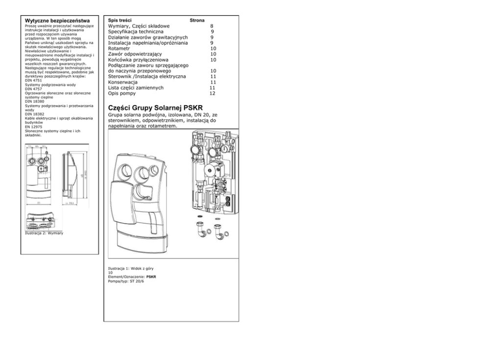 Wytyczne bezpieczeństwa Proszę uwaŜnie przeczytać następujące instrukcje instalacji i uŜytkowania przed rozpoczęciem uŜywania urządzenia. W ten sposób mogą Państwo uniknąć uszkodzeń sprzętu na skutek niewłaściwego uŜytkowania. Niewłaściwe uŜytkowanie i nieupowaŜnione modyfikacje instalacji i projektu, powodują wygaśnięcie wszelkich roszczeń gwarancyjnych. Następujące regulacje technologiczne muszą być respektowane, podobnie jak dyrektywy poszczególnych krajów: DIN 4751 Systemy podgrzewania wody DIN 4757 Ogrzewanie słoneczne oraz słoneczne systemy cieplne DIN 18380 Systemy podgrzewania i przetwarzania wody DIN 18382 Kable elektryczne i sprzęt okablowania budynków EN 12975 Słoneczne systemy cieplne i ich składniki. Spis treści Strona Wymiary, Części składowe Specyfikacja techniczna Działanie zaworów grawitacyjnych Instalacja napełniania/opróŜniania Rotametr Zawór odpowietrzający Końcówka przyłączeniowa Podłączanie zaworu sprzęgającego do naczynia przeponowego Sterownik /Instalacja elektryczna Konserwacja Lista części zamiennych Opis pompy 8 9 9 9 10 10 10 10 11 11 11 12 Części Grupy Solarnej PSKR Grupa solarna podwójna, izolowana, DN 20, ze sterownikiem, odpowietrznikiem, instalacją do napełniania oraz rotametrem. Ilustracja 2: Wymiary Ilustracja 1: Widok z góry 10 Element/Oznaczenie: PSKR Pompa/typ: ST 20/6 Specyfikacja techniczne Maksymalne ciśnienie robocze Maksymalna dopuszczalna temperatura (powrót): Maksymalna dopuszczalna temperatura (zasilanie): Medium: Średnica nominalna: Przyłącza: Uszczelka: Obudowa: Osprzęt: Izolacja: Współczynnik przewodności cieplnej: 6 bar 120° C 140° C Woda z maksymalnie 50% stęŜeniem glikolu propylenowego DN 20 Płaska uszczelka, obrotowa nakrętka G1, 1¼” EPDM GK-CuZn37Pb (2.0340.02) CuZn39Pb3 (2.0401) EPP piankowa 0,038W/mK Ilustracja 3a: Zawór kulowy - otwarty Działanie zaworów grawitacyjnych (1/2) Ilustracja 3b: Zawory grawitacyjne otwarte Ciśnienie zaworów grawitacyjnych na otwarciu: 20 mbar na kaŜdym. Zawory grawitacyjne są zintegrowane z zaworami kulowymi zasilania i powrotu. Są one obsługiwane poprzez obracanie uchwytów zaworów kulowych. Aby zapobiegać obiegowi grawitacyjnemu, płytki zaworów nie powinny być odpowietrzane. Zawory grawitacyjne są w roboczej pozycji (zamknięte). Otwory w uchwytach są w pionowych pozycjach (Ilustracja 3a). śeby napełnić i całkowicie opróŜnić system solarny, naleŜy otworzyć zawory grawitacyjne, poprzez obrócenie uchwytów w prawo. Otwory w uchwytach są umiejscowione pod kątem 45° (Ilustracja 3b). Obróć uchwyt w prawo o 90°. Otwory w uchwytach są w poziomej pozycji. Zawory kulowe są zamknięte (Ilustracja 3c). Ilustracja 3c: Zawór kulowy zamknięty Ilustracja 4a: Instalacja opróŜniania całkowicie otwarta Instalacja napełniania i opróŜniania (6) UŜyj zaworów napełniania i opróŜniania przy instalacji napełniania i opróŜniania, aby napełnić lub opróŜnić system solarny (Ilustracja 4). Aby opróŜnić system, szczelina na zaworze musi być w pozycji poziomej (Ilustracja 4b). Ilustracja 4b: Instalacja opróŜniania - zamknięta Odczytaj objętościowe wartości przepływu na brzegu rotametru Ilustracja 5: Wskaźnik przepływu Rotametr (7) Dostosowanie natęŜenia przepływu cieplnego ośrodka nośnego ma miejsce poprzez regulacje poziomu prędkości (I, II, III) pompy obiegu oraz przepustnicy instalacji napełniania/opróŜniania. (Ilustracja 4). Rotametr pokazuje ustawienie natęŜenia przepływu (Ilustracja 5). Zakres wskazań obejmuje wartości pomiędzy 1 a 13 l/min. Zawór odpowietrzający (8) 4 Podłączenie RP ¾“ gwintu wewnętrznego 11 Połączenie naczynia przeponowego, Płaska uszczelka G ¾“ Gwint zewnętrzny Ilustracja 6: Podłączenie naczynia przeponowego Pozostałe powietrze w cieplnym ośrodku nośnym jest gromadzone w zaworze odpowietrzającym i moŜe być odpowietrzone ręcznie za pomocą nakrętki odpowietrzającej (Ilustracja 1, poz. 9). Aby to zrobić, naleŜy przymocować załączony wąŜ do dyszy nakrętki odpowietrzającej i zgromadzić wyciekający nośnik w odpowiednim naczyniu. Usuń wąŜ po odpowietrzaniu. Odpowietrzanie powinno być wyłącznie wykonywane przez wykwalifikowanych instalatorów. Niekontrolowane odpowietrzanie moŜe doprowadzić do wadliwego działania systemu słonecznego z powodu utraty ciśnienia. OstrzeŜenie! Ryzyko oparzenia! Uwalniające się podczas odpowietrzania systemu powietrze oraz cieplny ośrodek nośny moŜe osiągać temperaturę powyŜej 100° C. Po zakończeniu, mocno dokręcić nakrętkę. NaleŜy monitorować ciśnienie systemu podczas odpowietrzania. Jeśli jest to konieczne, naleŜy uzupełnić system słoneczny cieplnym ośrodkiem nośnym. Końcówka przyłączeniowa (10) Ilustracja 7: Podłączenie zaworu sprzęgającego Tuleja zanurzeniowa z G ½“ gwintem zewnętrznym do dołączenia czujnika temperatury moŜe być podłączona do przepływowego zaworu kulowego (Ilustracja 1, poz. 1). Podłączanie zaworu sprzęgającego do naczyń przeponowych (Ilustracja 7) Poz. 17, 18, 20 i 21 nie są uwzględnione. Sterownik/Instalacja elektryczna (16) Uwaga! · Instalacja elektryczna moŜe być wykonywana jedynie przez wykwalifikowanych instalatorów Bezpieczniki, okablowanie i uziemienie musi być zainstalowane zgodnie z lokalnymi przepisami. · Sterownik musi być chroniony przed uszkodzeniem spowodowanym przeciąŜeniem. · Przed otwarciem obudowy sterownika, odłączyć system od sieci elektrycznej! Kabel pompy i przewód zasilający są juŜ podłączone do sterownika. Aby dostać się do listwy z czujnikami, naleŜy usunąć śrubę w obudowie sterownika (poz. 16). Podłączyć czujniki zgodnie z instrukcją instalacji sterownika. Funkcje i wskazówki dotyczące uŜytkowania zawarte są w instrukcji montaŜu sterownika. Konserwacja W razie konieczności przeprowadzenia konserwacji urządzenia (np.: wymiana pompy), nale