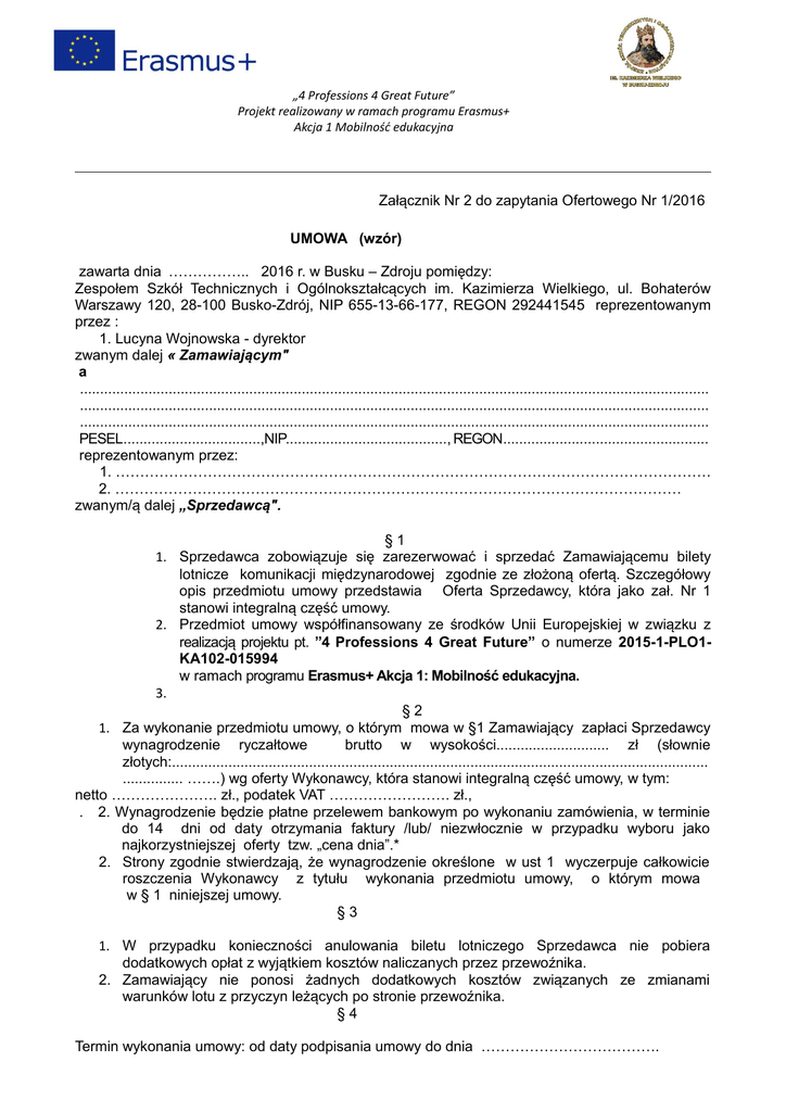 „4 Professions 4 Great Future” Projekt realizowany w ramach programu Erasmus+ Akcja 1 Mobilność edukacyjna Załącznik Nr 2 do zapytania Ofertowego Nr 1/2016 UMOWA (wzór) zawarta dnia …………….. 2016 r. w Busku – Zdroju pomiędzy: Zespołem Szkół Technicznych i Ogólnokształcących im. Kazimierza Wielkiego, ul. Bohaterów Warszawy 120, 28-100 Busko-Zdrój, NIP 655-13-66-177, REGON 292441545 reprezentowanym przez : 1. Lucyna Wojnowska - dyrektor zwanym dalej « Zamawiającym" a ............................................................................................................................................................ ............................................................................................................................................................ ............................................................................................................................................................ PESEL..................................,NIP........................................, REGON................................................... reprezentowanym przez: 1. …………………………………………………………………………………………………………… 2. ……………………………………………………………………………………………………… zwanym/ą dalej „Sprzedawcą". §1 1. Sprzedawca zobowiązuje się zarezerwować i sprzedać Zamawiającemu bilety lotnicze komunikacji międzynarodowej zgodnie ze złożoną ofertą. Szczegółowy opis przedmiotu umowy przedstawia Oferta Sprzedawcy, która jako zał. Nr 1 stanowi integralną część umowy. 2. Przedmiot umowy współfinansowany ze środków Unii Europejskiej w związku z realizacją projektu pt. ”4 Professions 4 Great Future” o numerze 2015-1-PLO1KA102-015994 w ramach programu Erasmus+ Akcja 1: Mobilność edukacyjna. 3. §2 1. Za wykonanie przedmiotu umowy, o którym mowa w §1 Zamawiający zapłaci Sprzedawcy wynagrodzenie ryczałtowe brutto w wysokości............................ zł (słownie złotych:..................................................................................................................................... ............... …….) wg oferty Wykonawcy, która stanowi integralną część umowy, w tym: netto …………………. zł., podatek VAT ……………………. zł., . 2. Wynagrodzenie będzie płatne przelewem bankowym po wykonaniu zamówienia, w terminie do 14 dni od daty otrzymania faktury /lub/ niezwłocznie w przypadku wyboru jako najkorzystniejszej oferty tzw. „cena dnia”.* 2. Strony zgodnie stwierdzają, że wynagrodzenie określone w ust 1 wyczerpuje całkowicie roszczenia Wykonawcy z tytułu wykonania przedmiotu umowy, o którym mowa w § 1 niniejszej umowy. §3 1. W przypadku konieczności anulowania biletu lotniczego Sprzedawca nie pobiera dodatkowych opłat z wyjątkiem kosztów naliczanych przez przewoźnika. 2. Zamawiający nie ponosi żadnych dodatkowych kosztów związanych ze zmianami warunków lotu z przyczyn leżących po stronie przewoźnika. §4 Termin wykonania umowy: od daty podpisania umowy do dnia ………………………………. „4 Professions 4 Great Future” Projekt realizowany w ramach programu Erasmus+ Akcja 1 Mobilność edukacyjna *zakreślić właściwe §5 1. Sprzedawca oświadcza, że posiada możliwości i kwalifikacje do realizacji przedmiotu umowy o którym mowa w § 1. 2. Sprzedawca gwarantuje dostępność biletów lotniczych zgodnie z obowiązującymi w Polsce zasadami sprzedaży międzynarodowych biletów na wszystkie wymagane trasy. 3. Sprzedawca zobowiązuje się : 1) zachować najwyższą staranność przy wykonaniu przedmiotu umowy, 2) stosować minimalne ceny dostępne w danym terminie na danej trasie z zachowaniem zasady uczciwości handlowej, 3) dostarczyć zamówione bilety lotnicze oraz inne dokumenty konieczne do realizacji podróży, 4) zapewnić możliwość natychmiastowego kontaktowania się za pomocą telefonu, faxu i poczty elektronicznej – poprzez posiadanie (dostępnych równocześnie) linii telefonicznych do kas lotniczych. 1. Zamawiający zobowiązuje się : 1) dostarczyć niezwłocznie po wyborze najkorzystniejszej oferty, listy uczestników z podaniem niezbędnych danych celem dokonania rezerwacji przelotów lotniczych. §6 1. Strony zastrzegają następujące kary umowne : 1) od Sprzedawcy na rzecz Zamawiającego z tytułu odstąpienia lub rozwiązania Umowy przez Zamawiającego z przyczyn leżących po stronie Sprzedawcy lub z przyczyn innych niż wina Zamawiającego – w wysokości 5% kwoty określonej w § 2 ust. 1, 2) od Sprzedawcy na rzecz Zamawiającego z tytułu niewykonywania lub nienależytego wykonywania obowiązków wynikających z Umowy w wysokości 0,2% kwoty określonej w § 3 ust. 1 za każdy dzień zwłoki w wykonaniu przedmiotu umowy, 3) od Zamawiającego na rzecz Sprzedawcy z tytułu odstąpienia lub rozwiązania umowy przez Zamawiającego z przyczyn leżących po stronie Zamawiającego – w wysokości 5% kwoty wynagrodzenia określonej w § 3 ust. 1 chyba, że zaistniały istotne zmiany okoliczności, powodujące, że wykonanie umowy nie leży w interesie publicznym, czego nie można było przewidzieć w chwili zawarcia umowy. Zamawiający może w tej sytuacji odstąpić od umowy w terminie do 30 dni od powzięcia wiadomości o tych okolicznościach, bez płacenia kary umownej. 1. Strony uprawnione są do dochodzenia odszkodowania uzupełniającego na zasadach ogólnych w przypadku, gdy poniesiona szkoda przekracza wysokość zastrzeżonych kar umownych. §7 Z ważnych powodów Wykonawca i Zamawiający mają prawo do wypowiedzenia umowy w każdym czasie. Wypowiedzenie powinno być dokonane na piśmie i jest równoznaczne z rozwiązaniem umowy ze skutkiem na dzień wypowiedzenia. 1. §8 Wykonawca wyraża zgodę na przetwarzanie jego danych osobowych w zakresie nie- 