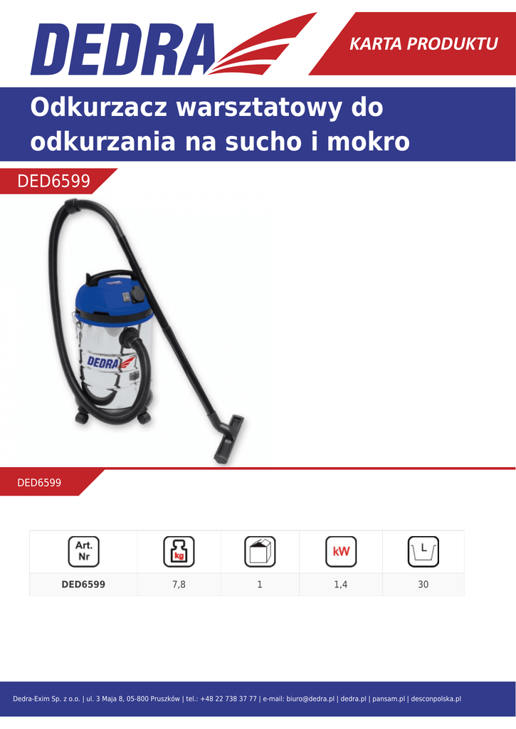 Odkurzacz warsztatowy do odkurzania na sucho i mokro DED6599 DED6599 DED6599 7,8 1 1,4 30 Dedra-Exim Sp. z o.o. | ul. 3 Maja 8, 05-800 Pruszków | tel.: +48 22 738 37 77 | e-mail: [email protected] | dedra.pl | pansam.pl | desconpolska.pl