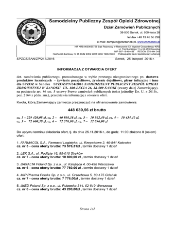 Samodzielny Publiczny Zespół Opieki Zdrowotnej Dział Zamówień Publicznych 38-500 Sanok, ul. 800-lecia 26 tel./fax +48 13 46 56 290 e-mail: [email protected], www.zozsanok.pl NR KRS 0000059726 Sąd Rejonowy w Rzeszowie XII Wydział Gospodarczy KRS ul. Trembeckiego 11 a 35-959 Rzeszów NIP 687-16-40-438 REGON 370 444 345 Rachunek bankowy nr 85 8642 0002 2001 0060 1685 0003 Podkarpacki Bank Spółdzielczy o/Sanok SPZOZ/SAN/ZP/213/2016 Sanok, 25 listopad 2016 r. INFORMACJA Z OTWARCIA OFERT dot. zamówienia publicznego, prowadzonego w trybie przetargu nieograniczonego pn. dostawa produktów leczniczych - żywienie pozajelitowe, żywienie dojelitowe, płyny infuzyjne i inne dla SPZOZ w Sanoku SPZOZ/PN/34/2016 SAMODZIELNY PUBLICZNY ZESPÓŁ OPIEKI ZDROWOTNEJ W SANOKU UL. 800-LECIA 26, 38-500 SANOK (zwany dalej Zamawiający), na podstawie art. 86 ust. 5 ustawy Prawo zamówień publicznych (tekst jednolity Dz. U. z 2015r., poz. 2164 z późn. zm.), przedstawia informację z otwarcia ofert. Kwota, którą Zamawiający zamierza przeznaczyć na sfinansowanie zamówienia: 448 639,56 zł brutto cz. 1 – 229 420,08 zł, cz. 2 – 40 930,38 zł, cz. 3 – 10 562,40 zł, cz. 4 – 10 454,40 zł, cz. 5 – 72 600,30 zł, cz. 6 – 72 576,00 zł, cz. 7 – 12 096,00 zł Do upływu terminu składania ofert, tj. do dnia 25.11.2016 r., do godz. 11:00 złożono 8 (osiem) ofert: 1. FARMACOL S.A., Farmacol Logistyka, ul. Rzepakowa 2, 40-541 Katowice cz. nr 5 - cena oferty brutto: 73 576,31zł , termin dostawy 1 dzień 2. LEK S.A., ul. Podlipie 16, 95-010 Stryków cz. nr 7 - cena oferty brutto: 10 800,00 zł , termin dostawy 1 dzień 3. BAXALTA Poland Sp. z o.o., ul. Książęca 4, 00-498 Warszawa cz. nr 6 - cena oferty brutto: 77 760,00 zł , termin dostawy 1 dzień 4. MIP Pharma Polska Sp. z o.o., ul. Orzechowa 5, 80-175 Gdańsk cz. nr 7 - cena oferty brutto: 7 776,00zł , termin dostawy 1 dzień 5. IMED Poland Sp. z o.o., ul. Puławska 314, 02-819 Warszawa cz. nr 6 - cena oferty brutto: 43 200,00zł , termin dostawy 1 dzień Strona 1z2 6. PPHU „Specjał” Sp. z o.o, ul. J. Pawła II 80/5, 00-175 Warszawa Hurtownia Farmaceutyczna, ul. B. Żeleńskiego 5, 35-105 Rzeszów cz. nr 1 - cena oferty brutto: 233 715,52zł , termin dostawy 1 dzień cz. nr 2 - cena oferty brutto: 33 232,86zł , termin dostawy 1 dzień cz. nr 3 - cena oferty brutto: 10 657,44zł , termin dostawy 1 dzień cz. nr 4 - cena oferty brutto: 10 330,85zł , termin dostawy 1 dzień cz. nr 7 - cena oferty brutto: 11 046,24zł , termin dostawy 1 dzień 7. PGF URTICA Sp. z o.o. LIDER, ul. Krzemieniecka 120, 54-613 Wrocław PGF S.A., ul. Zbąszyńska 3, 91-342 Łódź cz. nr 2 - cena oferty brutto: 33 149,99zł , termin dostawy 1dzień cz. nr 5 - cena oferty brutto: 75 396,29zł , termin dostawy 1dzień cz. nr 6 - cena oferty brutto: 78 140,16zł , termin dostawy 1dzień 8. OPTIFARMA Sp. z o.o., S.K.,ul. Zielona 4, 05-830 Wolica cz. nr 7 - cena oferty brutto: 8 912,16zł , termin dostawy 1 dzień Termin wykonania zamówienia oraz warunki płatności:zgodnie z ustanowionymi w Specyfikacji Istotnych Warunków Zamówienia. Wykonawca w terminie 3 dni od zamieszczenia na stronie internetowej niniejszej informacji przekazuje zamawiającemu oświadczenie o przynależności lub braku przynależności do tej samej grupy kapitałowej Strona 2z2