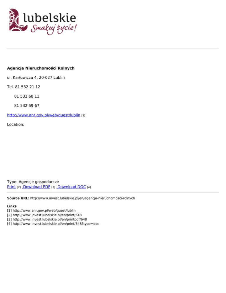 Agencja Nieruchomości Rolnych ul. Karłowicza 4, 20-027 Lublin Tel. 81 532 21 12 81 532 68 11 81 532 59 67 http://www.anr.gov.pl/web/guest/lublin [1] Location: Type: Agencje gospodarcze Print [2] Download PDF [3] Download DOC [4] Source URL: http://www.invest.lubelskie.pl/en/agencja-nieruchomosci-rolnych Links [1] http://www.anr.gov.pl/web/guest/lublin [2] http://www.invest.lubelskie.pl/en/print/648 [3] http://www.invest.lubelskie.pl/en/printpdf/648 [4] http://www.invest.lubelskie.pl/en/print/648?type=doc