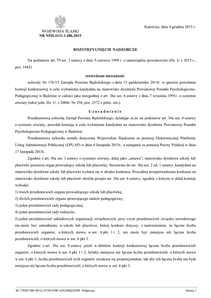 Katowice, dnia 4 grudnia 2015 r. WOJEWODA ŚLĄSKI NR NPII.4131.1.486.2015 ROZSTRZYGNIĘCIE NADZORCZE Na podstawie art. 79 ust. 1 ustawy z dnia 5 czerwca 1998 r. o samorządzie powiatowym (Dz. U z 2015 r., poz. 1445) stwierdzam nieważność uchwały Nr 176/15 Zarządu Powiatu Będzińskiego z dnia 13 października 2015r. w sprawie powołania komisji konkursowej w celu wyłonienia kandydata na stanowisko dyrektora Powiatowej Poradni PsychologicznoPedagogicznej w Będzinie w całości jako niezgodnej z art. 36a ust. 6 ustawy z dnia 7 września 1991r. o systemie oświaty (tekst jedn. Dz. U. z 2004r. Nr 256, poz. 2572 z późn. zm.). Uzasadnienie Przedmiotową uchwałą Zarząd Powiatu Będzińskiego, działając m.in. na podstawie art. 36a ust. 6 ustawy o systemie oświaty, powołał komisję w celu wyłonienia kandydata na stanowisko dyrektora Powiatowej Poradni Psychologiczno-Pedagogicznej w Będzinie. Przedmiotowa uchwała została doręczona Wojewodzie Śląskiemu za pomocą Elektronicznej Platformy Usług Administracji Publicznej (EPUAP) w dniu 6 listopada 2015r., a następnie za pomocą Poczty Polskiej w dniu 17 listopada 2015r. Zgodnie z art. 36a ust. 1 ustawy o systemie oświaty, dalej jako „ustawa”, stanowisko dyrektora szkoły lub placówki powierza organ prowadzący szkołę lub placówkę. Stosownie do art. 36a ust. 2 zd. 1 ustawy, kandydata na stanowisko dyrektora szkoły lub placówki wyłania się w drodze konkursu. Procedurę przeprowadzenia konkursu na stanowisko dyrektora szkoły lub placówki określa przepis art. 36a ust. 6 ustawy, zgodnie z którym w skład komisji wchodzi: 1) trzech przedstawicieli organu prowadzącego szkołę lub placówkę, 2) dwóch przedstawicieli organu sprawującego nadzór pedagogiczny, 3) jeden przedstawiciel rady pedagogicznej, 4) jeden przedstawiciel rady rodziców, 5) jeden przedstawiciel zakładowych organizacji związkowych, przy czym przedstawiciel związku zawodowego nie może być zatrudniony w szkole lub placówce, której konkurs dotyczy, z zastrzeżeniem, że łączna liczba przedstawicieli organów, o których mowa w ust. 6 pkt 1 i 2, nie może być mniejsza niż łączna liczba przedstawicieli, o których mowa w ust. 6 pkt 3. Zgodnie z art. 36a ust. 8 ustawy jeżeli w składzie komisji konkursowej łączna liczba przedstawicieli organów, o których mowa w ust. 6 pkt 1 i 2, byłaby mniejsza niż łączna liczba przedstawicieli, o których mowa w ust. 6 pkt 3, liczbę przedstawicieli tych organów zwiększa się proporcjonalnie, tak aby ich łączna liczba nie była mniejsza niż łączna liczba przedstawicieli, o których mowa w ust. 6 pkt 3. ————————————————————————————————————————————————————————— Id: 73EB17BF-8FA2-471B-970F-628248B22FDF. Podpisany Strona 1 Zadania i kompetencje organu prowadzącego, określone w art. 36a ust. 1 i 6 ustawy, w przypadku szkół i placówek prowadzonych przez jednostki samorządu terytorialnego wykonuje odpowiednio: wójt (burmistrz, prezydent miasta), zarząd powiatu, zarząd województwa (art. 5c pkt 2 ustawy). Jednocześnie Ustawodawca w art. 36a ust. 12 ustawy przyznał ministrowi właściwemu do spraw oświaty i wychowania kompetencje do określenia, w drodze rozporządzenia, regulaminu konkursu na stanowisko dyrektora szkoły lub placówki oraz trybu prac komisji konkursowej z uwzględnieniem w szczególności sposobu ogłaszania konkursu oraz sposobu nadzorowania prawidłowości postępowania konkursowego przez organ prowadzący szkołę lub placówkę. Minister Edukacji Narodowej, realizując delegację ustawową, wydał w dniu 8 kwietnia 2010r. rozporządzenie w sprawie regulaminu konkursu na stanowisko dyrektora publicznej szkoły lub publicznej placówki oraz trybu prac komisji konkursowej (Dz. U. z 2010r. Nr 60, poz. 373 ze zm.). Przepis § 2 przywołanego rozporządzenia stanowi, iż "organ prowadzący publiczne przedszkole, publiczną szkołę lub publiczną placówkę wyznacza przewodniczącego komisji konkursowej (…), który kieruje jej pracami". Do wyłącznych kompetencji organu prowadzącego publiczne przedszkole, publiczną szkołę lub publiczną placówkę należy również zatwierdzenie konkursu albo unieważnienie konkursu i zarządzenie ponownego jego przeprowadzenia, w przypadku stwierdzenia nieprawidłowości, o których mowa w § 8 ust. 2 rozporządzenia. Działając w oparciu o ww. przepisy ustawowe i wykonawcze Zarząd Powiatu Będzińskiego określił w § 1 przedmiotowej uchwały skład komisji konkursowej powołanej do przeprowadzenia postępowania konkursowego na stanowisko dyrektora Powiatowej Poradni Psychologiczno-Pedagogicznej w Będzinie. Po analizie przedmiotowej uchwały organ nadzoru stwierdził, że narusza ona obowiązujące przepisy prawa. W skład komisji zostali bowiem powołani członkowie Zarządu Powiatu Będzińskiego: Pan Robert Szpinda oraz Pan Arkadiusz Watoła (Starosta Będziński) – jako przewodniczący komisji. Taki skład komisji konkursowej jest niezgodny, zdaniem organu nadzoru, z przepisem art. 36a ust. 6 pkt 1 ustawy. W opinii organu nadzoru analiza przepisów ustawy o systemie oświaty prowadzi do wniosku, iż osoba pełniąca funkcję organu prowadzącego szkołę nie może być członkiem komisji powołanej celem przeprowadzenia konkursu na dyrektora szkoły (placówki). Jak wskazano w wyroku Naczelnego Sądu Administracyjnego z dnia 14 maja 2013r. (sygn. akt I OSK 324/13, Centralna Baza Orzeczeń Sądów Administracyjnych) pod pojęciem organu administracji publicznej należy rozumieć element (jednostkę) struktury organizacyjnej podmiotu realizującego zadania z zakresu administracji publicznej, posiadający swój substrat osobowy (w postaci osoby lub osób piastujących funkcję takiego organu), którego działania i zaniechania przypisywane są danemu podmiotowi (np. państwu lub jednostce samorządu teryto