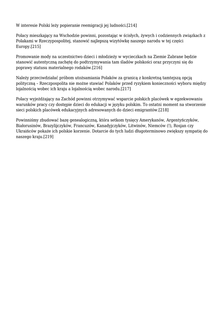 W interesie Polski leży popieranie reemigracji jej ludności.[214] Polacy mieszkający na Wschodzie powinni, pozostając w ścisłych, żywych i codziennych związkach z Polakami w Rzeczypospolitej, stanowić najlepszą wizytówkę naszego narodu w tej części Europy.[215] Promowanie mody na uczestnictwo dzieci i młodzieży w wycieczkach na Ziemie Zabrane będzie stanowić autentyczną zachętę do podtrzymywania tam śladów polskości oraz przyczyni się do poprawy statusu materialnego rodaków.[216] Należy przeciwdziałać próbom utożsamiania Polaków za granicą z konkretną tamtejszą opcją polityczną – Rzeczpospolita nie możne stawiać Polaków przed ryzykiem konieczności wyboru między lojalnością wobec ich kraju a lojalnością wobec narodu.[217] Polacy wyjeżdżający na Zachód powinni otrzymywać wsparcie polskich placówek w egzekwowaniu warunków pracy czy dostępie dzieci do edukacji w języku polskim. To ostatni moment na stworzenie sieci polskich placówek edukacyjnych adresowanych do dzieci emigrantów.[218] Powinniśmy zbudować bazę genealogiczną, która setkom tysięcy Amerykanów, Argentyńczyków, Białorusinów, Brazylijczyków, Francuzów, Kanadyjczyków, Litwinów, Niemców (!), Rosjan czy Ukraińców pokaże ich polskie korzenie. Dotarcie do tych ludzi długoterminowo zwiększy sympatię do naszego kraju.[219]