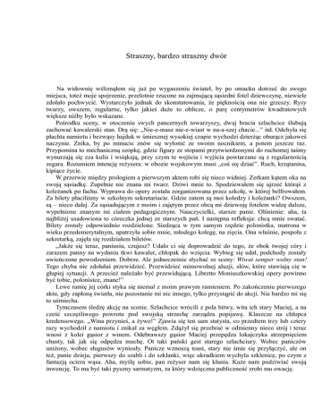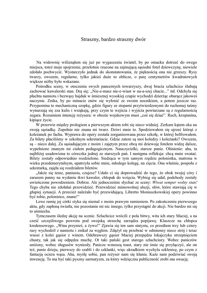 Straszny, bardzo straszny dwór Na widownię wśliznąłem się już po wygaszeniu świateł, by po omacku dotrzeć do swego miejsca, toteż moje spojrzenie, przelotnie rzucone na zajmującą sąsiedni fotel dziewczynę, niewiele zdołało pochwycić. Wystarczyło jednak do skonstatowania, że pięknością ona nie grzeszy. Rysy twarzy, owszem, regularne, tylko jakieś duże to oblicze, o parę centymetrów kwadratowych większe niżby było wskazane. Pośrodku sceny, w otoczeniu swych pancernych towarzyszy, dwaj bracia szlachcice ślubują zachować kawalerski stan. Drą się: „Nie-e-masz nie-e-wiast w na-a-szej chacie...” itd. Odchyla się płachta namiotu i bezwąsy hajduk w śmiesznej wysokiej czapie wychodzi dzierżąc oburącz jakoweś naczynie. Znika, by po minucie znów się wyłonić ze swoim nocnikiem, a potem jeszcze raz. Przypomina to mechaniczną szopkę, gdzie figury ze stopami przytwierdzonymi do ruchomej taśmy wynurzają się zza kulis i wsiąkają, przy czym te wejścia i wyjścia powtarzane są z regularnością zegara. Rozumiem intencję reżysera: w obozie wojskowym musi „coś się dziać”. Ruch, krzątanina, kipiące życie. W przerwie między prologiem a pierwszym aktem robi się nieco widniej. Zerkam kątem oka na swoją sąsiadkę. Zupełnie nie znana mi twarz. Dziwi mnie to. Spodziewałem się ujrzeć którąś z koleżanek po fachu. Wyprawa do opery została zorganizowana przez szkołę, w której belfrowałem. Za bilety płaciliśmy w szkolnym sekretariacie. Gdzie zatem są moi koledzy i koleżanki? Owszem, są – nieco dalej. Za sąsiadującym z moim i zajętym przez obcą mi dziewoję fotelem widzę dalsze, wypełnione znanym mi ciałem pedagogicznym. Nauczycielki, starsze panie. Olśnienie: aha, ta najbliżej usadowiona to córeczka jednej ze starszych pań. I następna refleksja: chcą mnie swatać. Bilety zostały odpowiednio rozdzielone. Siedząca w tym samym rzędzie polonistka, matrona w wieku przedemerytalnym, upatrzyła sobie mnie, młodego kolegę, na zięcia. Ona właśnie, pospołu z sekretarką, zajęła się rozdziałem biletów. „Jakże się teraz, paniusiu, czujesz? Udało ci się doprowadzić do tego, że obok twojej córy i zarazem panny na wydaniu tkwi kawaler, chłopak do wzięcia. Wybieg się udał, podchody zostały uwieńczone powodzeniem. Dobrze. Ale jednocześnie słychać ze sceny: Wiwat semper wolny stan! Tego chyba nie zdołałaś przewidzieć. Przewidzieć mimowolnej aluzji, słów, które stawiają cię w głupiej sytuacji. A przecież należało być przewidującą. Libretto Moniuszkowskiej opery powinno być tobie, polonistce, znane!” Lewe ramię jej córki styka się niemal z moim prawym ramieniem. Po zakończeniu pierwszego aktu, gdy zapłoną światła, nie pozostanie mi nic innego, tylko przystąpić do akcji. Nie bardzo mi się to uśmiecha. Tymczasem śledzę akcję na scenie. Szlachcice wrócili z pola bitwy, wita ich stary Maciej, a na cześć szczęśliwego powrotu pod swojską strzechę zarządza popijawę. Klaszcze na chłopca kredensowego. „Wina przynieś, a żywo!” Zjawia się ten sam statysta, co przedtem trzy lub cztery razy wychodził z namiotu i znikał za węgłem. Zdążył się przebrać w odmienny nieco strój i teraz wnosi z kolei gąsior z winem. Odebrawszy gąsior Maciej przepędza lokajczyka strzepnięciem chusty, tak jak się odpędza muchę. Ot taki pański gest starego szlachciury. Wobec paniczów uniżony, wobec sługusów wyniosły. Panicze wznoszą toast, stary nie śmie się przyłączyć, ale on też, panie dzieju, pierwszy do szabli i do szklanki, więc ukradkiem wychyla szklenicę, po czym z fantazją ociera wąsa. Aha, myślę sobie, pan reżyser nam się kłania. Każe nam podziwiać swoją inwencję. To ma być taki pyszny sarmatyzm, za który wdzięczna publiczność zrobi mu owację. Na scenie zjawia się Cześnikowa i próbuje zeswatać braci ze swoimi pupilkami. Ci jako zaprzysiężeni kawalerowie uciekają przed nią w drugi kraniec sceny. Jeszcze jedna gierka pana reżysera. Gdzież się podziała niedawna rycerska postawa? Nie ma już rycerzy, a tylko dwaj speszeni gówniarze, z podkulonymi ogonami zmiatający przed niewiastą. Im dłużej trwało przedstawienie, im bardziej naprzykrzały się ciury z nocnikami i szlachciury ze szklenicami, tym bardziej rosła moja wściekłość na myśl o szkolnej intrydze, tym większą niechęć czułem do siedzącej obok dziewczyny. Im bardziej byłem niechętny wobec dziewczyny, im bardziej wściekły na jej przedsiębiorczą matkę, istną Cześnikową, tym większym obrzydzeniem przejmowały mnie brewerie sceniczne. Typowe błędne koło. Koniec pierwszego aktu, oklaski, kurtyna opada, rozbłyskują światła. Czmycham wśród tego zamieszania, mimo woli naśladując strwożonych szlachciców. Schodami w dół, prosto do szatni. Z płaszczem na ręku – do wyjścia. Czym prędzej zatrzasnąć za sobą drzwi strasznego dworu.
