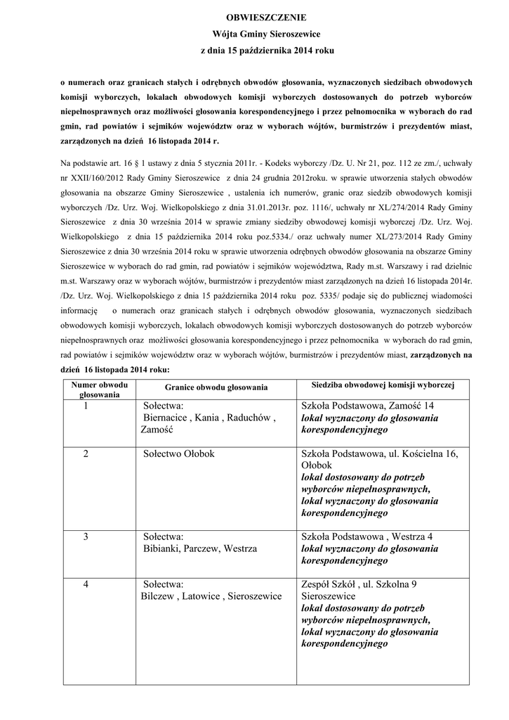 OBWIESZCZENIE Wójta Gminy Sieroszewice z dnia 15 października 2014 roku o numerach oraz granicach stałych i odrębnych obwodów głosowania, wyznaczonych siedzibach obwodowych komisji wyborczych, lokalach obwodowych komisji wyborczych dostosowanych do potrzeb wyborców niepełnosprawnych oraz możliwości głosowania korespondencyjnego i przez pełnomocnika w wyborach do rad gmin, rad powiatów i sejmików województw oraz w wyborach wójtów, burmistrzów i prezydentów miast, zarządzonych na dzień 16 listopada 2014 r. Na podstawie art. 16 § 1 ustawy z dnia 5 stycznia 2011r. - Kodeks wyborczy /Dz. U. Nr 21, poz. 112 ze zm./, uchwały nr XXII/160/2012 Rady Gminy Sieroszewice z dnia 24 grudnia 2012roku. w sprawie utworzenia stałych obwodów głosowania na obszarze Gminy Sieroszewice , ustalenia ich numerów, granic oraz siedzib obwodowych komisji wyborczych /Dz. Urz. Woj. Wielkopolskiego z dnia 31.01.2013r. poz. 1116/, uchwały nr XL/274/2014 Rady Gminy Sieroszewice z dnia 30 września 2014 w sprawie zmiany siedziby obwodowej komisji wyborczej /Dz. Urz. Woj. Wielkopolskiego z dnia 15 października 2014 roku poz.5334./ oraz uchwały numer XL/273/2014 Rady Gminy Sieroszewice z dnia 30 września 2014 roku w sprawie utworzenia odrębnych obwodów głosowania na obszarze Gminy Sieroszewice w wyborach do rad gmin, rad powiatów i sejmików województwa, Rady m.st. Warszawy i rad dzielnic m.st. Warszawy oraz w wyborach wójtów, burmistrzów i prezydentów miast zarządzonych na dzień 16 listopada 2014r. /Dz. Urz. Woj. Wielkopolskiego z dnia 15 października 2014 roku poz. 5335/ podaje się do publicznej wiadomości informację o numerach oraz granicach stałych i odrębnych obwodów głosowania, wyznaczonych siedzibach obwodowych komisji wyborczych, lokalach obwodowych komisji wyborczych dostosowanych do potrzeb wyborców niepełnosprawnych oraz możliwości głosowania korespondencyjnego i przez pełnomocnika w wyborach do rad gmin, rad powiatów i sejmików województw oraz w wyborach wójtów, burmistrzów i prezydentów miast, zarządzonych na dzień 16 listopada 2014 roku: Numer obwodu głosowania Granice obwodu głosowania Siedziba obwodowej komisji wyborczej 1 Sołectwa: Biernacice , Kania , Raduchów , Zamość Szkoła Podstawowa, Zamość 14 lokal wyznaczony do głosowania korespondencyjnego 2 Sołectwo Ołobok Szkoła Podstawowa, ul. Kościelna 16, Ołobok lokal dostosowany do potrzeb wyborców niepełnosprawnych, lokal wyznaczony do głosowania korespondencyjnego 3 Sołectwa: Bibianki, Parczew, Westrza Szkoła Podstawowa , Westrza 4 lokal wyznaczony do głosowania korespondencyjnego 4 Sołectwa: Bilczew , Latowice , Sieroszewice Zespół Szkół , ul. Szkolna 9 Sieroszewice lokal dostosowany do potrzeb wyborców niepełnosprawnych, lokal wyznaczony do głosowania korespondencyjnego 5 Sołectwo Strzyżew Szkoła Podstawowa , ul. Anny Wiesiołowskiej 1,Strzyżew lokal dostosowany do potrzeb wyborców niepełnosprawnych, lokal wyznaczony do głosowania korespondencyjnego 6 Sołectwa: Masanów , Namysłaki , Wielowieś Zespół Szkół, ul. Grabowska 2 , Wielowieś lokal wyznaczony do głosowania korespondencyjnego 7 Sołectwa: Psary, Rososzyca , Sławin Szkoła Podstawowa, ul. Kaliska 3 , Rososzyca lokal wyznaczony do głosowania korespondencyjnego 8 Dom Pomocy Społecznej w Psarach Dom Pomocy Społecznej ul. Kaliska 3 Psary Głosowanie odbędzie się w wyznaczonych siedzibach obwodowych komisji wyborczych w dniu 16 listopada 2014 r. bez przerwy od godziny 700 do godziny 2100 . Wyborca, na swój pisemny wniosek wniesiony do Urzędu Gminy Sieroszewice najpóźniej do dnia 12 listopada 2014 r., jest dopisywany do spisu wyborców w wybranym przez siebie obwodzie głosowania na obszarze okręgu wyborczego właściwego dla jego stałego zamieszkania. Wyborca niepełnosprawny, na swój pisemny wniosek wniesiony do Urzędu Gminy Sieroszewice najpóźniej do dnia 12 listopada 2014 r., jest dopisywany do spisu wyborców w wybranym przez siebie obwodzie głosowania na obszarze gminy właściwej ze względu na miejsce jego stałego zamieszkania, jeżeli na obszarze okręgu wyborczego właściwego dla jego stałego zamieszkania nie ma siedziby obwodowej komisji wyborczej dostosowanej do potrzeb wyborców niepełnosprawnych. Wyborca niepełnosprawny o znacznym lub umiarkowanym stopniu niepełnosprawności może zgłosić zamiar głosowania korespondencyjnego wójtowi gminy najpóźniej do dnia 27 października 2014 r. Wyborca niepełnosprawny o znacznym lub umiarkowanym stopniu niepełnosprawności oraz wyborca, który najpóźniej w dniu głosowania kończy 75 lat, może złożyć do Urzędu Gminy Sieroszewice , najpóźniej do dnia 7 listopada 2014 r. wniosek o sporządzenie aktu pełnomocnictwa do głosowania. Wójt Gminy Sieroszewice /-/ Czesław Berkowski
