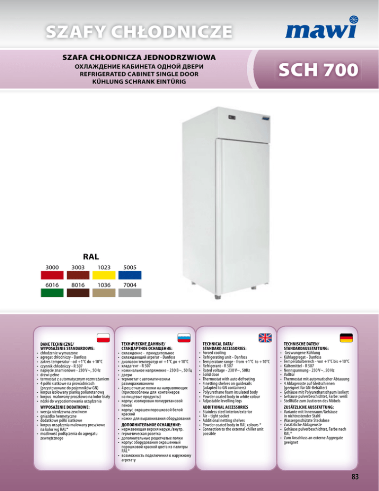 SZAFY CHŁODNICZE SZAFA CHŁODNICZA JEDNODRZWIOWA ОХЛАЖДЕНИЕ КАБИНЕТА ОДНОЙ ДВЕРИ REFRIGERATED CABINET SINGLE DOOR KÜHLUNG SCHRANK EINTÜRIG SCH 700 RAL • • • • • • • • • • • • • • • • 3000 3003 1023 5005 6016 8016 1036 7004 DANE TECHNICZNE/ WYPOSAŻENIE STANDARDOWE: chłodzenie wymuszone agregat chłodniczy - Danfoss zakres temperatur - od +1°C do +10°C czynnik chłodniczy - R 507 napięcie znamionowe - 230 V~, 50Hz drzwi pełne termostat z automatycznym rozmrażaniem 4 półki siatkowe na prowadnicach (przystosowane do pojemników GN) korpus izolowany pianką poliuretanową korpus malowany proszkowo na kolor biały nóżki do wypoziomowania urządzenia WYPOSAŻENIE DODATKOWE: wersja nierdzewna zew/wew gniazdko hermetyczne dodatkowe półki siatkowe korpus urządzenia malowany proszkowo na kolor wg RAL* możliwość podłączenia do agregatu zewnętrznego • • • • • • • • • • • • • • • • ТЕХНИЧЕСКИЕ ДАННЫЕ/ СТАНДАРТНОЕ ОСНАЩЕНИЕ: охлаждение - принудительное охлаждающий агрегат - Danfoss диапазон температур от +1°C до +10°C хладагент - R 507 номинальное напряжение - 230 В~, 50 Гц двери термостат с автоматическим размораживанием 4 решетчатые полки на направляющих (приспособлены для контейнеров на пищевые продукты) корпус изолирован полиуретановой пеной корпус окрашен порошковой белой краской ножки для выравнивания оборудования ДОПОЛНИТЕЛЬНОЕ ОСНАЩЕНИЕ: нержавеющая версия наруж./внутр. герметическая розетка дополнительные решетчатые полки корпус оборудования окрашенный порошковой краской цвета из палитры RAL* возможность подключения к наружному агрегату • • • • • • • • • • • • • • • • TECHNICAL DATA/ STANDARD ACCESSORIES: Forced cooling Refrigerating unit - Danfoss Temperature range - from +1°C to +10°C Refrigerant - R 507 Rated voltage - 230 V~, 50Hz Solid door Thermostat with auto defrosting 4 netting shelves on guiderails (adapted to GN containers) Polyurethane foam insulated body Powder coated body in white colour Adjustable levelling legs ADDITIONAL ACCESSORIES Stainless steel interior/exterior Air - tight socket Additional netting shelves Powder coated body in RAL colours * Connection to the external chiller unit possible • • • • • • • • • • • • • • • • TECHNISCHE DATEN/ STANDARDAUSSTATTUNG: Gezwungene Kühlung Kühlaggregat - Danfoss Temperaturbereich - von +1°C bis +10°C Kältemittel - R 507 Nennspannung - 230 V~, 50 Hz Volltür Thermostat mit automatischer Abtauung 4 Ablageroste auf Gleitschienen (geeignet für GN-Behälter) Gehäuse mit Polyurethanschaum isoliert Gehäuse pulverbeschichtet, Farbe: weiß Stellfüße zum Justieren des Möbels ZUSÄTZLICHE AUSSTATTUNG: Variante mit Innenraum/Gehäuse in nichtrostender Stahl Wassergeschützte Steckdose Zusätzliche Ablageroste Gehäuse pulverbeschichtet, Farbe nach RAL* Zum Anschluss an externe Aggregate geeignet 83 SZAFY CHŁODNICZE SCH 700 SZAFA CHŁODNICZA JEDNODRZWIOWA ОХЛАЖДЕНИЕ КАБИНЕТА ОДНОЙ ДВЕРИ REFRIGERATED CABINET SINGLE DOOR KÜHLUNG SCHRANK EINTÜRIG Model / Мoдeль / Model / Modell SCH 700 Wymiary (długość, szerokość, wysokość) [mm] Размеры (длина, ширина, высота) [мм] Size (Length, Width, Height) [mm] Abmessungen (Länge, Breite, Höhe) [mm] 665 x 775 (820) x 2015 Znamionowa wydajność chłodnicza [W] Номинальная охлаждающая мощность [Вт] Rated cooling capacity [W] Nennkühlleistung [W] 634 Nominalne dobowe zużycie energii [kWh] Номинальное суточное потребление энергии [кВт-час] Rated daily energy consumption [kWh] Nenntagesstromverbrauch [kWh] 4.0 Pojemność komory użytkowej [dm³] Емкость рабочей камеры [дм³] Usable compartment capacity [dm³] Nutzinhalt [dm³] 540 Powierzchnia ekspozycyjna [m²] Экспозиционная поверхность [м²] Display space [m²] Auflagefläche [m²] 1.6 Moc świetlówek [W] Мощность лампочек [Вт] Fluorescent lamp power [W] Leistung der Lichtstoffröhre [W] - Maksymalne obciążenie półki [kg] Максимальная нагрузка на полку [кг] Maximum shelf capacity [kg] Maximale Belastung der Zwischenablagen [kg] 30 Powyższe dane zostały podane dla temp. otoczenia 25°C oraz wilgotności względnej 60%. / Вышеуказанные данные представлены для температуры окружающей среды 25°С и относительной влажности 60%. / The above data relate to ambient temperature of 25°C and relative humidity of 60%. / Die oben angegebenen Daten gelten für eine Lufttemperatur von 25°C und relative Feuchtigkeit von 60%. Producent zastrzega sobie prawo wprowadzania zmian parametrów urządzenia bez wcześniejszego uprzedzenia. / Производитель оставляет за собой право на внесения изменений в параметры оборудования без предварительного уведомления. / The manufacturer reserves the right to make amendments regarding technical parameters without notice. / Der Hersteller behält sich das Recht vor, Änderungen der technischen Parameter ohne Ankündigung vorzunehmen. 84 „MAWI” M. Piszczek i W. Dziedzic S. J. ul. Prz