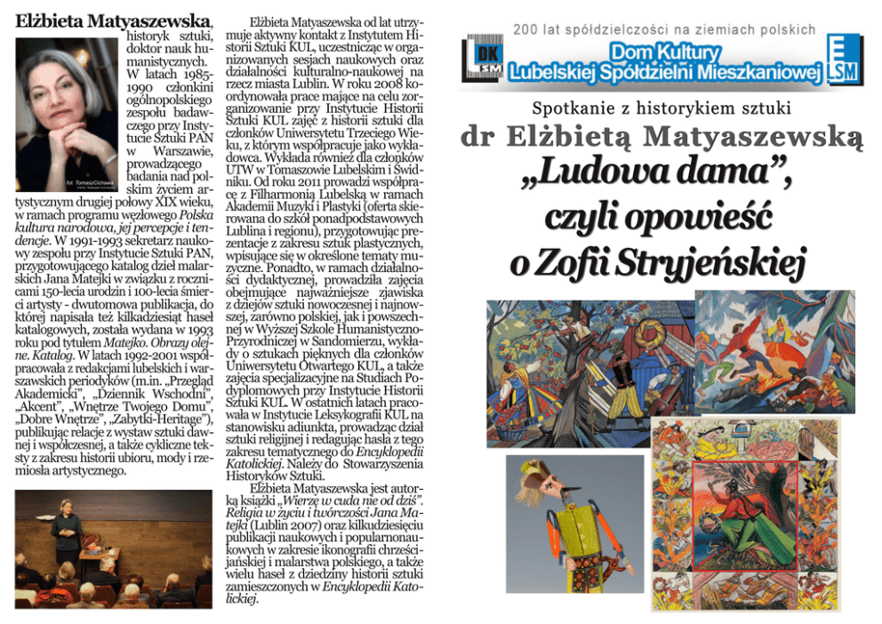Elżbieta Matyaszewska, historyk sztuki, doktor nauk hu manistycznych. W latach 1985 1990 członkini ogólnopolskiego zespołu badaw czego przy Insty tucie Sztuki PAN w Warszawie, prowadzącego badania nad pol skim życiem ar tystycznym drugiej połowy XIX wieku, w ramach programu węzłowego Polska kultura narodowa, jej percepcje i ten dencje. W 19911993 sekretarz nauko wy zespołu przy Instytucie Sztuki PAN, przygotowującego katalog dzieł malar skich Jana Matejki w związku z roczni cami 150lecia urodzin i 100lecia śmier ci artysty dwutomowa publikacja, do której napisała też kilkadziesiąt haseł katalogowych, została wydana w 1993 roku pod tytułem Matejko. Obrazy olej ne. Katalog. W latach 19922001 współ pracowała z redakcjami lubelskich i war szawskich periodyków (m.in. „Przegląd Akademicki”, „Dziennik Wschodni”, „Akcent”, „Wnętrze Twojego Domu”, „Dobre Wnętrze”, „ZabytkiHeritage”), publikując relacje z wystaw sztuki daw nej i współczesnej, a także cykliczne tek sty z zakresu historii ubioru, mody i rze miosła artystycznego. fot. TomaszCichawa Elżbieta Matyaszewska od lat utrzy muje aktywny kontakt z Instytutem Hi storii Sztuki KUL, uczestnicząc w orga nizowanych sesjach naukowych oraz działalności kulturalnonaukowej na rzecz miasta Lublin. W roku 2008 ko ordynowała prace mające na celu zor ganizowanie przy Instytucie Historii Sztuki KUL zajęć z historii sztuki dla członków Uniwersytetu Trzeciego Wie ku, z którym współpracuje jako wykła dowca. Wykłada również dla członków UTW w Tomaszowie Lubelskim i Świd niku. Od roku 2011 prowadzi współpra cę z Filharmonią Lubelską w ramach Akademii Muzyki i Plastyki (oferta skie rowana do szkół ponadpodstawowych Lublina i regionu), przygotowując pre zentacje z zakresu sztuk plastycznych, wpisujące się w określone tematy mu zyczne. Ponadto, w ramach działalno ści dydaktycznej, prowadziła zajęcia obejmujące najważniejsze zjawiska z dziejów sztuki nowoczesnej i najnow szej, zarówno polskiej, jak i powszech nej w Wyższej Szkole Humanistyczno Przyrodniczej w Sandomierzu, wykła dy o sztukach pięknych dla członków Uniwersytetu Otwartego KUL, a także zajęcia specjalizacyjne na Studiach Po dyplomowych przy Instytucie Historii Sztuki KUL. W ostatnich latach praco wała w Instytucie Leksykografii KUL na stanowisku adiunkta, prowadząc dział sztuki religijnej i redagując hasła z tego zakresu tematycznego do Encyklopedii Katolickiej. Należy do Stowarzyszenia Historyków Sztuki. Elżbieta Matyaszewska jest autor ką książki „Wierzę w cuda nie od dziś”. Religia w życiu i twórczości Jana Ma tejki (Lublin 2007) oraz kilkudziesięciu publikacji naukowych i popularnonau kowych w zakresie ikonografii chrześci jańskiej i malarstwa polskiego, a także wielu haseł z dziedziny historii sztuki zamieszczonych w Encyklopedii Kato lickiej. Spotkanie z historykiem sztuki dr Elżbietą Matyaszewską „Ludowa dama”, czyli opowieść o Zofii Stryjeńskiej „Ludowa dama”, czyli opowieść o Zofii Stryjeńskiej W dziedzinie sztuki dekoracyjnej ma pani Stryjeńska więcej do powiedzenia niż ktokolwiek inny w Polsce – powiedział w ro ku 1924 Karol Frycz, oceniając stan ówcze snej sztuki polskiej. A czas był wtedy wyjąt kowy. Zaledwie parę lat wcześniej Polska od zyskała upragnioną niepodległość, toteż czyniono wielki wysiłek, by nie tylko odbu dować jej struktury państwowe, ale też jak najtrwalej umocnić tożsamość narodo wą. W tym ostat nim niezwykle po mocna okazała się sztuka, zwłaszcza ta poszukująca tzw. „stylu narodowego”, czyli sięgająca do motywów ludowych i prasłowiańskich. Jej najwybitniejsza przedstawicielką w okresie międzywojen nym była właśnie Zofia Stryjeńska, ma larka, ilustratorka, graficzka, projektantka tkanin i zabawek dla dzieci. Artystka, która całym swoim twórczym życiem zapracowa ła na tytuł „księżniczki sztuki polskiej”. Swój wyjątkowy status potwierdziła w roku 1925 podczas międzynarodowej Wystawy Sztuk Dekoracyjnych w Paryżu – była autorką de koracji Pawilonu Polskiego i otrzymała wów czas cztery Grands Prix w działach dekora cji architektonicznej, plakatu, tkaniny i ilu stracji książkowej. Wtedy została także uhonorowana Krzyżem Kawalerskim Legii Honorowej. Była postacią niezwykle barwną. Jej burzliwe życie mogłoby posłużyć za kanwę dla niejednego hollywoodzkiego filmu. Przy szła na świat w roku 1891 w rodzinie krakow skiego przedsiębiorcy Franciszka Lubańskie go, posiadającego w okresie największej pro sperity pracownię rękawiczek wraz ze sklepem oraz kilka kamienic. Jako dziecko żyła więc we względnym dobrobycie, dość wcześnie objawiając nieprzeciętną wrażliwość arty styczną i talent malarski. Zabierana niemal codziennie przez ojca na krakowski jarmark, z uwagą przypatrywała się typom ludzkim i zaczęła uwieczniać je na papierze. Z czasem uzależniła się od owej folklorystycznej tema tyki, zyskując żartobliwy przydomek „ludo wa dama”. Od początku marzyła o poważ nych studiach artystycznych, ale wówczas do państwowych Akademii Sztuk Pięknych kobiet raczej nie przyjmowano. W roku 1909 rozpoczęła więc naukę malarstwa w kra kowskiej Szkole dla Kobiet Marii Niedziel skiej, dodatkowo szlifując swój talent jako ilustratorka dwóch krakowskich czasopism. Po dwóch latach postanowiła jednak wyje chać do „Mekki” ówczesnej sztuki, czyli do Akademii Monachijskiej, wciąż jednak za mkniętej dla kobiet. W tym celu obcięła więc włosy, wdziała męski strój i zaopatrzyła się w dokumenty swego brata. Na studia zapi sała się jako… Tadeusz Grzymała. Tę mi styfikację udało się jej utrzymać przez cały rok bardzo intensywnych studiów. Kiedy ko ledzymalarze zaczęli coraz bardziej podej rzewać, że z „Tadeuszem Grzymałą” jest coś nie tak, w panice opuściła Monachium i wró ciła do Krakowa. Tutaj do