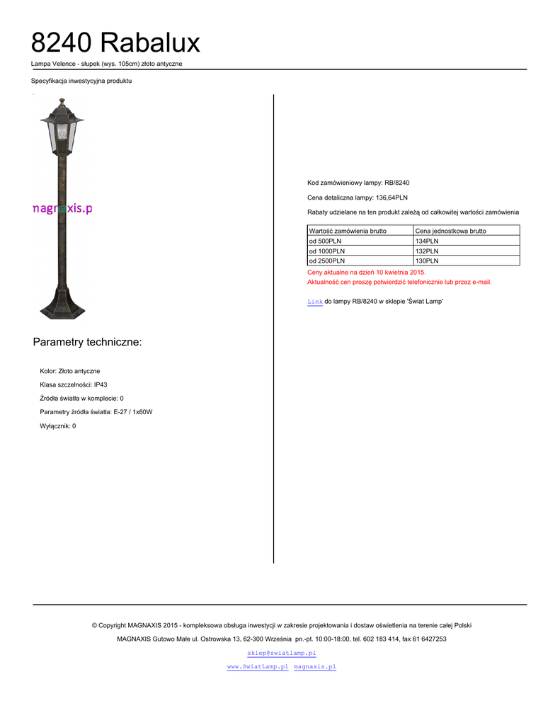 8240 Rabalux Lampa Velence - słupek (wys. 105cm) złoto antyczne Specyfikacja inwestycyjna produktu Kod zamówieniowy lampy: RB/8240 Cena detaliczna lampy: 136,64PLN Rabaty udzielane na ten produkt zależą od całkowitej wartości zamówienia Wartość zamówienia brutto Cena jednostkowa brutto od 500PLN 134PLN od 1000PLN 132PLN od 2500PLN 130PLN Ceny aktualne na dzień 10 kwietnia 2015. Aktualność cen proszę potwierdzić telefonicznie lub przez e-mail. Link do lampy RB/8240 w sklepie 'Świat Lamp' Parametry techniczne: Kolor: Złoto antyczne Klasa szczelności: IP43 Źródła światła w komplecie: 0 Parametry źródła światła: E-27 / 1x60W Wyłącznik: 0 © Copyright MAGNAXIS 2015 - kompleksowa obsługa inwestycji w zakresie projektowania i dostaw oświetlenia na terenie całej Polski MAGNAXIS Gutowo Małe ul. Ostrowska 13, 62-300 Września pn.-pt. 10:00-18:00, tel. 602 183 414, fax 61 6427253 [email protected] www.SwiatLamp.pl magnaxis.pl