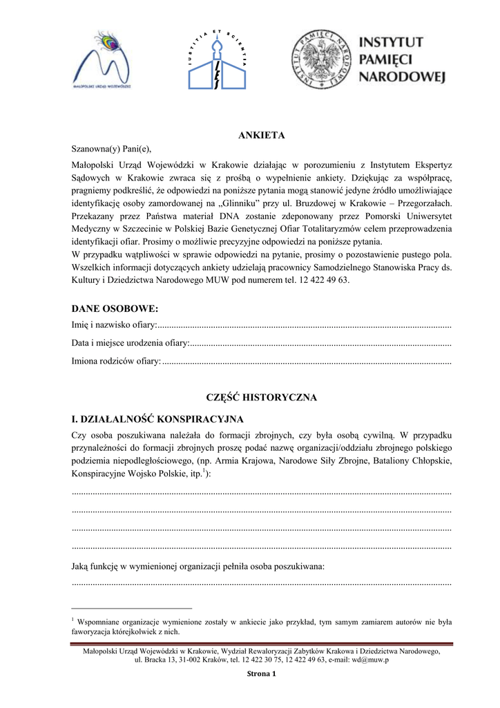 ANKIETA Szanowna(y) Pani(e), Małopolski Urząd Wojewódzki w Krakowie działając w porozumieniu z Instytutem Ekspertyz Sądowych w Krakowie zwraca się z prośbą o wypełnienie ankiety. Dziękując za współpracę, pragniemy podkreślić, że odpowiedzi na poniższe pytania mogą stanowić jedyne źródło umożliwiające identyfikację osoby zamordowanej na „Glinniku” przy ul. Bruzdowej w Krakowie – Przegorzałach. Przekazany przez Państwa materiał DNA zostanie zdeponowany przez Pomorski Uniwersytet Medyczny w Szczecinie w Polskiej Bazie Genetycznej Ofiar Totalitaryzmów celem przeprowadzenia identyfikacji ofiar. Prosimy o możliwie precyzyjne odpowiedzi na poniższe pytania. W przypadku wątpliwości w sprawie odpowiedzi na pytanie, prosimy o pozostawienie pustego pola. Wszelkich informacji dotyczących ankiety udzielają pracownicy Samodzielnego Stanowiska Pracy ds. Kultury i Dziedzictwa Narodowego MUW pod numerem tel. 12 422 49 63. DANE OSOBOWE: Imię i nazwisko ofiary:............................................................................................................................... Data i miejsce urodzenia ofiary:................................................................................................................. Imiona rodziców ofiary: ............................................................................................................................. CZĘŚĆ HISTORYCZNA I. DZIAŁALNOŚĆ KONSPIRACYJNA Czy osoba poszukiwana należała do formacji zbrojnych, czy była osobą cywilną. W przypadku przynależności do formacji zbrojnych proszę podać nazwę organizacji/oddziału zbrojnego polskiego podziemia niepodległościowego, (np. Armia Krajowa, Narodowe Siły Zbrojne, Bataliony Chłopskie, Konspiracyjne Wojsko Polskie, itp.1): .................................................................................................................................................................... .................................................................................................................................................................... .................................................................................................................................................................... .................................................................................................................................................................... Jaką funkcję w wymienionej organizacji pełniła osoba poszukiwana: .................................................................................................................................................................... 1 Wspomniane organizacje wymienione zostały w ankiecie jako przykład, tym samym zamiarem autorów nie była faworyzacja którejkolwiek z nich. Małopolski Urząd Wojewódzki w Krakowie, Wydział Rewaloryzacji Zabytków Krakowa i Dziedzictwa Narodowego, ul. Bracka 13, 31-002 Kraków, tel. 12 422 30 75, 12 422 49 63, e-mail: [email protected] Strona 1 .................................................................................................................................................................... II. OKOLICZNOŚCI ŚMIERCI Data/Miejsce/Okoliczności śmierci/zaginięcia: .................................................................................................................................................................... .................................................................................................................................................................... .................................................................................................................................................................... .................................................................................................................................................................... .................................................................................................................................................................... .................................................................................................................................................................... .................................................................................................................................................................... .................................................................................................................................................................... .................................................................................................................................................................... Małopolski Urząd Wojewódzki w Krakowie, Wydział Rewaloryzacji Zabytków Krakowa i Dziedzictwa Narodowego, ul. Bracka 13, 31-002 Kraków, tel. 12 422 30 75, 12 422 49 63, e-mail: [email protected] Strona 2 CZĘŚĆ MEDYCZNA DANE ZGŁASZAJĄCEGO Imię nazwisko ofiary Stopień pokrewieństwa (proszę rozpisać jak najdokładniej) Czy posiadają Państwo przedmioty osobiste ofiary? (jeśli tak to jakie) OŚWIADCZENIA Czy w ostatnim czasie Pani/Pan mieli przetaczaną krew? Czy była/był Pani/Pan poddani zabiegowi przeszczepu narządów? Inne żyjące osoby spokrewnione z ofiarą (proszę podać dane kontaktowe) TAK/NIE TAK/NIE CECHY SZCZEGÓLNE OSOBY POSZUKIWANEJ Wiek w chwili śmierci Wzrost Karnacja Kolor oczu Kolor włosów Cechy charakterystyczne uzębienia (ubytki, mosty, wypełnienia etc.) Czy poszukiwany miał charakterystyczne zmiany Małopolski Urząd Wojewódzki w Krakowie, Wydział Rewaloryzacji Zabytków Krakowa i Dziedzictwa Narodowego, ul. Bracka 13, 31-002 Kraków, tel. 12 422 30 75, 12 422 49 63, e-mail: [email protected] Strona 3 szkieletu (złamania, choroby układu szkieletowego, postrzały, operacje, amputacje etc.) Inne cechy szczególne Czy posiadają Państwo zdjęcia po