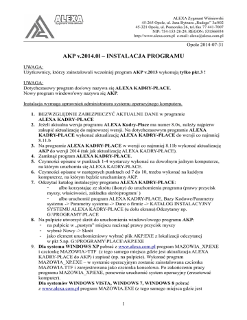 ALEXA Zygmunt Wiśniewski 45-265 Opole, ul. Jana Bytnara „Rudego” 3a/802 45-321 Opole, ul. Pomorska 26, tel./fax 77 441-7007 NIP: 754-153-28-29, REGON: 531566934 http://www.alexa.com.pl e-mail: [email protected] Opole 2014-07-31 AKP v.2014.0l – INSTALACJA PROGRAMU UWAGA: Użytkownicy, którzy zainstalowali wcześniej program AKP v.2013 wykonują tylko pkt.3 ! UWAGA: Dotychczasowy program dos'owy nazywa się ALEXA KADRY-PŁACE. Nowy program windows'owy nazywa się AKP. Instalacja wymaga uprawnień administratora systemu operacyjnego komputera. 1. BEZWZGLĘDNIE ZABEZPIECZYĆ AKTUALNE DANE w programie ALEXA KADRY-PŁACE 2. Jeżeli aktualna wersja programu ALEXA Kadry-Płace ma numer 8.0x, należy najpierw zakupić aktualizację do najnowszej wersji. Na dotychczasowym programie ALEXA KADRY-PŁACE wykonać aktualizację ALEXA KADRY-PŁACE do wersji co najmniej 8.11.b 3. Na programie ALEXA KADRY-PŁACE w wersji co najmniej 8.11b wykonać aktualizację AKP do wersji 2014 (tak jak aktualizację ALEXA KADRY-PŁACE). 4. Zamknąć program ALEXA KADRY-PŁACE. 5. Czynności opisane w punktach 1-4 wystarczy wykonać na dowolnym jednym komputerze, na którym uruchomia się ALEXA KADRY-PŁACE. 6. Czynności opisane w następnych punktach od 7 do 10, trzeba wykonać na każdym komputerze, na którym będzie uruchamiany AKP. 7. Odczytać katalog instalacyjny programu ALEXA KADRY-PŁACE: albo korzystając ze skrótu (ikony) do uruchomienia programu (prawy przycisk myszy, właściwości, zakładka skrót/program/ ) albo uruchomić program ALEXA KADRY-PŁACE, Bazy Kodowe/Parametry systemu -> Parametry systemu -> Dane o firmie -> KATALOG INSTALACYJNY SYSTEMU ALEXA KADRY-PŁACE (u dołu ekranu).Odczytamy np. G:\PROGRAMY\PLACE 8. Na pulpicie utworzyć skrót do uruchomienia windows'owego programu AKP: - na pulpicie w „pustym” miejscu nacisnąć prawy przycisk myszy - wybrać Nowy -> Skrót - jako element uruchomieniowy wybrać plik AKP.EXE z lokalizacji odczytanej w pkt 5.np. G:\PROGRAMY\PLACE\AKP.EXE 9. Dla systemu WINDOWS XP pobrać z www.alexa.com.pl program MAZOWIA_XP.EXE i czcionkę MAZOWIA>TTF (z tego samego miejsca gdzie jest aktualizacja ALEXA KADRY-PŁACE do AKP) i zapisać (np. na pulpicie). Wykonać program MAZOWIA_XP.EXE – w systemie operacyjnym zostanie zainstalowana czcionka MAZOWIA.TTF i zarejestrowana jako czcionka konsolowa. Po zakończeniu pracy programu MAZOWIA_XP.EXE, ponownie uruchomić system operacyjny (zresetować komputer). Dla systemów WINDOWS VISTA, WINDOWS 7, WINDOWS 8 pobrać z www.alexa.com.pl program MAZOWIA.EXE (z tego samego miejsca gdzie jest 1 aktualizacja ALEXA KADRY-PŁACE do AKP) i zapisać (np. na pulpicie). Wykonać program MAZOWIA.EXE – w systemie operacyjnym zostanie zainstalowana czcionka MAZOWIA.TTF i zarejestrowana jako czcionka konsolowa. Po zakończeniu pracy programu MAZOWIA.EXE, ponownie uruchomić system operacyjny (zresetować komputer). 10. Dla systemów operacyjnych Windows XP , Windows Vista, Windows 7, Windows 8 uruchomić program AKP, wybrać menu KADRY, a w nim podmenu Generator wydruków (dla systemu operacyjnego Windows XP zmienić tryb pracy na okienkowy kombinacją klawiszy ALT + ENTER). Po ukazaniu się okienka znakowego (konsoli) z Generator wydruków: - kliknąć prawym przyciskiem myszy na pasku tytułowym programu ZGENER.EXE - z menu podręcznego wybrać Domyślne - w okienku Właściwości: Okna konsoli wybrać zakładkę Czcionka - w podokienku Czcionka wybrać Mazowia Console - w podokienku Rozmiar wybrać rozmiar maksymalizujący okienko konsoli na monitorze np. 24 - w okienku Właściwości: Okna konsoli wybrać zakładkę Układ i ustawić: Szerokość: 80, Wysokość: 25, dla obu bloków "Rozmiar buforu ekranu" i "Rozmiar okna" - zatwierdzić OK - wyjść z programu AKP do systemu Windows UWAGA: DOTYCHCZASOWY SKRÓT DO PROGRAMU ALEXA KADRY-PŁACE ZOSTAWIĆ AKP v.2014.0l – OBSŁUGA PROGRAMU UWAGA: 1. Programy ALEXA KADRY-PŁACE i AKP pracują na tej samej bazie danych. 2. Instalacja programu AKP nie zmienia możliwości i sposobu pracy na programie ALEXA KADRY-PŁACE (na 32-bitowym Windows). Program ALEXA KADRY-PŁACE uruchamiamy tak jak dotychczas i tak samo na nim pracujemy (na 32-bitowym Windows). 3. Można zamiennie pracować na programie ALEXA KADRY-PŁACE albo na programie AKP (uruchamiać raz jeden, raz drugi), z jednym zastrzeżeniem: obliczenia w programie ALEXA KADRY-PŁACE mogą różnić się od obliczeń w programie AKP o grosze. Wynika to z różnicy w sposobie zaokrąglania. Dlatego wypłata naliczona jednym programem i wypłacona, NIE POWINNA być powtórnie przeliczona drugim, ponieważ mogą wystąpić groszowe różnice. URUCHAMIANIE NOWEGO PROGRAMU AKP: 1. Program uruchamiamy z utworzonego skrótu (ikony) na pulpicie. Podajemy dotychczasowe inicjały i puste hasło. Uwaga! Hasła należy nadać w programie AKP w funkcji POMOCNICZE->Użytkownicy,hasła,prawa (najlepiej nadać hasło używane w programie ALEXA Kadry-Płace). 2. Program jest optymalizowany do rozdzielczości 1024 x 768. 3. Wybór odpowiedniej funkcji dokonujemy z górnego menu. 4. Moduły z fajeczką są w pełni graficzne - można posługiwać się zarówno myszką jak i klawiaturą. 5. Pozostałe moduły są takie same jak w ALEXA KADRY-PŁACE. Będą kolejno wymieniane na moduły graficzne. 2 6. Uporządkowaliśmy zbiór DRUKARKI. Pozostawiliśmy tylko typowe drukarki: - EPSON FX – drukarka igłowa - HP LS1100 – drukarka laserowa/atramentowa/ - wydruk pionowy (dla drukarek współpracujących z system DOS) - HP LS1100p – drukarka laserowa/atramentowa/ - wydruk poziomy (dla drukarek współpracujących z system DOS) - WINDOWS – eksport wydruków do Word'a - wydruk pionowy - WINDOWSp – eksport wydruków do Word'a - wydruk poziomy - GRAFICZNA – NOWA drukarka – wykorzystana w modułach graficznych – umożliwia wydruk na drukarki graficzne nie współpracujące z systemem DOS AKP v.2014.0l – ZMIANY W PROGRAMIE UWAGA ! Wersja