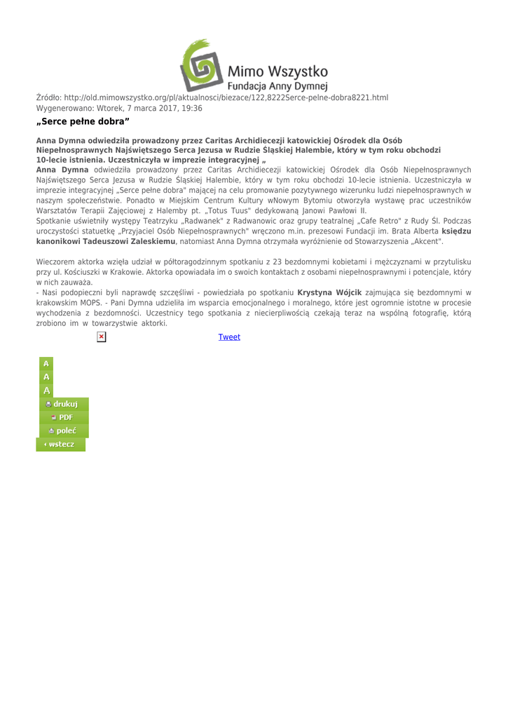 Źródło: http://old.mimowszystko.org/pl/aktualnosci/biezace/122,8222Serce-pelne-dobra8221.html Wygenerowano: Wtorek, 7 marca 2017, 19:36 „Serce pełne dobra” Anna Dymna odwiedziła prowadzony przez Caritas Archidiecezji katowickiej Ośrodek dla Osób Niepełnosprawnych Najświętszego Serca Jezusa w Rudzie Śląskiej Halembie, który w tym roku obchodzi 10-lecie istnienia. Uczestniczyła w imprezie integracyjnej „ Anna Dymna odwiedziła prowadzony przez Caritas Archidiecezji katowickiej Ośrodek dla Osób Niepełnosprawnych Najświętszego Serca Jezusa w Rudzie Śląskiej Halembie, który w tym roku obchodzi 10-lecie istnienia. Uczestniczyła w imprezie integracyjnej „Serce pełne dobra" mającej na celu promowanie pozytywnego wizerunku ludzi niepełnosprawnych w naszym społeczeństwie. Ponadto w Miejskim Centrum Kultury wNowym Bytomiu otworzyła wystawę prac uczestników Warsztatów Terapii Zajęciowej z Halemby pt. „Totus Tuus" dedykowaną Janowi Pawłowi II. Spotkanie uświetniły występy Teatrzyku „Radwanek" z Radwanowic oraz grupy teatralnej „Cafe Retro" z Rudy Śl. Podczas uroczystości statuetkę „Przyjaciel Osób Niepełnosprawnych" wręczono m.in. prezesowi Fundacji im. Brata Alberta księdzu kanonikowi Tadeuszowi Zaleskiemu, natomiast Anna Dymna otrzymała wyróżnienie od Stowarzyszenia „Akcent". Wieczorem aktorka wzięła udział w półtoragodzinnym spotkaniu z 23 bezdomnymi kobietami i mężczyznami w przytulisku przy ul. Kościuszki w Krakowie. Aktorka opowiadała im o swoich kontaktach z osobami niepełnosprawnymi i potencjale, który w nich zauważa. - Nasi podopieczni byli naprawdę szczęśliwi - powiedziała po spotkaniu Krystyna Wójcik zajmująca się bezdomnymi w krakowskim MOPS. - Pani Dymna udzieliła im wsparcia emocjonalnego i moralnego, które jest ogromnie istotne w procesie wychodzenia z bezdomności. Uczestnicy tego spotkania z niecierpliwością czekają teraz na wspólną fotografię, którą zrobiono im w towarzystwie aktorki. Tweet