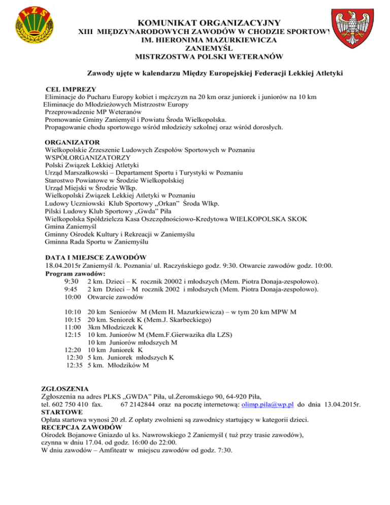 KOMUNIKAT ORGANIZACYJNY XIII MIĘDZYNARODOWYCH ZAWODÓW W CHODZIE SPORTOWYM IM. HIERONIMA MAZURKIEWICZA ZANIEMYŚL MISTRZOSTWA POLSKI WETERANÓW Zawody ujęte w kalendarzu Między Europejskiej Federacji Lekkiej Atletyki CEL IMPREZY Eliminacje do Pucharu Europy kobiet i mężczyzn na 20 km oraz juniorek i juniorów na 10 km Eliminacje do Młodzieżowych Mistrzostw Europy Przeprowadzenie MP Weteranów Promowanie Gminy Zaniemyśl i Powiatu Środa Wielkopolska. Propagowanie chodu sportowego wśród młodzieży szkolnej oraz wśród dorosłych. ORGANIZATOR Wielkopolskie Zrzeszenie Ludowych Zespołów Sportowych w Poznaniu WSPÓŁORGANIZATORZY Polski Związek Lekkiej Atletyki Urząd Marszałkowski – Departament Sportu i Turystyki w Poznaniu Starostwo Powiatowe w Środzie Wielkopolskiej Urząd Miejski w Środzie Wlkp. Wielkopolski Związek Lekkiej Atletyki w Poznaniu Ludowy Uczniowski Klub Sportowy „Orkan” Środa Wlkp. Pilski Ludowy Klub Sportowy „Gwda” Piła Wielkopolska Spółdzielcza Kasa Oszczędnościowo-Kredytowa WIELKOPOLSKA SKOK Gmina Zaniemyśl Gminny Ośrodek Kultury i Rekreacji w Zaniemyślu Gminna Rada Sportu w Zaniemyślu DATA I MIEJSCE ZAWODÓW 18.04.2015r Zaniemyśl /k. Poznania/ ul. Raczyńskiego godz. 9:30. Otwarcie zawodów godz. 10:00. Program zawodów: 9:30 2 km. Dzieci – K rocznik 20002 i młodszych (Mem. Piotra Donaja-zespołowo). 9:45 2 km Dzieci – M rocznik 2002 i młodszych (Mem. Piotra Donaja-zespołowo). 10:00 Otwarcie zawodów 20 km Seniorów M (Mem H. Mazurkiewicza) – w tym 20 km MPW M 20 km. Seniorek K (Mem.J. Skarbeckiego) 3km Młodziczek K 10 km. Juniorów M (Mem.F.Gierwazika dla LZS) 10 km Juniorów młodszych M 12:20 10 km Juniorek K 12:30 5 km. Juniorek młodszych K 12:35 5 km. Młodzików M 10:10 10:15 11:00 12:15 ZGŁOSZENIA Zgłoszenia na adres PLKS „GWDA” Piła, ul.Żeromskiego 90, 64-920 Piła, tel. 602 750 410 fax. 67 2142844 oraz na pocztę internetową: [email protected] do dnia 13.04.2015r. STARTOWE Opłata startowa wynosi 20 zł. Z opłaty zwolnieni są zawodnicy startujący w kategorii dzieci. RECEPCJA ZAWODÓW Ośrodek Bojanowe Gniazdo ul ks. Nawrowskiego 2 Zaniemyśl ( tuż przy trasie zawodów), czynna w dniu 17.04. od godz. 16:00 do 22:00. W dniu zawodów – Amfiteatr w miejscu zawodów od godz. 7:30. ZAMÓWIENIA NA NOCLEGI Można składać do dnia 10.04.2015r. na adres: WZ LZS Wielkopolska 61-255 Poznań, os. Tysiąclecia 4; email [email protected] tel (061) 866 93 91 i 876 00 20 z podaniem stanu K i M . Koszt osobodnia: w ośrodku Bojanowe Gniazdo – 90 zł z pełnym wyżywieniem ( kolacja, śniadanie, obiad). lub w schronisku młodzieżowym 30 zł za nocleg. Wyżywienie we własnym zakresie. Ilość miejsc w schronisku ograniczona. NAGRODY Trzech najlepszych zawodników z każdego dystansu otrzyma puchary. Inne nagrody w zależności od możliwości finansowych organizatora.