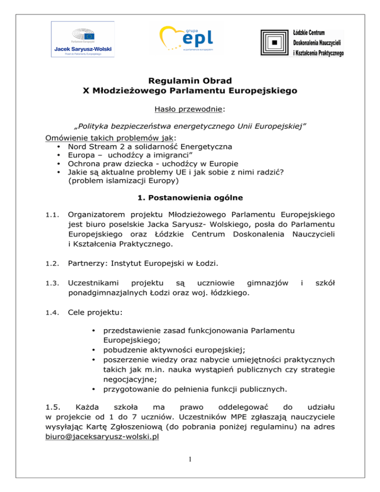 Regulamin Obrad X Młodzieżowego Parlamentu Europejskiego Hasło przewodnie: „Polityka bezpieczeństwa energetycznego Unii Europejskiej” Omówienie takich problemów jak: • Nord Stream 2 a solidarność Energetyczna • Europa – uchodźcy a imigranci” • Ochrona praw dziecka - uchodźcy w Europie • Jakie są aktualne problemy UE i jak sobie z nimi radzić? (problem islamizacji Europy) 1. Postanowienia ogólne 1.1. Organizatorem projektu Młodzieżowego Parlamentu Europejskiego jest biuro poselskie Jacka Saryusz- Wolskiego, posła do Parlamentu Europejskiego oraz Łódzkie Centrum Doskonalenia Nauczycieli i Kształcenia Praktycznego. 1.2. Partnerzy: Instytut Europejski w Łodzi. 1.3. Uczestnikami projektu są uczniowie gimnazjów ponadgimnazjalnych Łodzi oraz woj. łódzkiego. 1.4. Cele projektu: • • • • i szkół przedstawienie zasad funkcjonowania Parlamentu Europejskiego; pobudzenie aktywności europejskiej; poszerzenie wiedzy oraz nabycie umiejętności praktycznych takich jak m.in. nauka wystąpień publicznych czy strategie negocjacyjne; przygotowanie do pełnienia funkcji publicznych. 1.5. Każda szkoła ma prawo oddelegować do udziału w projekcie od 1 do 7 uczniów. Uczestników MPE zgłaszają nauczyciele wysyłając Kartę Zgłoszeniową (do pobrania poniżej regulaminu) na adres [email protected] 1 1.6. Realizacja projektu będzie odbywała się w oparciu o serię wykładów tematycznych, warsztatów oraz sesji plenarnej Młodzieżowego Parlamentu Europejskiego. 1.7. Wykłady merytoryczne odbywać się będą w siedzibie biura poselskiego Jacka Saryusz-Wolskiego, posła do Parlamentu Europejskiego (Łódź, ul. Rewolucji 1905 nr 9, III p.). Obrady Finalne odbędą się Instytucie Europejskim (Łódź, ul. Piotrkowska 262/264). 1.8. Projekt będzie realizowany od 10 marca do 10 czerwca 2016 r. 1.9. Organizatorzy zastrzegają sobie prawo do zmiany terminu sesji plenarnej Młodzieżowego Parlamentu Europejskiego. 2. Opis projektu 2.1. Zajęcia odbywać się będą zgodnie z harmonogramem (załącznik do regulaminu). 2.2. Zadaniem uczestników będzie opracowanie stanowiska danej frakcji politycznej w podanym przez Organizatorów temacie. (praca zespołowa) 2.3. Opracowanie indywidualnego stanowiska na jeden z wybranych 2 tematów podanych przez Organizatorów -związanych z mottem przewodnim X edycji MPE. (praca indywidualna). 2.4. Rozwiązanie testu z wiedzy o UE. (praca indywidualna) 2.5. Przygotowanie 3 minutowego filmu nt. Jak łódzkiego widzą przyszłość UE? (praca zespołowa) mieszkańcy woj. 2.6. Jednolicie i wspólnie wypracowane stanowisko frakcji oraz indywidualne stanowisko (patrz pkt. 2.3) należy przesłać na adres e-mail:[email protected] 2.7. Kolejnym etapem jest zawiązanie koalicji między uczestnikami w ramach danej frakcji w drodze negocjacji. 2.8. W efekcie każda koalicja powinna wypracować rezolucję, która będzie poddana pod głosowanie podczas sesji plenarnej MPE. 2 2.9. W czasie sesji plenarnej MPE zostaną przedstawione rezolucje wypracowane przez koalicje, które następnie zostaną poddane pod dyskusję i głosowanie. 3. Opis Obrad 3.1. Finałem projektu jest sesja plenarna Młodzieżowego Parlamentu Europejskiego. 3.2. Sesja plenarna MPE będzie prowadzona przez: Prezydium MPE –w jego skład wchodzi przewodniczący Obrad oraz dwoje wiceprzewodniczących. 3.3. Skład Jury: • Poseł do Parlament Europejskiego Jacek Saryusz-Wolski – przewodniczący Jury; • Dyrektor Łódzkiego Centrum Doskonalenia Nauczycieli i Kształcenia Praktycznego Janusz Moos - wiceprzewodniczący Jury; • Uniwersytet Łódzki dr Celina Błaszczyk – wiceprzewodnicząca Jury; 4. Kryteria oceny 4. 1. Ocenie podlega każdy z uczestników indywidualnie w rozróżnieniu na uczniów gimnazjów i szkół ponadgimnazjalnych. 4.2. Ocenie podlegają następujące elementy: • obecność na wykładach – 1 punkt za każdą obecność; • aktywność podczas Obrad MPE (sesja plenarna MPE) – 6 punktów łącznie; - wypowiedź: 4 pkt.; - każde zadanie pytanie z błękitnej karty (blue card): 2 pkt.; • aktywność podczas pracy we frakcjach - 5 punktów; (*na 5 spotkaniach uczestnicy będą pracować nad rezolucjami we frakcjach, co daje maks. 1 pkt. podczas każdego spotkania); 3 • opracowanie końcowego stanowiska frakcji w formie pisemnej – 5 punktów; • test (z podziałem na gimnazjalistów i szkoły ponadgimnazjalne)maksymalnie 16 punktów, w tym 1 punkt za każdą dobrą odpowiedź w przypadku pytań zamkniętych i 2 pytania za 3 punkty w przypadku pytań otwartych); • Indywidualne opracowanie stanowiska w formie pisemnej w jednym wybranym zagadnieniu do dwóch stron A4 – 12 punktów. • Przedstawienie projektów multimedialnych zawierających stanowisk projektów rezolucji danej frakcji; 10 pkt • Przygotowanie i opracowanie krótkiego 3 minutowego filmu nt. Jak mieszkańcy woj. łódzkiego widzą przyszłość UE? – 10 pkt 4.3. Poza powyższymi kryteriami do punktacji końcowej zostanie doliczona ocena wystawiana przez Jury w dniu sesji plenarnej MPE (do 5 punktów). 5. Wyniki 5.1. Ogłoszenie wyników nastąpi w dniu Obrad. 5.2.W przypadku przyznania miejsc ex equo przewiduje się nagrody równorzędne. 5.3. Nagrodami w konkursie są: Młodzież gimnazjalna Młodzież licealna I nagroda Wyjazd studyjny do Brukseli Wyjazd studyjny do Brukseli II nagroda Wyjazd studyjny do Brukseli Wyjazd studyjny do Brukseli III nagroda Wyjazd studyjny do Brukseli Wyjazd studyjny do Brukseli 4 5.4. Wszystkie szkoły, uczniowie i opiekunowie grup biorący udział w projekcie otrzymają certyfikat uczestnictwa oraz upominki. 5.5. Sprawozdanie z projektu zostanie zamieszczone www.saryusz-wolski.pl oraz www.wckp.lodz.pl na stronie 6. Postanowienia końcowe 6.1.Decyzje Komisji Konkursowej są ostateczne i nie przysługuje od nich odwołanie; 6.2.Organizatorzy zastrzegają sobie prawo do zmiany ilości przyznawanych nagród, bądź dokonania zmian