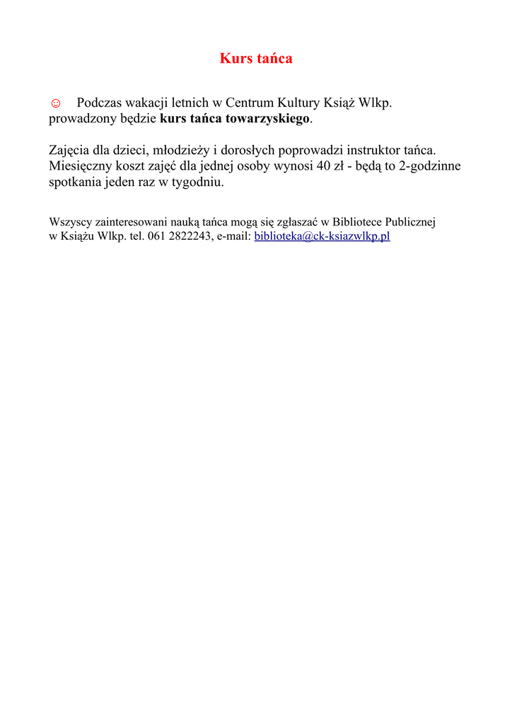 Kurs tańca ☺ Podczas wakacji letnich w Centrum Kultury Książ Wlkp. prowadzony będzie kurs tańca towarzyskiego. Zajęcia dla dzieci, młodzieży i dorosłych poprowadzi instruktor tańca. Miesięczny koszt zajęć dla jednej osoby wynosi 40 zł - będą to 2-godzinne spotkania jeden raz w tygodniu. Wszyscy zainteresowani nauką tańca mogą się zgłaszać w Bibliotece Publicznej w Książu Wlkp. tel. 061 2822243, e-mail: [email protected]