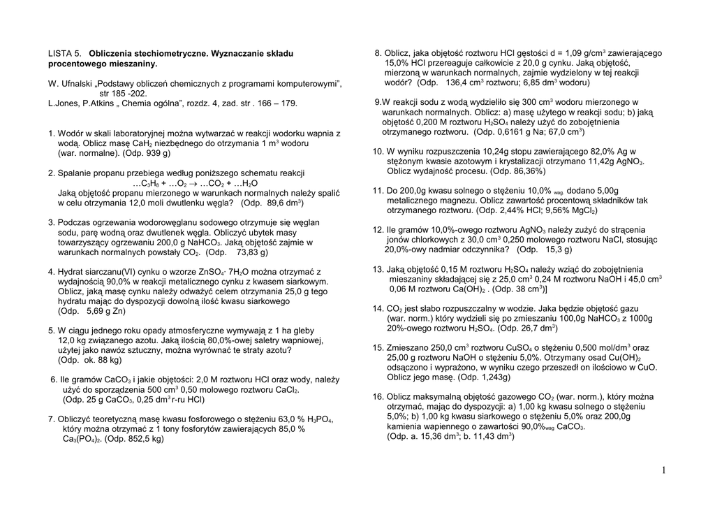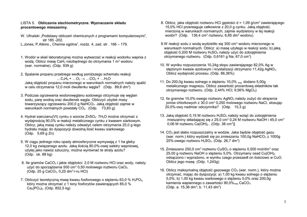 LISTA 5. Obliczenia stechiometryczne. Wyznaczanie składu procentowego mieszaniny. W. Ufnalski „Podstawy obliczeń chemicznych z programami komputerowymi”, str 185 -202. L.Jones, P.Atkins „ Chemia ogólna”, rozdz. 4, zad. str . 166 – 179. 1. Wodór w skali laboratoryjnej można wytwarzać w reakcji wodorku wapnia z wodą. Oblicz masę CaH2 niezbędnego do otrzymania 1 m 3 wodoru (war. normalne). (Odp. 939 g) 2. Spalanie propanu przebiega według poniższego schematu reakcji …C3H8 + …O2 → …CO2 + …H2O Jaką objętość propanu mierzonego w warunkach normalnych należy spalić w celu otrzymania 12,0 moli dwutlenku węgla? (Odp. 89,6 dm3) 3. Podczas ogrzewania wodorowęglanu sodowego otrzymuje się węglan sodu, parę wodną oraz dwutlenek węgla. Obliczyć ubytek masy towarzyszący ogrzewaniu 200,0 g NaHCO3. Jaką objętość zajmie w warunkach normalnych powstały CO2. (Odp. 73,83 g) 4. Hydrat siarczanu(VI) cynku o wzorze ZnSO4· 7H2O można otrzymać z wydajnością 90,0% w reakcji metalicznego cynku z kwasem siarkowym. Oblicz, jaką masę cynku należy odważyć celem otrzymania 25,0 g tego hydratu mając do dyspozycji dowolną ilość kwasu siarkowego (Odp. 5,69 g Zn) 5. W ciągu jednego roku opady atmosferyczne wymywają z 1 ha gleby 12,0 kg związanego azotu. Jaką ilością 80,0%-owej saletry wapniowej, użytej jako nawóz sztuczny, można wyrównać te straty azotu? (Odp. ok. 88 kg) 6. Ile gramów CaCO3 i jakie objętości: 2,0 M roztworu HCl oraz wody, należy użyć do sporządzenia 500 cm3 0,50 molowego roztworu CaCl2. (Odp. 25 g CaCO3, 0,25 dm3 r-ru HCl) 7. Obliczyć teoretyczną masę kwasu fosforowego o stężeniu 63,0 % H3PO4, który można otrzymać z 1 tony fosforytów zawierających 85,0 % Ca3(PO4)2. (Odp. 852,5 kg) 8. Oblicz, jaka objętość roztworu HCl gęstości d = 1,09 g/cm 3 zawierającego 15,0% HCl przereaguje całkowicie z 20,0 g cynku. Jaką objętość, mierzoną w warunkach normalnych, zajmie wydzielony w tej reakcji wodór? (Odp. 136,4 cm3 roztworu; 6,85 dm3 wodoru) 9.W reakcji sodu z wodą wydzieliło się 300 cm3 wodoru mierzonego w warunkach normalnych. Oblicz: a) masę użytego w reakcji sodu; b) jaką objętość 0,200 M roztworu H2SO4 należy użyć do zobojętnienia otrzymanego roztworu. (Odp. 0,6161 g Na; 67,0 cm3) 10. W wyniku rozpuszczenia 10,24g stopu zawierającego 82,0% Ag w stężonym kwasie azotowym i krystalizacji otrzymano 11,42g AgNO3. Oblicz wydajność procesu. (Odp. 86,36%) 11. Do 200,0g kwasu solnego o stężeniu 10,0% wag. dodano 5,00g metalicznego magnezu. Oblicz zawartość procentową składników tak otrzymanego roztworu. (Odp. 2,44% HCl; 9,56% MgCl2) 12. Ile gramów 10,0%-owego roztworu AgNO3 należy zużyć do strącenia jonów chlorkowych z 30,0 cm 3 0,250 molowego roztworu NaCl, stosując 20,0%-owy nadmiar odczynnika? (Odp. 15,3 g) 13. Jaką objętość 0,15 M roztworu H2SO4 należy wziąć do zobojętnienia mieszaniny składającej się z 25,0 cm3 0,24 M roztworu NaOH i 45,0 cm3 0,06 M roztworu Ca(OH)2 . (Odp. 38 cm3)] 14. CO2 jest słabo rozpuszczalny w wodzie. Jaka będzie objętość gazu (war. norm.) który wydzieli się po zmieszaniu 100,0g NaHCO3 z 1000g 20%-owego roztworu H2SO4. (Odp. 26,7 dm3) 15. Zmieszano 250,0 cm3 roztworu CuSO4 o stężeniu 0,500 mol/dm 3 oraz 25,00 g roztworu NaOH o stężeniu 5,0%. Otrzymany osad Cu(OH)2 odsączono i wyprażono, w wyniku czego przeszedł on ilościowo w CuO. Oblicz jego masę. (Odp. 1,243g) 16. Oblicz maksymalną objętość gazowego CO2 (war. norm.), który można otrzymać, mając do dyspozycji: a) 1,00 kg kwasu solnego o stężeniu 5,0%; b) 1,00 kg kwasu siarkowego o stężeniu 5,0% oraz 200,0g kamienia wapiennego o zawartości 90,0%wag CaCO3. (Odp. a. 15,36 dm3; b. 11,43 dm3) 1 17. Chlorek tionylu SOCl2 jest bezbarwna cieczą gwałtownie reagującą z wodą wg schematu reakcji: SOCl2 + H2O SO2 + HCl Oblicz, jaka objętość ditlenku siarki, zmierzona w warunkach normalnych, powstanie w wyniku reakcji 10,0 g chlorku tionylu z taką samą masą wody. (Odp. 1,88 dm3) 18. Oblicz, jaką masę hydratu chlorku magnezu MgCl2· 6H2O można otrzymać w reakcji 6,72 g magnezu z 100 g 15,0%-owego roztworu kwasu solnego. (Odp. 81,3 g hydratu) 19. 25 cm3 3M roztworu H2SO4 zmieszano z 25 cm 3 2M roztworu HCl i 25 cm3 2M roztworu Ba(OH)2. Wydzielony osad BaSO4 odsączono, a przesącz rozcieńczono do objętości 150 cm3. Oblicz stężenia jonów obecnych w otrzymanym roztworze. 20. Zmieszano 250cm3 roztworu o gęstości d = 1,03 g/cm 3 zawierającego 16.0g NaOH z 150 cm3 10,0%-owego roztworu H2SO4 o gęstości d = 1,07 kg/dm3. Który ze związków pozostanie w nadmiarze i jakie będzie jego stężenie molowe, jeżeli gęstość otrzymanego roztworu wynosiła d = 1,05 kg/dm3. (Odp. NaOH, 0,18 mol/dm 3) 21. Do całkowitego wytrącenia jonów SO42- z 12,0 cm3 5,23%-owego roztworu H2SO4 o gęstości d = 1,035g/cm 3 zużyto 52,00 cm3 roztworu BaCl2. Oblicz stężenie molowe roztworu BaCl2. (Odp. 0,127 M) 22. Oblicz objętości 1,5M roztworu HCl, 2,0M roztworu KOH oraz wody, które należy zmieszać ze sobą, aby otrzymać 600 cm 3 0,5M roztworu KCl. (Odp. 0,2 dm3, 0,15 dm3, 0,25 dm3) 23. W wyniku ogrzewania pyłu miedzi z siarką tworzy się ilościowo siarczek miedzi(I). Oblicz w skład procentowy mieszaniny poreakcyjnej otrzymanej w wyniku reakcji: a) jednakowej liczby moli Cu i S; b) jednakowych mas Cu i S. (Odp. a. 83,23%Cu2S; b. 62,61% Cu2S) 24. W rurze kwarcowej umieszczono 10,0 g mieszaniny CuO i Fe2O3 dla której stosunek mas jej składników wynosi 1:1. Przez rurę tą ogrzaną do wysokiej temperatury przepuszczano strumień wodoru, aż do pełnej redukcji mieszaniny tlenków do czystych metali. Ile gramów wody powstało w wyniku przeprowadzonej reakcji? (Odp. 2,82 g) 25. Mieszanina palna zawiera CO, H2, CH4 oraz N2 w stosunku molowym 1 : 2 : 1,5 : 3. Oblicz objętość tlenu niezbędną do spalenia: a) 1 m3; b) 1 kg tej mieszaniny. Objętości gazów mierzono w warun
