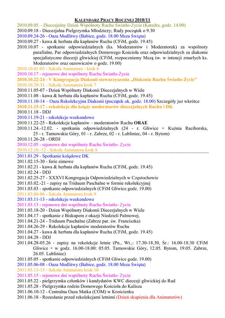 KALENDARZ PRACY ROCZNEJ 2010/11 2010.09.05. - Diecezjalny Dzień Wspólnoty Ruchu Światło-śycie (Katedra, godz. 14.00) 2010.09.18 - Diecezjalna Pielgrzymka MłodzieŜy; Rudy początek o 9.30 2010.09.24-26 - Oaza Modlitwy (Babice, godz. 18.00 Msza Święta) 2010.09.27 - kawa & herbata dla kapłanów Ruchu (CFiM, godz. 19.45) 2010.10.07 - spotkanie odpowiedzialnych (ks. Moderatorów i Moderatorek) za wspólnoty parafialne, Par odpowiedzialnych Domowego Kościoła oraz odpowiedzialnych za diakonie specjalistyczne diecezji gliwickiej (CFiM, rozpoczniemy Mszą św. w intencji zmarłych ks. Moderatorów oraz oazowiczów o godz. 19.00) 2010.10.01-03 - Szkoła Animatora - krok 6 2010.10.17 - rejonowe dni wspólnoty Ruchu Światło-śycie 2010.10.22-24 - V Kongregacja Diakonii stowarzyszenia „Diakonia Ruchu Światło-śycie” 2010.10.29-31 - Szkoła Animatora krok 7 2010.11.05-07 - Dzień Wspólnoty Diakonii Diecezjalnych w Wiśle 2010.11.08 - kawa & herbata dla kapłanów Ruchu (CFiM, godz. 19.45) 2010.11.10-14 – Oaza Rekolekcyjna Diakonii (początek ok. godz. 18.00) Szczegóły juŜ wkrótce 2010.11.15-17 - rekolekcje dla księŜy moderatorów diecezjalnych Ruchu i DK 2010.11.18 - DDJ 2010.11.19-21 - rekolekcje weekendowe 2010.11.22-25 - Rekolekcje kapłanów – moderatorów Ruchu ORAE 2010.11.24.-12.02. - spotkania odpowiedzialnych (24 - r. Gliwice + Kuźnia Raciborska, 25 - r. Tarnowskie Góry, 01 - r. Zabrze, 02 - r. Lubliniec, 04 - r. Bytom) 2010.11.26-28 - ORDJ 2010.12.05 - rejonowe dni wspólnoty Ruchu Światło- śycie 2010.12.10.-12 - Szkoła Animatora krok 8 2011.01.29 - Spotkanie kolędowe DK 2011.02.15-30 - ferie zimowe 2011.02.21 - kawa & herbata dla kapłanów Ruchu (CFiM, godz. 19.45) 2011.02.24 - DDJ 2011.02.25-27 - XXXVI Kongregacja Odpowiedzialnych w Częstochowie 2011.03.02.-21 - zapisy na Triduum Paschalne w formie rekolekcyjnej 2011.03.03 - spotkanie odpowiedzialnych (CFiM Gliwice godz. 19.00) 2011.03.04-06 - Szkoła Animatora krok 9 2011.03.11-13 - rekolekcje weekendowe 2011.03.13 - rejonowe dni wspólnoty Ruchu Światło- śycie 2011.03.18-20 - Dzień Wspólnoty Diakonii Diecezjalnych w Wiśle 2011.04.17 - spotkanie z Biskupem z okazji Niedzieli Palmowej. 2011.04.21-24 - Triduum Paschalne (Zabrze par. św. Franciszka) 2011.04.26-29 - Rekolekcje kapłanów moderatorów Ruchu 2011.04.27 - kawa & herbata dla kapłanów Ruchu (CFiM, godz. 19.45) 2011.04.28 - DDJ 2011.04.28-05.26 - zapisy na rekolekcje letnie (Pn., Wt.,: 17.30-18.30, Śr.: 16.00-18.30 CFiM Gliwice + w godz. 16.00-18.00: 05.05. Tarnowskie Góry, 12.05. Bytom, 19.05. Zabrze, 26.05. Lubliniec) 2011.05.05 - spotkanie odpowiedzialnych (CFiM Gliwice godz. 19.00) 2011.05.06-08 - Oaza Modlitwy (Babice, godz. 18.00 Msza Święta) 2011.05.13-15 - Szkoła Animatora krok 10 2011.05.15 - rejonowe dni wspólnoty Ruchu Światło- śycie 2011.05.22 - pielgrzymka członków i kandydatów KWC diecezji gliwickiej do Rud 2011.05.28 - Pielgrzymka rodzin Domowego Kościoła do Kalisza 2011.06.10-12 - Centralna Oaza Matka (COM) w Krościenku 2011.06.18 - Rozesłanie przed rekolekcjami letnimi (Dzień skupienia dla Animatorów) Terminy Letnich Rekolekcji Oazowych 2011: Turnus pierwszy: 25.06. - 11.07.; turnus drugi: 13.07. - 29.07.; turnus trzeci: 30.07. - 15.08. Szczegółowe terminy poszczególnych oaz w późniejszym terminie 2011.08.23-25 - podsumowanie letnich rekolekcji oazowych w Krościenku 2011.09.04 - Diecezjalny Dzień Wspólnoty Ruchu Światło-śycie (Gliwice - katedra, godz. 14.00)