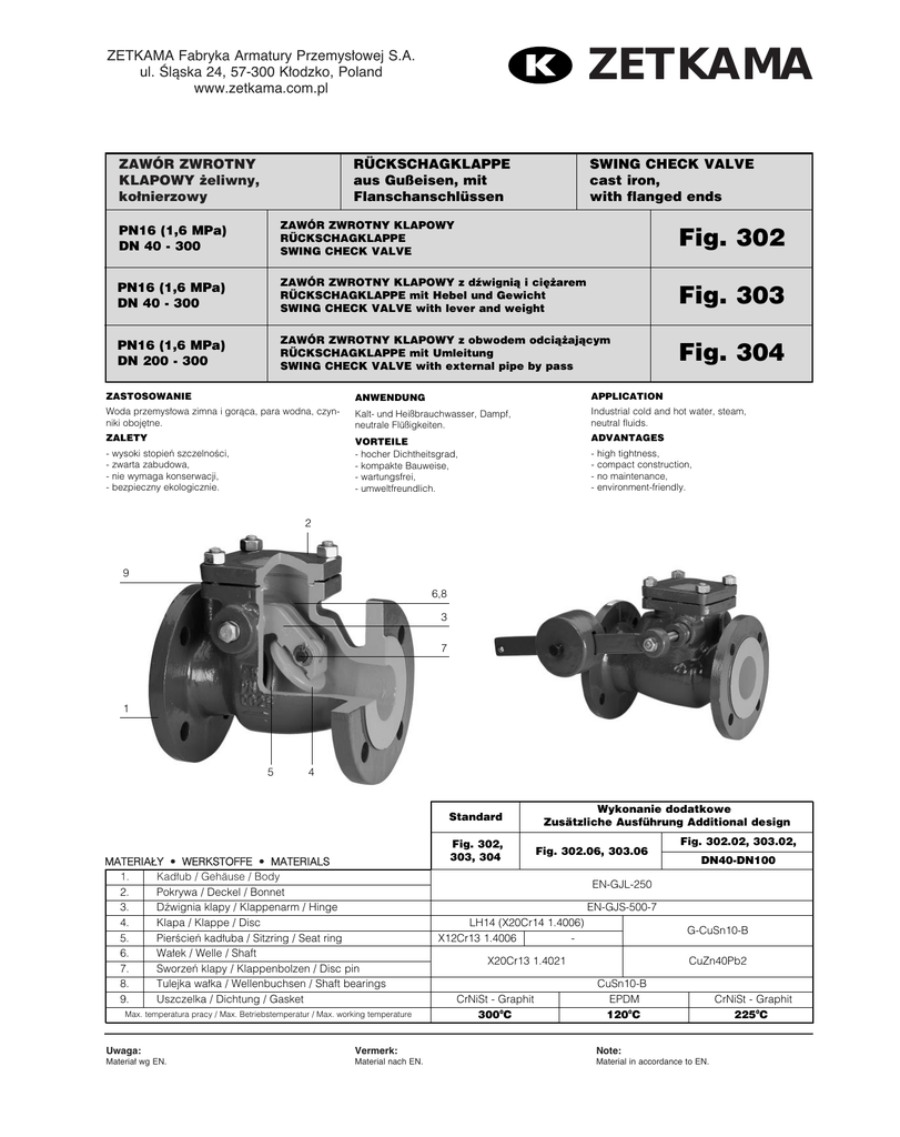 ZETKAMA Fabryka Armatury Przemys∏owej S.A. ul. Âlàska 24, 57-300 K∏odzko, Poland www.zetkama.com.pl ZAWÓR ZWROTNY KLAPOWY ˝eliwny, ko∏nierzowy ZETKAMA RÜCKSCHAGKLAPPE aus Gußeisen, mit Flanschanschlüssen SWING CHECK VALVE cast iron, with flanged ends PN16 (1,6 MPa) DN 40 - 300 ZAWÓR ZWROTNY KLAPOWY RÜCKSCHAGKLAPPE SWING CHECK VALVE Fig. 302 PN16 (1,6 MPa) DN 40 - 300 ZAWÓR ZWROTNY KLAPOWY z dêwignià i ci´˝arem RÜCKSCHAGKLAPPE mit Hebel und Gewicht SWING CHECK VALVE with lever and weight Fig. 303 PN16 (1,6 MPa) DN 200 - 300 ZAWÓR ZWROTNY KLAPOWY z obwodem odcià˝ajàcym RÜCKSCHAGKLAPPE mit Umleitung SWING CHECK VALVE with external pipe by pass Fig. 304 ZASTOSOWANIE ANWENDUNG APPLICATION Woda przemys∏owa zimna i goràca, para wodna, czynniki oboj´tne. Kalt- und Heißbrauchwasser, Dampf, neutrale Flüßigkeiten. Industrial cold and hot water, steam, neutral fluids. ZALETY VORTEILE - hocher Dichtheitsgrad, - kompakte Bauweise, - wartungsfrei, - umweltfreundlich. ADVANTAGES - wysoki stopieƒ szczelnoÊci, zwarta zabudowa, nie wymaga konserwacji, bezpieczny ekologicznie. - high tightness, compact construction, no maintenance, environment-friendly. 2 9 6,8 3 7 1 5 4 Standard MATERIA¸Y • WERKSTOFFE • MATERIALS 1. Kad∏ub / Gehäuse / Body 2. Pokrywa / Deckel / Bonnet 3. Dêwignia klapy / Klappenarm / Hinge 4. Klapa / Klappe / Disc 5. PierÊcieƒ kad∏uba / Sitzring / Seat ring 6. Wa∏ek / Welle / Shaft 7. Sworzeƒ klapy / Klappenbolzen / Disc pin 8. Tulejka wa∏ka / Wellenbuchsen / Shaft bearings 9. Uszczelka / Dichtung / Gasket Max. temperatura pracy / Max. Betriebstemperatur / Max. working temperature Fig. 302, 303, 304 Wykonanie dodatkowe Zusätzliche Ausführung Additional design Fig. 302.02, 303.02, Fig. 302.06, 303.06 DN40-DN100 EN-GJL-250 EN-GJS-500-7 LH14 (X20Cr14 1.4006) X12Cr13 1.4006 - G-CuSn10-B X20Cr13 1.4021 CrNiSt - Graphit 3000C CuZn40Pb2 CuSn10-B EPDM 1200C Uwaga: Vermerk: Note: Materia∏ wg EN. Material nach EN. Material in accordance to EN. CrNiSt - Graphit 2250C Fig. 302 DN Fig. 303 Dz Dp Fig. 302, 303, 304 Do do x n g 150 165 185 200 220 250 285 340 405 460 84 99 118 132 156 184 211 266 319 370 110 125 145 160 180 210 240 295 355 410 Fig. 304 L H 3 3 3 3 3 3 3 3 3 4 180 200 240 260 300 350 400 500 600 700 119 120 141 168 175 199 217 277 337 374 A mm 40 50 65 80 100 125 150 200 250 300 19 x 4 19 x 4 19 x 4 19 x 8 19 x 8 19 x 8 23 x 8 23 x 12 28 x 12 28 x 12 18 20 20 22 24 26 26 30 32 32 Fig. 303 B W Fig. 302 f kg 9,0 11.0 15,2 20,8 31,5 46,0 60,0 120 180 250 mm 280 280 280 280 350 350 450 500 660 660 70 72 79 91 97 116 124 162 190 190 170 180 190 200 210 225 250 306 348 348 kg 13,0 13,5 18,0 20,5 36,0 51,0 67,0 129 198 285 Fig. 304 L mm kg 380 131 410 202 400 283 EPDM Na ˝yczenie klienta / Auf Wunsch der Kunden / On customer’s request Dla wody pitnej / Für Trinkwasser / For drinking water Fig.302 Epoxy, Fig.303 Epoxy Farba epoksydowa / Epoxyfarbe Epoxy paint ⇒ Atest / Attest Certyficate Âruby dwustronne, nakr´tki / Stiftschrauben Sechskantmuttern / Stud-bolds, hexagon nuts Stal nierdz. / Niro / Stainless steel ocynkowane / verzinkt /zinc coated EN-GJL-250 Fig. 302.06 PN16 CiÊnienie próbne kad∏uba Prüfdruck Pressure test of the body CiÊnienie zamkni´cia Druck des Verschlusses Pressure of the closure EN 1092-2 : 1997 2,4 MPa 1,76 MPa 0 Ko∏nierze Flansche Flanges C -10 120 150 180 200 230 250 300 EN 1092 - 2 D∏ugoÊç zabudowy Baulänge Face to face length MONTA˚ / EINBAUHINWEISE / ASSEMBLING CiÊnienie - temperatura Druck - Temperatur Pressure - temperature EN-GJL-250 PN16 EN558-1 ➡ 48 (DIN 3202 ➡ F6) bar 16 16 14,4 13,4 12,8 11,8 11,2 9,6 Uwaga / Vermerk / Note: OÊ obrotu klapy powinna byç w p∏aszczyênie poziomej. Die Drehachse der Klappe liegt in der waagerechten Ebene. The axis of rotation of the disc should be in horizontal plane. ZAMAWIANIE BESTELLUNGEN W zamówieniu nale˝y podaç Fig. i DN. Bei Bestellungen sind Fig. und DN anzugeben. When ordering please specify: Fig. and DN. Informacje majà charakter ogólny. Szczegó∏owych informacji udziela dzia∏ Marketingu. Es wurden allgemeine Informationen angegeben. Weitere Angaben werden von der Marketingabteilung mitgeteilt. These data are for information only. Our marketing department provides you with detailed specifications. Sekretariat tel. (0048) (074) 867 28 48 865 21 00 fax (0048) (074) 865 21 01 e-mail: [email protected] Sprzeda˝ krajowa tel. (0048) (074) 865 21 52 865 21 88 fax (0048) (074) 865 21 98 e-mail: [email protected] ORDERING Marketing tel. (0048) (074) 865 21 74 fax (0048) (074) 865 21 98 e-mail: [email protected] Zastrzega si´ prawo do zmian konstrukcyjnych / Technische Änderungen vorbehalten / Technical data alteration reserved Wydanie / Ausgabe / Edition: 02/2004