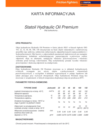 KARTA INFORMACYJNA Statoil Hydraulic Oil Premium Olej hydrauliczny . OPIS PRODUKTU: Oleje hydrauliczne Hydraulic Oil Premium w klasie jako ci HLP, w klasach lepko ci ISO VG: 22, 32, 46, 68, 100, 150 otrzymywane na bazie olejów mineralnych z zachowawczej przeróbki ropy naftowej, selektywnie rafinowanych, odparafinowanych rozpuszczalnikowo i hydrorafinowanych. Olej bazowy o odpowiednich parametrach lepko ciowych jest nast pnie uszlachetniony dodatkami uszlachetniaj cymi, poprawiaj cymi w pierwszym rz dzie odporno oleju na utlenianie, nadaj cymi własno ci przeciwzu yciowe i własno ci ochronne przed korozj i rdzewieniem. Olej uszlachetniony posiada wysokie własno ci przeciwpienne i skuteczn odporno na emulgowanie. ZASTOSOWANIE: Oleje hydrauliczne Hydraulic Oil Premium stosowane s w układach hydraulicznych, w których wymagane jest u ycie olejów o podwy szonych własno ciach przeciwzu yciowych, a szczególnie w układach wyposa onych w pompy łopatkowe lub z bate pracuj ce przy wy szych obci eniach. Oleje hydrauliczne Premium mog by stosowane w urz dzeniach, w których temperatura eksploatacji oleju nie przekracza 60°C. PARAMETRY FIZYKO-CHEMICZNE: TYPOWE DANE Lepko kinematyczna w temp. 40°C, Wska nik lepko ci Temperatura płyni cia, Temperatura zapłonu, Jednostki 22 32 46 68 100 150 mm2/s 22 99 -34 196 32 98 -32 216 46 97 -30 226 68 96 -28 238 100 95 -20 254 150 97 -18 210 1a 1a 1a 1a 1a 1a 10 10 10 20 °C °C Działanie koroduj ce w temp. 100°C w ci gu 3 godzin na płytkach miedzi Odporno na emulgowanie Czas rozdziału emulsji z woda w temp. 54°C Własno ci przeciwzu yciowe - rednia rednica skaz kulek (d), G sto w 15°C, mm g/ml 0,40 0,40 0,40 0,40 15 15 (82°C) (82°C) 0,40 0,40 0,865 0,870 0,875 0,880 0,885 0,889 MAGAZYNOWANIE: Chroni przed mrozem. Przechowywa w temperaturze od 5 do 35°C. TESTY I APROBATY: DIN 51524/2: HLP, ISO L-HM, Denison HF0, HF1, HF2 (Apr. nr 195), Poziom jako ci: Cincinnati Machine, AISE 127, WT – 03/2002/STATOIL KARTA BEZPIECZE STWA PRODUKTU: Wszystkie informacje dotycz ce Zdrowia, Bezpiecze stwa i rodowiska oraz inne specyficzne informacje powinny by zaczerpni te z Karty Charakterystyki Substancji Niebezpiecznej i Preparatu Niebezpiecznego.
