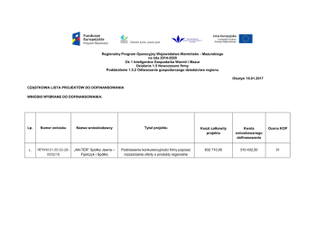 Regionalny Program Operacyjny Województwa Warmińsko - Mazurskiego na lata 2014-2020 Oś 1 Inteligentna Gospodarka Warmii i Mazur Działanie 1.5 Nowoczesne firmy Poddziałanie 1.5.2 Odtwarzanie gospodarczego dziedzictwa regionu Olsztyn 16.01.2017 CZĄSTKOWA LISTA PROJEKTÓW DO DOFINANSOWANIA WNIOSKI WYBRANE DO DOFINANSOWANIA: Lp. Numer wniosku Nazwa wnioskodawcy Tytuł projektu Koszt całkowity projektu Kwota wnioskowanego dofinasowania Ocena KOP 1. RPWM.01.05.02-280002/16 „AN-TER” Spółka Jawna – Fijarczyk i Spółka Podniesienie konkurencyjności firmy poprzez rozszerzenie oferty o produkty regionalne 832 710,00 310 432,50 31