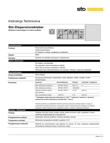 Instrukcja Techniczna _______________________________________________________________________________________________________________________ Sto-Dispersionskleber Akrylowa masa klejąca na równe podłoża +5°C Charakterystyka Funkcja Pastowata masa klejowa Wodorozcieńczalna Do klejenia na słabo nasiąkliwych podłożach Optyka Biała Obróbka Zarówno do obróbki ręcznej jak i maszynowej Zakres stosowania Do wnętrz i na zewnątrz. Na wszystkie nośne drewniane podłoża. Jako klej na równych podłożach i płytach Stosować tylko cienkowarstwowo na suchych, nośnych i równych podłożach Dane techniczne Grupa produktów Masa klejąca Podstawowe składniki Dyspersja polimerowa, krzemionka, woda, glikoeter, alifaty, dodatki, środki konserwujące Parametry Kryterium Wsp. dyfuzji pary wodnej sd Norma/Wytyczne Wartość Jednostka Dodatkowe EN ISO 7783-21) 0,87-1,0 m 1) Wsp. dyfuzji pary wodnej μ EN ISO 7783-2 Gęstość strumienia dyfuzji EN ISO 7783-21) 1200-2200 21-243) g/(m2·d) 0,70 W/(m·K) pary wodnej V Wsp. przewodzenia ciepła 1) (A/23°C) odbiegające będą próby przy wysychaniu w +23°C warstwy lub wartość obliczeniowa wg DIN 4108 3) 2) wyliczany z wartości sd i grubości klasa II Podane parametry są wartościami średnimi wyników uzyskanych podczas badań. Z uwagi na stosowanie surowców naturalnych rzeczywiste wartości mogą nieznacznie odbiegać od wielkości podanych w tabeli. Różnice te nie mają jednak wpływu na jakość i właściwości produktu. Obróbka - Wskazówki Podłoże Podłoże musi być suche, trwałe, nośne, wolne od kurzu i lodu, wykwitów i innych substancji pogarszających przyczepność. Przygotowanie podłoża Sprawdzić nośność podłoża. Powłoki nienośne usunąć. Temperatura obróbki Minimalna temperatura obróbki i podłoża +5°C. Przygotowanie materiału Materiał po przemieszaniu jest gotowy do użycia. W celu uzyskania odpowiedniej konsystencji materiał można rozcieńczyć wodą. __________________________________________________________________________________________________________________________ Strona 1 z 2 Instrukcja Techniczna _______________________________________________________________________________________________________________________ Sto-Dispersionskleber Zużycie Artykuł Zastosowanie Zużycie ok. do klejenia płyt termoizolacyjnych 1,0-1,5 kg/m2 Zużycie zależne jest od podłoża i techniki nanoszenia. Podana wartość jest wielkością orientacyjną. Dokładne wartości zużycia należy ustalić dla danego podłoża. Obróbka Sto-Dispersionskleber nanosić pacą zębatą 4x4 mm lub zębatą szpachelką na płyty izolacyjne lub na podłoże. Klejenie całopowierzchniowe. Przy nanoszeniu kleju na powierzchnię ściany należy pamiętać, aby płyty termoizolacyjne były dociskane do mokrej masy klejowej. Czas schnięcia jest zależny od temperatury i relatywnej wilgotności powietrza. Przy temperaturze powietrza +20oC i 65% relatywnej wilgotności powietrza można przystępować do ponownej pracy po 24 do 48 godzin. Przy wysokiej wilgotności powietrza i/lub niższej temperaturze schnięcie wydłuża się. W pojedynczych przypadkach możliwe jest wielodniowe schnięcie. Czyszczenie narzędzi Wodą natychmiast po użyciu. Forma dostawy Opakowanie Wiadro 20 kg Barwa Biała Składowanie Warunki składowania Chronić przed mrozem. Przy temperaturach powyżej +35°C nie wystawiać na bezpośrednie oddziaływanie słońca. Czas składowania Najlepsza jakość w oryginalnym opakowaniu do ... (patrz opakowanie). Data przydatności do użycia zawarta w numerze szarży: pierwsza cyfra oznacza rok, dwie kolejne nr tygodnia kalendarzowego (np.0270052541 oznacza 27 tydzień kalendarzowy 2010 roku). Dodatkowe informacje Bezpieczeństwo Szczegółowe informacje dot. obchodzenia się z materiałem, składowania i usuwania znajdują się w Karcie Charakterystyki Preparatu Niebezpiecznego. GIS-CODE Zastosowania nie wymienione w niniejszej Instrukcji Technicznej należy wcześniej skonsultować z przedstawicielem Sto. Zamieszczone informacje lub dane odnoszą się do standardowych zastosowań i nie mogą stanowić podstawy roszczeń odszkodowawczych. Sto-ispo Sp. z o.o. ul. Zabraniecka 15 03-872 Warszawa tel. +48 22 511 61 00 fax +48 22 511 61 01 [email protected] Nr rewizyjny Obowiązuje od Sto-Dispersionskleber/PL/026 25.04.2008 www.sto.pl __________________________________________________________________________________________________________________________ Strona 2 z 2