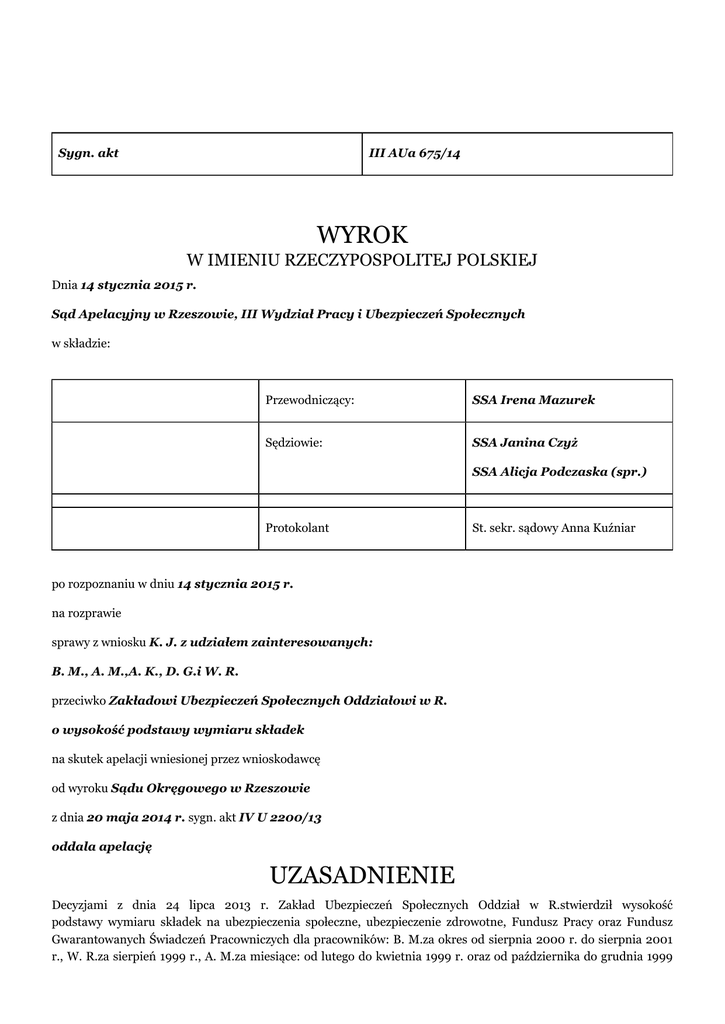 Sygn. akt III AUa 675/14 WYROK W IMIENIU RZECZYPOSPOLITEJ POLSKIEJ Dnia 14 stycznia 2015 r. Sąd Apelacyjny w Rzeszowie, III Wydział Pracy i Ubezpieczeń Społecznych w składzie: Przewodniczący: SSA Irena Mazurek Sędziowie: SSA Janina Czyż SSA Alicja Podczaska (spr.) Protokolant St. sekr. sądowy Anna Kuźniar po rozpoznaniu w dniu 14 stycznia 2015 r. na rozprawie sprawy z wniosku K. J. z udziałem zainteresowanych: B. M., A. M.,A. K., D. G.i W. R. przeciwko Zakładowi Ubezpieczeń Społecznych Oddziałowi w R. o wysokość podstawy wymiaru składek na skutek apelacji wniesionej przez wnioskodawcę od wyroku Sądu Okręgowego w Rzeszowie z dnia 20 maja 2014 r. sygn. akt IV U 2200/13 oddala apelację UZASADNIENIE Decyzjami z dnia 24 lipca 2013 r. Zakład Ubezpieczeń Społecznych Oddział w R.stwierdził wysokość podstawy wymiaru składek na ubezpieczenia społeczne, ubezpieczenie zdrowotne, Fundusz Pracy oraz Fundusz Gwarantowanych Świadczeń Pracowniczych dla pracowników: B. M.za okres od sierpnia 2000 r. do sierpnia 2001 r., W. R.za sierpień 1999 r., A. M.za miesiące: od lutego do kwietnia 1999 r. oraz od października do grudnia 1999 r., za styczeń 2000 r. i od maja do lipca 2000 r., D. G.za okres od marca do sierpnia 2001 r., A. K.za okres od lipca 1999 r. do marca 2000 r. W uzasadnieniach decyzji pozwany organ rentowy wskazał, że zainteresowani byli zgłoszeni do ubezpieczeń społecznych i ubezpieczenia zdrowotnego z tytułu zatrudnienia u płatnika składek (...) J. K. we wskazanych wyżej okresach, zaś ustalenia wysokości podstawy wymiaru składek dokonano w oparciu o ustalenia kontroli płatnika składek, wszczętej w związku ze złożonymi korektami deklaracji rozliczeniowych, polegającymi na wyłączeniu równowartości otrzymywanych świadczeń w naturze tzw. deputatów. Od powyższych decyzji K. J., wniósł odwołania domagając się ich uchylenia jako wydanych z rażącym naruszeniem przepisów prawa. Odwołujący zarzucił naruszenie art. 18 ust. 1 w zw. z art. 21 ustawy z 13 października 1998 r. o systemie ubezpieczeń społecznych i uznanie, że dane zawarte w korekcie deklaracji rozliczeniowych nie uzasadniają obniżenia podstawy wymiaru składek na ubezpieczenia społeczne, art. 7 i 8 kpa w zw. z art. 77 kpa przez nierozpoznanie sprawy przez organ rentowy w sposób wyczerpujący i wszechstronny oraz naruszenie art. 107 § 3 kpa przez brak wyjaśnienia przesłanek jakimi kierował się pozwany Zakład przy wydawaniu decyzji, brak w uzasadnieniu rozstrzygnięcia rozważenia z jakich powodów organ rentowy odmówił zaliczenia wydawanych artykułów spożywczych z przyzakładowego sklepu jako okoliczności uzasadniających wniesienie korekty deklaracji rozliczeniowych. Wnioskodawca podniósł w szczególności, że ze stołówki zakładowej korzystało ok. 20 pracowników zaś pozostali pracownicy tj. kierowcy, przedstawiciele handlowi, pracownicy sklepów nie wykonywali pracy na terenie zakładu dlatego też na podstawie wystawionych przez pracodawcę kartek mogli wybrać w przyzakładowym sklepie mięso i wędliny. Powyższe nie stanowiło premii uzależnionej od wyników pracy i nie było zależne od rodzaju i charakteru wykonywanej pracy ani też sytuacji rodzinnej i materialnej. W przekonaniu wnioskodawcy, świadczenia takie nie stanowiły deputatów i nie były formą wynagrodzenia za pracę, jak to uznał organ rentowy. Zakład Ubezpieczeń Społecznych Oddział w R. w odpowiedzi na odwołania wniósł o ich oddalenie z przyczyn, które stanowiły podstawę wydania kwestionowanych decyzji i zasądzenie kosztów postępowania. Organ rentowy podniósł na wstępie, że sprawa dotycząca innego pracownika wnioskodawcy – W. A., obejmująca tożsamy do niniejszych stan faktyczny, została już rozpoznana i prawomocnie zakończona wyrokiem Sądu Okręgowego w Rzeszowie z 29 listopada 2011 r. sygn. akt IV U 907/11. Przesądzono w niej, że pracownicy mieli prawo do tzw. deputatu, który był formą wynagrodzenia za pracę. Pozwany Zakład podkreślił, że sporządzone korekty list płac nie były podpisane przez pracowników jak również płatnik nie wskazał żadnej wiarygodnej okoliczności uzasadniającej dokonanie korekt. Pierwotne listy płac zasadniczo prawidłowo uwzględniały w podstawie wymiaru składek deputaty jako wartość świadczeń w naturze stanowiących formę wynagrodzenia za pracę i przychód ze stosunku pracy. Ponadto nie było podstaw do przyjęcia iż prawidłowo doszło do korekty list płac nie podpisanych przez pracownika, w których płatnik obniżył ubezpieczonemu wysokość płacy zasadniczej, wynagrodzenia za czas urlopu i za czas niezdolności do pracy równocześnie podwyższając wysokość ekwiwalentu za pranie odzieży roboczej. W świetle powyższego, na podstawie nieuzasadnionych korekt oraz błędów w naliczaniu podstaw wymiaru składek, przy uwzględnieniu wyników kontroli przeprowadzonej u płatnika Zakład ponownie ustalił podstawy wymiaru składek na ubezpieczenia społeczne, zdrowotne, Fundusz Pracy i Fundusz Gwarantowanych Świadczeń Pracowniczych. Sprawy z odwołań K. J.od decyzji ZUS w R.z dnia 24 lipca 2013 r. dotyczące: B. M., A. M., A. K., D. G.i W. R.połączono do wspólnego rozpoznania, rozstrzygnięcia i prowadzenia pod wspólną sygnaturą IV U 2200/13, a dalej wezwał wyżej wymienionych do udziału w sprawie w charakterze zainteresowanych. Wyrokiem z 20 maja 2014 r. Sąd Okręgowy Sąd Pracy i Ubezpieczeń Społecznych w Rzeszowie oddalił odwołania. Sąd pierwszej instancji ustalił, że wnioskodawca K. J.działający pod firmą(...)” w T.prowadził działalność gospodarczą polegającą na produkcji i sprzedaży własnych wyrobów. W związku z tą działalnością zatrudniał pracowników w tym także, B. M., A. M.,A. K., D. G.i W. R., których w okresach objętych zaskarżonymi decyzjami zgłosił do ubezpieczeń społecznych oraz opłacał z tego tytułu składki. W sierpni