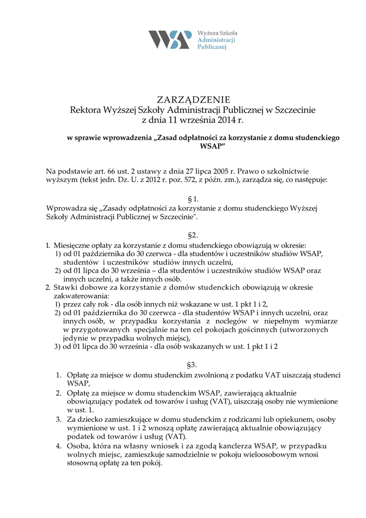 ZARZĄDZENIE Rektora Wyższej Szkoły Administracji Publicznej w Szczecinie z dnia 11 września 2014 r. w sprawie wprowadzenia „Zasad odpłatności za korzystanie z domu studenckiego WSAP” Na podstawie art. 66 ust. 2 ustawy z dnia 27 lipca 2005 r. Prawo o szkolnictwie wyższym (tekst jedn. Dz. U. z 2012 r. poz. 572, z późn. zm.), zarządza się, co następuje: § 1. Wprowadza się „Zasady odpłatności za korzystanie z domu studenckiego Wyższej Szkoły Administracji Publicznej w Szczecinie". §2. 1. Miesięczne opłaty za korzystanie z domu studenckiego obowiązują w okresie: 1) od 01 października do 30 czerwca - dla studentów i uczestników studiów WSAP, studentów i uczestników studiów innych uczelni, 2) od 01 lipca do 30 września – dla studentów i uczestników studiów WSAP oraz innych uczelni, a także innych osób. 2. Stawki dobowe za korzystanie z domów studenckich obowiązują w okresie zakwaterowania: 1) przez cały rok - dla osób innych niż wskazane w ust. 1 pkt 1 i 2, 2) od 01 października do 30 czerwca - dla studentów WSAP i innych uczelni, oraz innych osób, w przypadku korzystania z noclegów w niepełnym wymiarze w przygotowanych specjalnie na ten cel pokojach gościnnych (utworzonych jedynie w przypadku wolnych miejsc), 3) od 01 lipca do 30 września - dla osób wskazanych w ust. 1 pkt 1 i 2 1. 2. 3. 4. §3. Opłatę za miejsce w domu studenckim zwolnioną z podatku VAT uiszczają studenci WSAP, Opłatę za miejsce w domu studenckim WSAP, zawierającą aktualnie obowiązujący podatek od towarów i usług (VAT), uiszczają osoby nie wymienione w ust. 1. Za dziecko zamieszkujące w domu studenckim z rodzicami lub opiekunem, osoby wymienione w ust. 1 i 2 wnoszą opłatę zawierającą aktualnie obowiązujący podatek od towarów i usług (VAT). Osoba, która na własny wniosek i za zgodą kanclerza WSAP, w przypadku wolnych miejsc, zamieszkuje samodzielnie w pokoju wieloosobowym wnosi stosowną opłatę za ten pokój. §4. Wysokości odpłatności miesięcznej i dobowej za korzystanie miejsc w domu studenckim WSAP podawane są odrębnymi komunikatami rektora. §5. Dopuszcza się stosowanie preferencyjnych opłat dobowych (rabatu), m.in. w przypadku zakwaterowania osób na podstawie umów z WSAP, zaproszeń do współpracy, konferencji, szkoleń, kwaterowania grup (powyżej 10 osób), cyklicznego korzystania z noclegów itp. §6. 1. Mieszkańcy domu studenckiego wnoszą opłaty za mieszkanie do 10 dnia każdego rozpoczętego miesiąca zamieszkiwania przelewem na rachunek bankowy WSAP lub bezpośrednio w recepcji. 2. Osoby inne niż wskazane w ust. 1, zamieszkujące w domu studenckim okazjonalnie, na zasadach dobowych, wnoszą opłatę w gotówce bezpośrednio podczas meldowania 3. Mieszkańcy wyprowadzający się z domu studenckiego zobligowani są do uregulowania wszystkich zobowiązań najpóźniej na 3 dni robocze przed planowanym terminem wykwaterowania. 4. Wysokość opłat za korzystanie z domu studenckiego (na zasadach innych niż dobowe) wynosi odpowiednio: 1) połowę stawki miesięcznej w przypadku wykwaterowania się do 15. dnia danego miesiąca 2) pełną stawkę miesięczną w przypadku wykwaterowania po 15. dniu danego miesiąca, 3) pełną stawkę miesięczną w przypadku zakwaterowania i wykwaterowania się w tym samym miesiącu (za wyjątkiem osób, które zadeklarowały chęć zamieszkania na kilka dni na zasadach odpłatności dobowej w pokojach gościnnych). 5. W przypadku otrzymania miejsca w DS w trakcie roku akademickiego student lub inna osoba uiszcza opłatę, o której mowa w § 2, od dnia zakwaterowania, proporcjonalnie do opłaty miesięcznej. W przypadku zakwaterowania i wykwaterowania w tym samym miesiącu obowiązuje stawka, o której mowa w ust. 6 pkt 4. 6. Minimalny czas, na jaki podpisuje się umowę z mieszkańcem domu studenckiego wynosi 3 miesiące. W przypadku wcześniejszego wykwaterowania, przed upływem trzech miesięcy, obowiązuje opłata minimum za dwa miesiące. Okres wypowiedzenia umowy najmu miejsca w domu studenckim wynosi miesiąc, ze skutkiem na koniec miesiąca kalendarzowego. §7. 1. W przypadku opóźnienia w uiszczaniu opłat za korzystanie z DS naliczane będą odsetki ustawowe. 2. W przypadku zalegania z opłatą za korzystanie z domu studenckiego WSAP, prawo do zamieszkania w domu studenckim tracą odpowiednio: 1) student WSAP za 2 miesiące, 2) student innej uczelni, uczeń - za 1 miesiąc. §8. Zarządzenie wchodzi w życie z dniem podpisania. Rektor Dr Magdalena Fiternicka - Gorzko