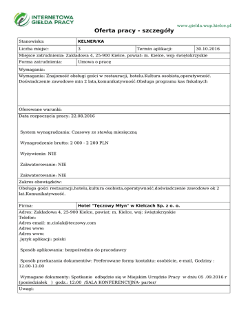 Oferta pracy - szczegóły Stanowisko: KELNER/KA Liczba miejsc: 3 www.gielda.wup.kielce.pl Termin aplikacji: 30.10.2016 Miejsce zatrudnienia: Zakładowa 4, 25-900 Kielce, powiat: m. Kielce, woj: świętokrzyskie Forma zatrudnienia: Umowa o pracę Wymagania: Wymagania: Znajomość obsługi gości w restauracji, hotelu.Kultura osobista,operatywność. Doświadczenie zawodowe min 2 lata,komunikatywność.Obsługa programu kas fiskalnych Oferowane warunki: Data rozpoczęcia pracy: 22.08.2016 System wynagradzania: Czasowy ze stawką miesięczną Wynagrodzenie brutto: 2 000 - 2 200 PLN Wyżywienie: NIE Zakwaterowanie: NIE Zakwaterowanie: NIE Zakres obowiązków: Obsługa gości restauracji,hotelu,kultura osobista,operatywność,doświadczenie zawodowe ok 2 lat.Komunikatywność. Firma: Hotel "Tęczowy Młyn" w Kielcach Sp. z o. o. Adres: Zakładowa 4, 25-900 Kielce, powiat: m. Kielce, woj: świętokrzyskie Telefon: Adres email: [email protected] Adres www: Adres www: Język aplikacji: polski Sposób aplikowania: bezpośrednio do pracodawcy Sposób przekazania dokumentów: Preferowane formy kontaktu: osobiście, e-mail, Godziny : 12.00-13.00 Wymagane dokumenty: Spotkanie odbędzie się w Miejskim Urzędzie Pracy w dniu 05 .09.2016 r (poniedziałek ) godz.: 12:00 /SALA KONFERENCYJNA- parter/ Uwagi: Identyfikator oferty: StPr/16/3310 Instytucja koordynująca ofertę: Miejski Urząd Pracy w Kielcach Urząd Pracy dokłada wszelkich starań, aby oferty pracy będące w zasobach urzędu, były rzetelne i wiarygodne. Ponieważ wszystkie oferty pracy pochodzą od osób trzecich Urząd Pracy zastrzega, że odpowiedzialność za ewentualne rozbieżności pomiędzy warunkami pracy zaprezentowanymi w niniejszej ofercie a warunkami zaproponowanymi przez potencjalnego pracodawcę ponosi pracodawca.