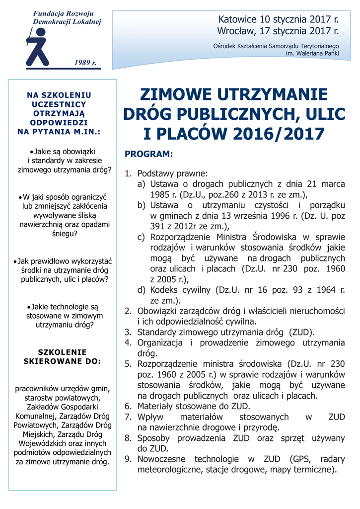10 stycznia 2017 r. RozwiązaniaKatowice informatyczne Wrocław, 17 stycznia 2017 r. Ośrodek Kształcenia Samorządu Terytorialnego im. Waleriana Pańki NA SZKOLENIU UCZESTNICY OTRZYMAJĄ ODPOWIEDZI NA PYTANIA M.IN.: Jakie są obowiązki i standardy w zakresie zimowego utrzymania dróg? W jaki sposób ograniczyć lub zmniejszyć zakłócenia wywoływane śliską nawierzchnią oraz opadami śniegu? Jak prawidłowo wykorzystać środki na utrzymanie dróg publicznych, ulic i placów? Jakie technologie są stosowane w zimowym utrzymaniu dróg? SZKOL ENIE SKIEROWANE DO: pracowników urzędów gmin, starostw powiatowych, Zakładów Gospodarki Komunalnej, Zarządów Dróg Powiatowych, Zarządów Dróg Miejskich, Zarządu Dróg Wojewódzkich oraz innych podmiotów odpowiedzialnych za zimowe utrzymanie dróg. ZIMOWE UTRZYMANIE DRÓG PUBLICZNYCH, ULIC I PLACÓW 2016/2017 PROGRAM: 1. Podstawy prawne: a) Ustawa o drogach publicznych z dnia 21 marca 1985 r. (Dz.U., poz.260 z 2013 r. ze zm.), b) Ustawa o utrzymaniu czystości i porządku w gminach z dnia 13 września 1996 r. (Dz. U. poz 391 z 2012r ze zm.), c) Rozporządzenie Ministra Środowiska w sprawie rodzajów i warunków stosowania środków jakie mogą być używane na drogach publicznych oraz ulicach i placach (Dz.U. nr 230 poz. 1960 z 2005 r.), d) Kodeks cywilny (Dz.U. nr 16 poz. 93 z 1964 r. ze zm.). 2. Obowiązki zarządców dróg i właścicieli nieruchomości i ich odpowiedzialność cywilna. 3. Standardy zimowego utrzymania dróg (ZUD). 4. Organizacja i prowadzenie zimowego utrzymania dróg. 5. Rozporządzenie ministra środowiska (Dz.U. nr 230 poz. 1960 z 2005 r.) w sprawie rodzajów i warunków stosowania środków, jakie mogą być używane na drogach publicznych oraz ulicach i placach. 6. Materiały stosowane do ZUD. 7. Wpływ materiałów stosowanych w ZUD na nawierzchnie drogowe i przyrodę. 8. Sposoby prowadzenia ZUD oraz sprzęt używany do ZUD. 9. Nowoczesne technologie w ZUD (GPS, radary meteorologiczne, stacje drogowe, mapy termiczne). DANE DO KONTAKTU: Ośrodek Kształcenia Samorządu Terytorialnego im. Waleriana Pańki 40-014 Katowice ul. Mariacka 1 NIP: 522-000-18-95 Tel 32 259 86 73, 32 253 84 09 Fax. 32 259 86 73 w. 22, 26 e-mail: [email protected] www.okst.pl OSOBA DO KONTAKTU: Renata Bąk tel. 32 206 80 39, 32 206 98 43 w. 24 [email protected] KOD SZKOLENIA (proszę zaznaczyć właściwy) Nazwa nabywcy (dane do faktury) Adres nabywcy (ulica, nr domu, kod pocztowy, miejscowość) NIP MIEJSCE SZKOLENIA: Katowice, siedziba Ośrodka, ul. Mariacka 1, II Piętro Wrocław, siedziba Ośrodka, ul. Piłsudskiego 49 – 57, III piętro Mapkę dojazdu do miejsca szkolenia znajdą Państwo na www.okst.pl/dojazd. TERMIN SZKOLENIA: Katowice, 10 stycznia 2017 r., godz. 10.00 – 15.00. Wrocław, 17 stycznia 2017 r., godz. 10.00 – 15.00. CENA: 339 zł netto/os. Udział w szkoleniu zwolniony z VAT w przypadku finansowania szkolenia ze środków publicznych. Cena zawiera materiały szkoleniowe, zaświadczenie o ukończeniu szkolenia, poczęstunek i serwis kawowy. ZGŁOSZENIA: Wypełnioną kartę zgłoszenia należy przesłać mailem, faksem lub poprzez formularz na www.okst.pl do 6 stycznia 2017 r. . (Katowice) i do 12 stycznia 2017 r. (Wrocław). ☐ Katowice 116/17/B ☐ Wrocław 117/17D/B Telefon Email 1. Imię i nazwisko uczestnika, stanowisko 2. Imię i nazwisko uczestnika, stanowisko 3. Imię i nazwisko uczestnika, stanowisko Oświadczam, że szkolenie dla ww. pracowników jest kształceniem zawodowym finansowanym w całości lub co najmniej 70% ze środków publicznych (proszę zaznaczyć właściwe) Członek FORUM (proszę zaznaczyć właściwe) UWAGA Ilość miejsc ograniczona. O udziale w szkoleniu decyduje kolejność zgłoszeń. Zgłoszenie na szkolenie musi zostać potwierdzone przesłaniem do Ośrodka karty zgłoszenia (mail, fax lub formularz na www.okst.pl). Brak pisemnej rezygnacji ze szkolenia najpóźniej na trzy dni robocze przed terminem szkolenia będzie równoznaczny z obciążeniem Państwa należnością za to szkolenie niezależnie od przyczyn rezygnacji. Płatność należy uregulować przelewem przed lub po szkoleniu (na przelewie prosimy podać nazwę szkolenia lub jego kod). NR RACHUNKU: BPH: 68-10600076-0000321000197618 TAK ☐ NIE ☐ TAK ☐ NIE ☐ PODPIS